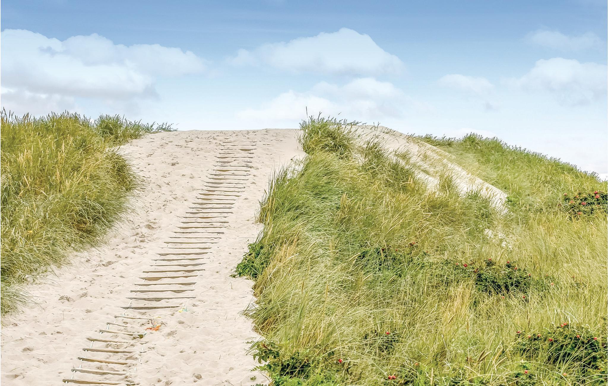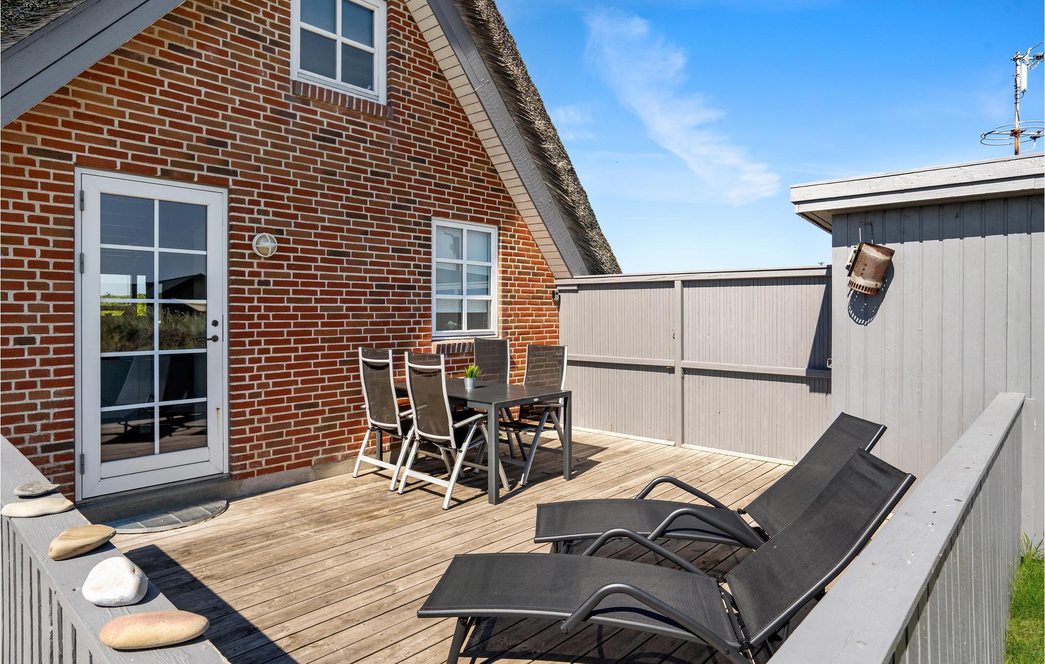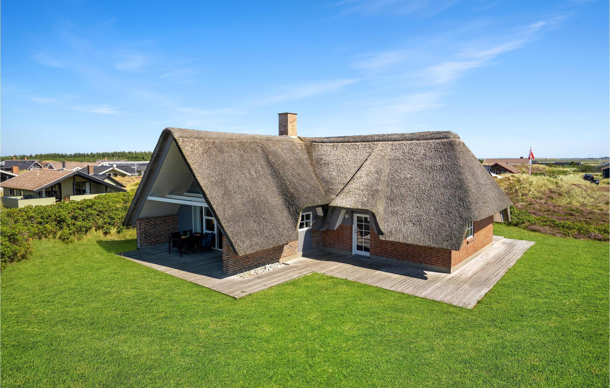Et charmerende stråtækt sommerhus der ligger omgivet af en stor naturgrund kun 300 m fra Vesterhavet i Bjerregård. Huset er virkelig flot, velbygget og velholdt og vedligeholdes konstant, og overalt fremstår det lyst og moderne og ikke mindst hyggeligt. Huset er indrettet med en fin entre, et velindrettet køkken, som er i åben forbindelse med et dejligt opholdsrum, som er kombineret spisestue og stue med brændeovn, med dør ud til en af husets dejlige terrasser og trappe til 1. sal. I stueetagen er der 2 soveværelser med dobbeltsenge, og på 1. sal 1 med 2 enkeltsenge. På 1. sal er der en åben repos og et dejligt soveværelse med to enkeltsenge, herfra er der en skøn udsigt til Ringkøbing Fjord. I huset er der et indbydende badeværelse med bruser, spabad og adgang til sauna, og derudover også et ekstra toilet. Udenfor er der rig mulighed for at finde en hyggekrog med læ på en af husets terrasser, og det tager kun få minutters gang at komme til stranden, hvor I kan tage en svømmetur på en varm sommerdag eller en vandretur langs havet med skumsprøjt og bølgebrus om vinteren og året rundt lade jer betage af uforglemmelige solnedgange. Fra Bjerregård og op langs Holmsland Klit kan I cykle eller vandre på naturstien, som snor sig langs klitterne. Der er også gode muligheder for forskellig slags vandsport på Ringkøbing Fjord, rideture i naturen eller et spil minigolf for hele familien. Den nærmeste by er Hvide Sande, med mange butikker og hyggelige restauranter og cafeer.