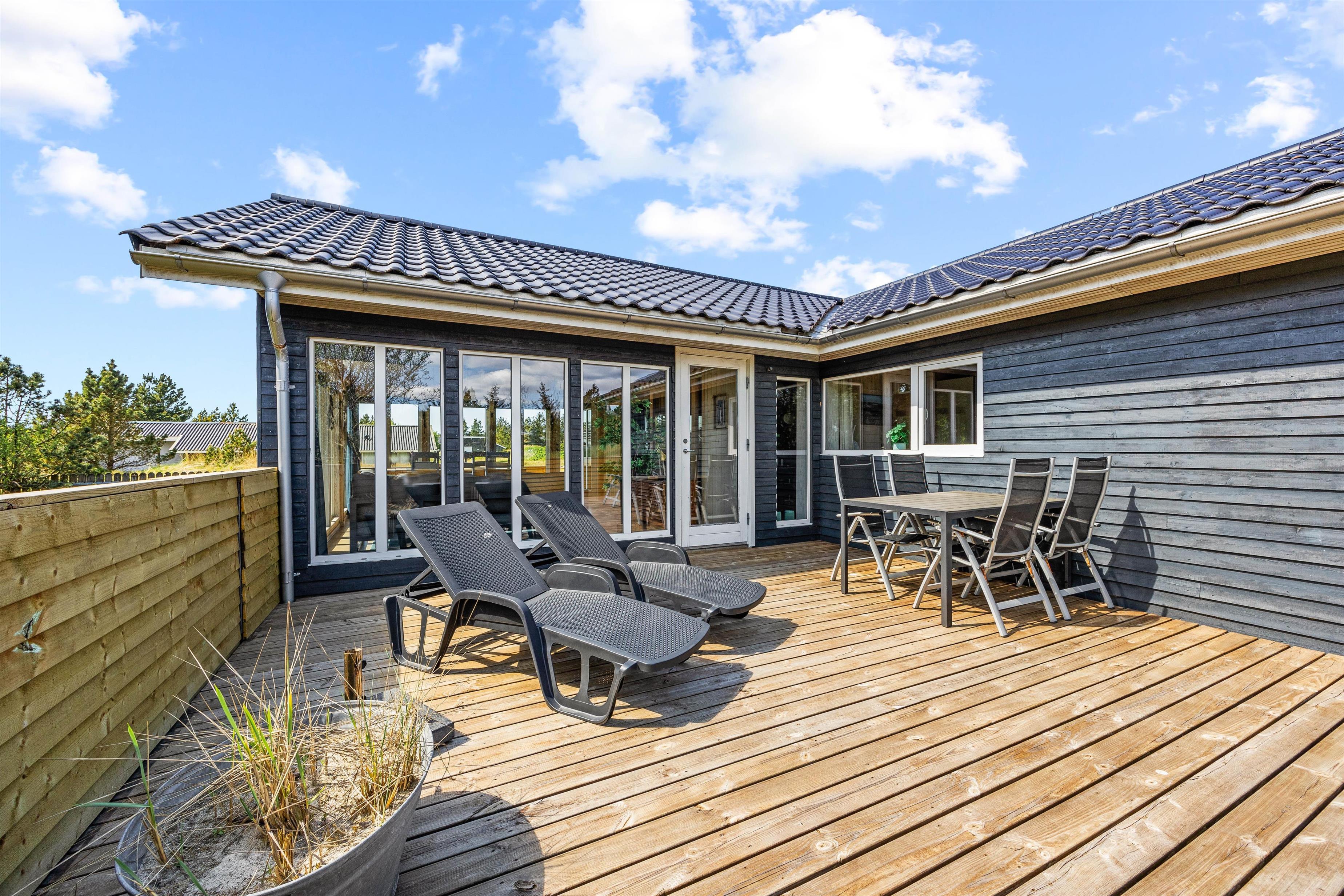 Fra udestuen er der udgang til de lukkede terrasser med mulighed for altid at kunne finde læ. Vestterrassen er delvist overdækket, den øst og sydøst-vendte er noget større og strækker sig på hele sommerhusets bagside. På naturgrunden er der gynge og sandkasse. Den rummelige garage er til disposition.