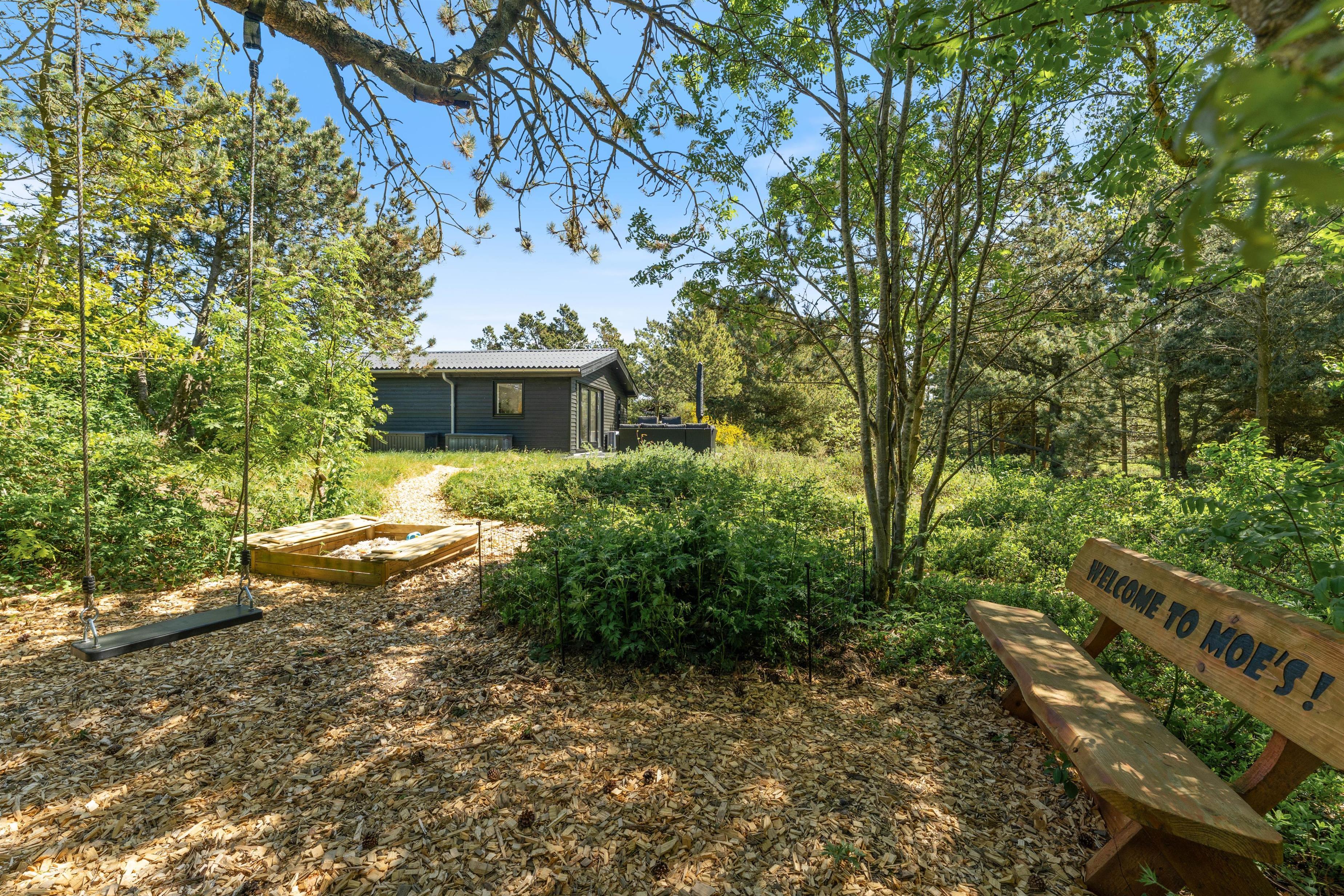 Sommerhuset er bygget på en naturgrund på ca. 1500 m2, som giver plads til leg og afslapning i den friske luft. Imens du læner dig tilbage i en komfortabel liggestol med en kølig drink på den delvist afskærmede terrasse, kan børnene lege i sandkassen, gynge eller gå på opdagelse på grundstykket.