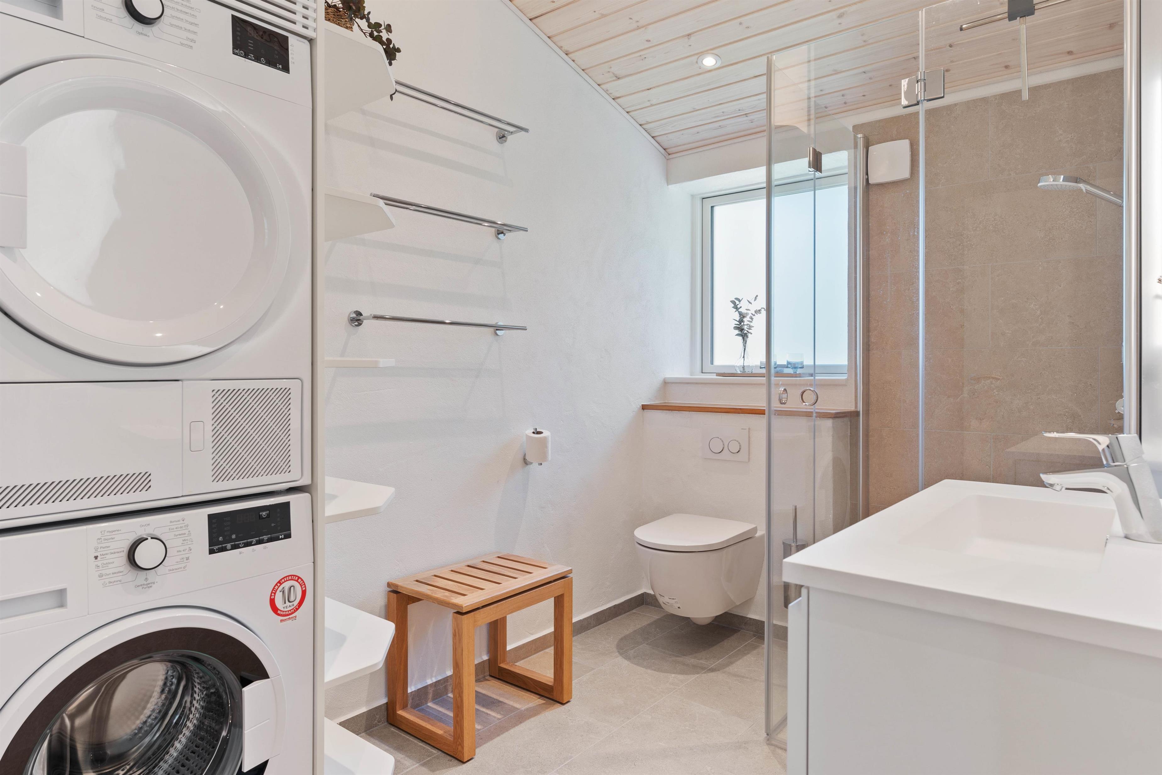 Køkkenafdelingen med kogeø indeholder alt, hvad I skal bruge for at forkæle hinanden med lækre, hjemmelavede måltider. Den separate fryser på 80 liter vil især glæde lystfiskere – her kan nok være en frisk fisk eller to. I køkkenområdet er der endvidere gulvvarme, ligesom på badeværelserne. Sommerhuset har desuden vaskemaskine og tørretumbler.