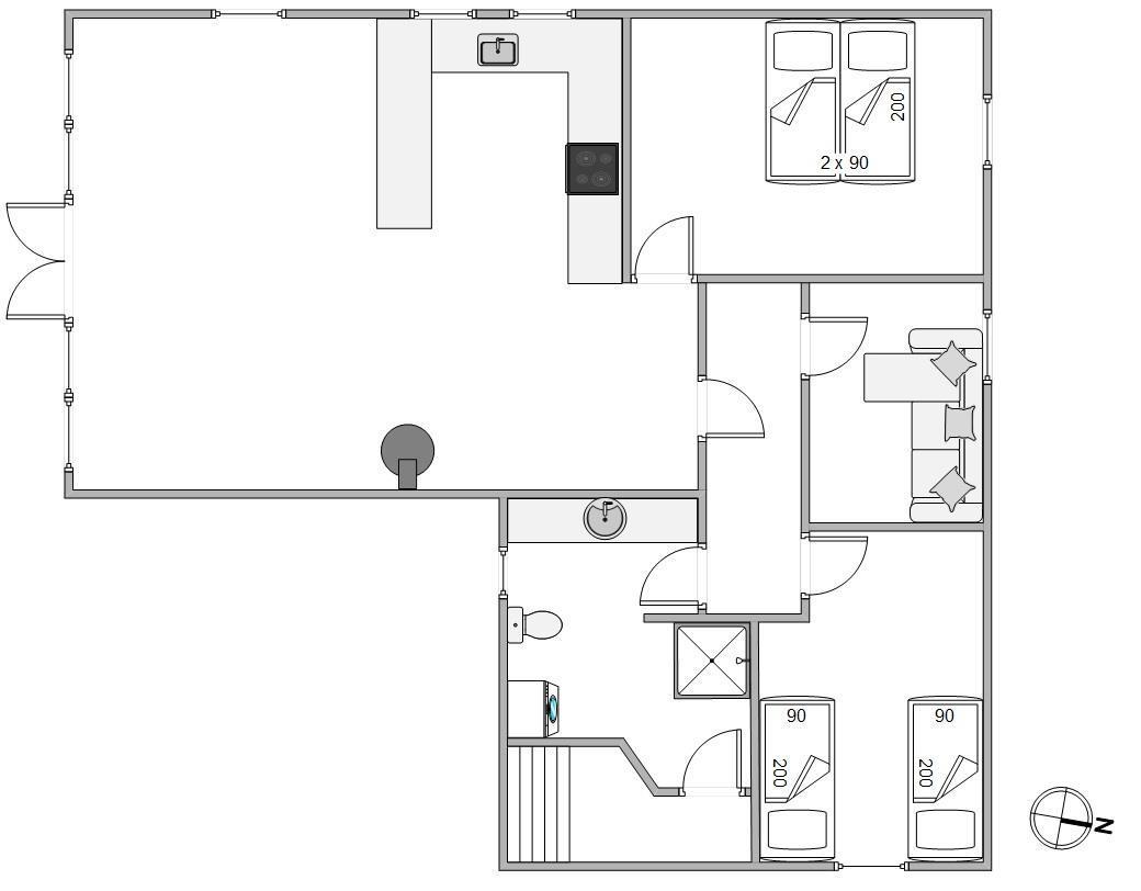 Sommerhuset er perfekt til en familie på 5, fordelt på de 3 soverum, hvoraf et er med dobbeltseng, og de to andre med henholdsvis 1 sovesofa og 2 enkeltsenge.