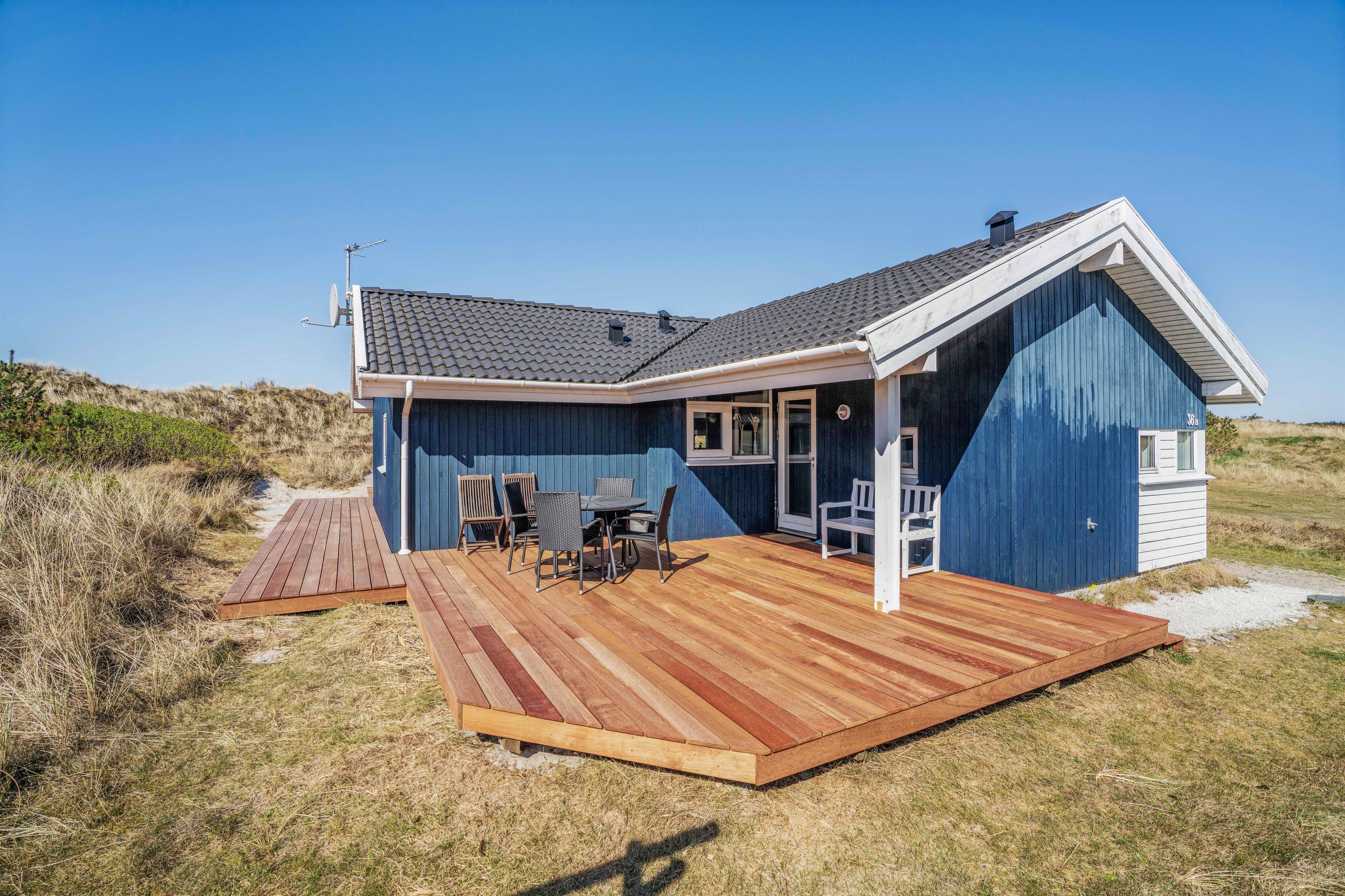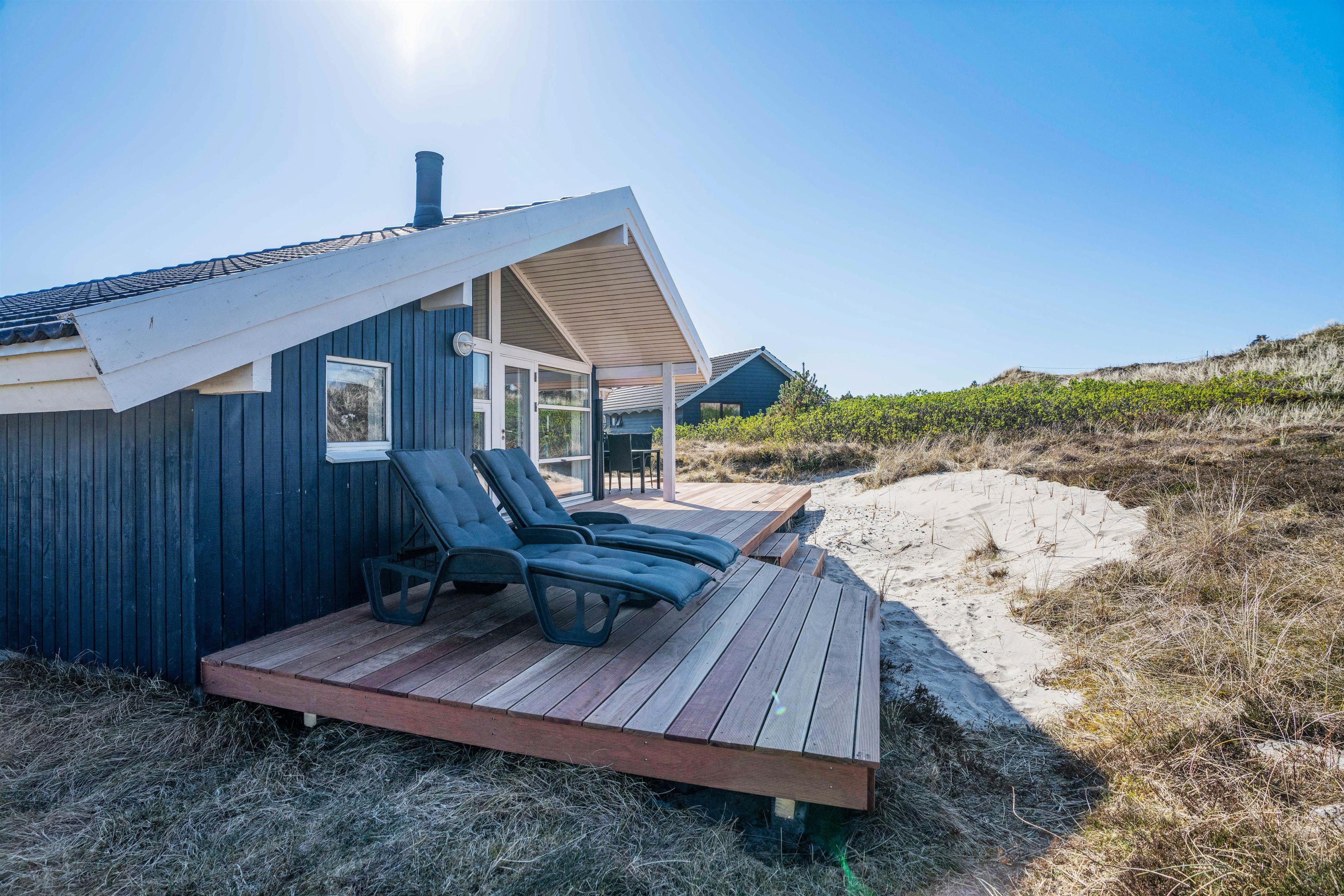 På sommerhusets vestlige side er der endnu en skøn terrasse. Denne er også delvist overdækket og delvist afskærmet mod nord. Herfra er udsigten skøn over det smukke klitlandskab, og Vesterhavet ligger kun 950 meter fra feriehuset.