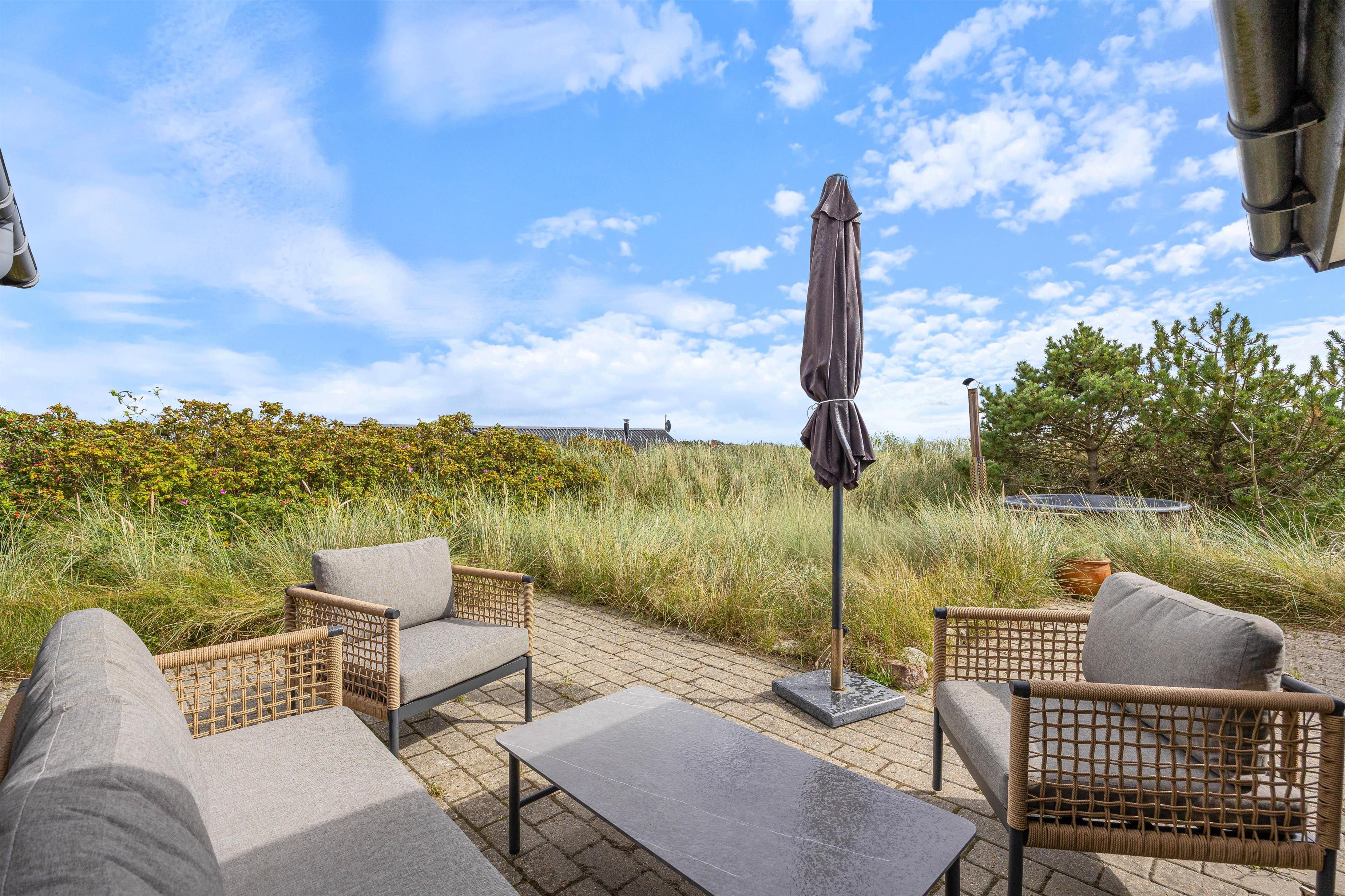 Høje klitbanker rammer sommerhuset ind og gør terrassedagene helt ugenerede, og på toppen er en udkigspost, hvor I kan nyde panoramaudsigten over Bjerregårds elskede ferieland.