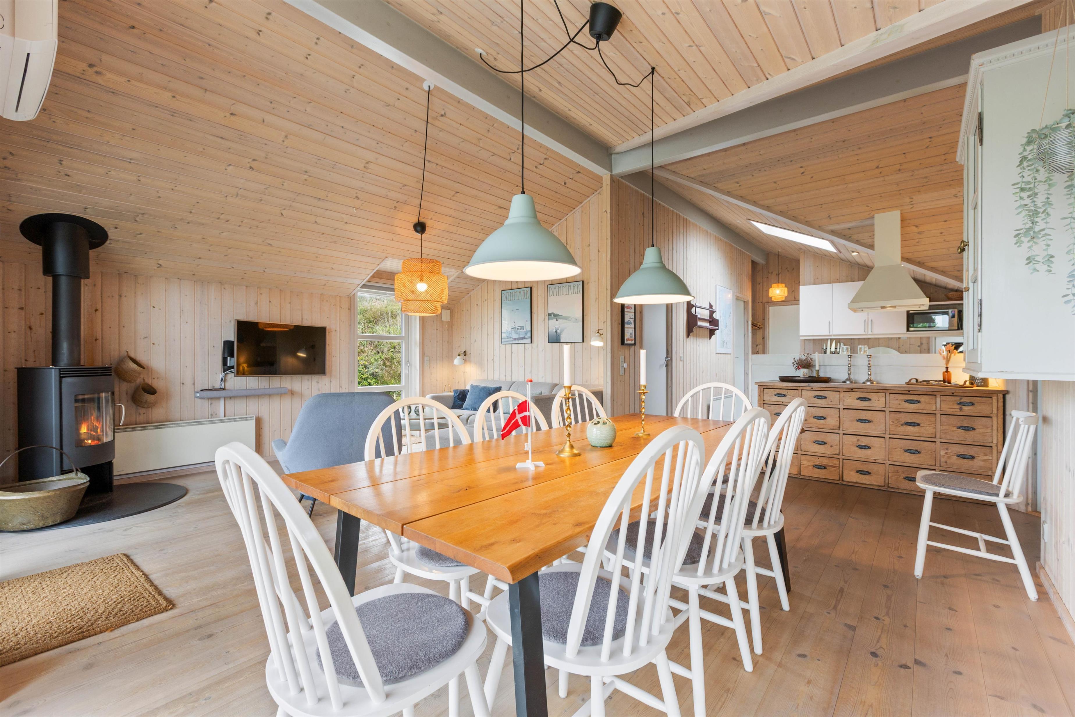 Med brændeovnen i det sammenslåede stue- og køkkenalrum bliver de sene aftener og grå feriedage kun endnu hyggeligere, og har I brug for ekstra varme efter en gåtur langs vandet i den friske havluft, er husets sauna det oplagte valg.