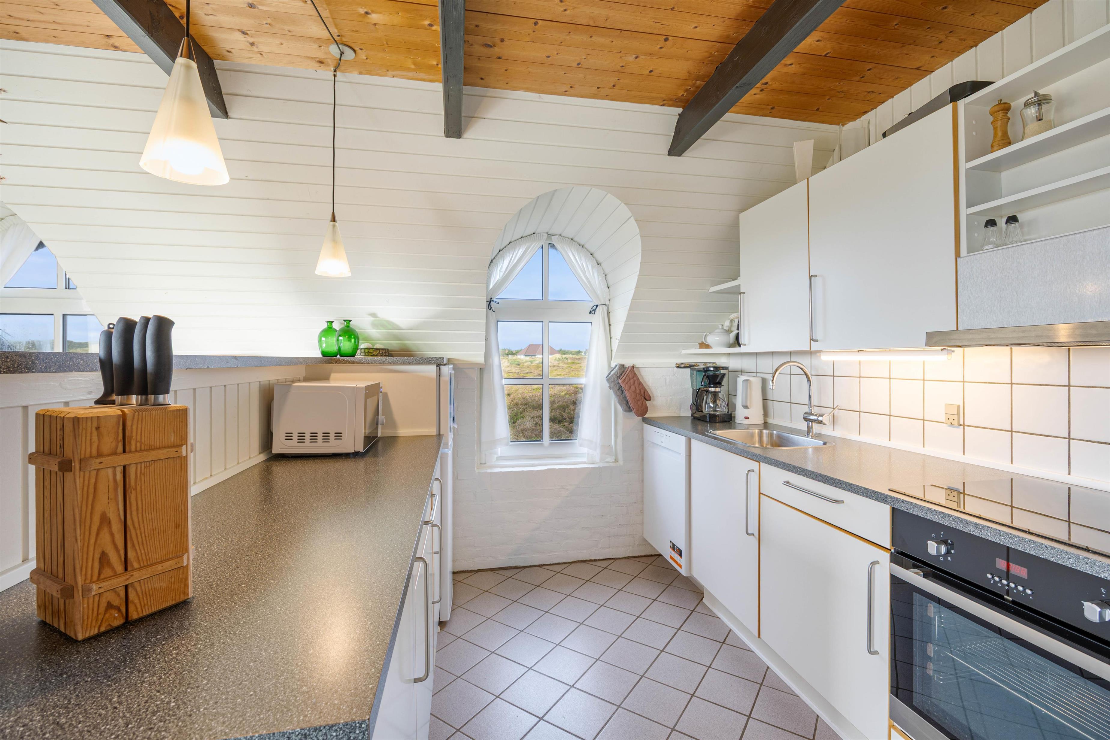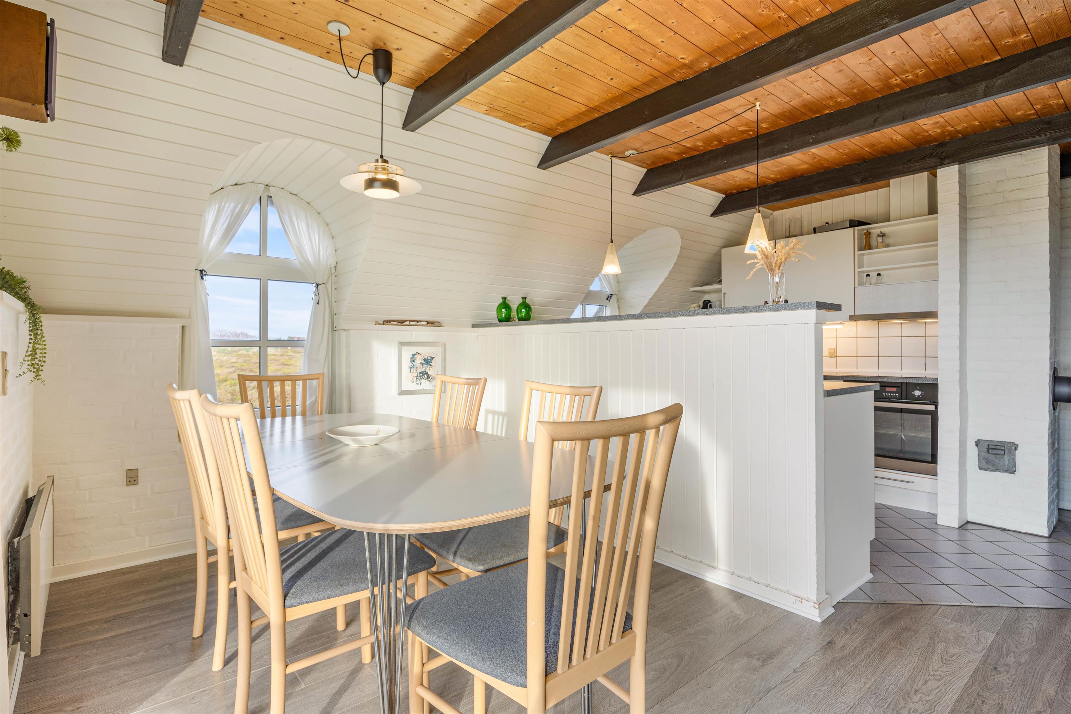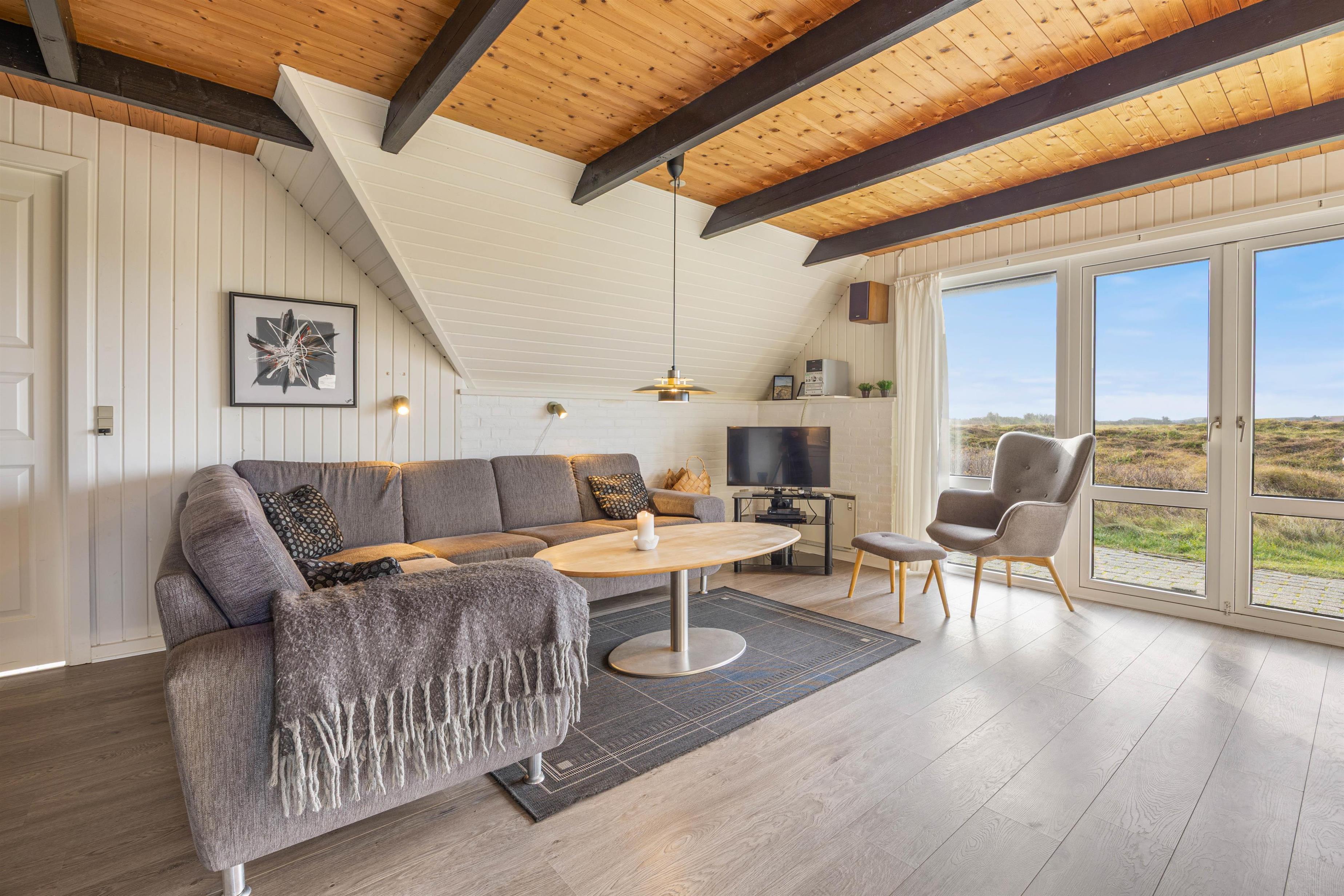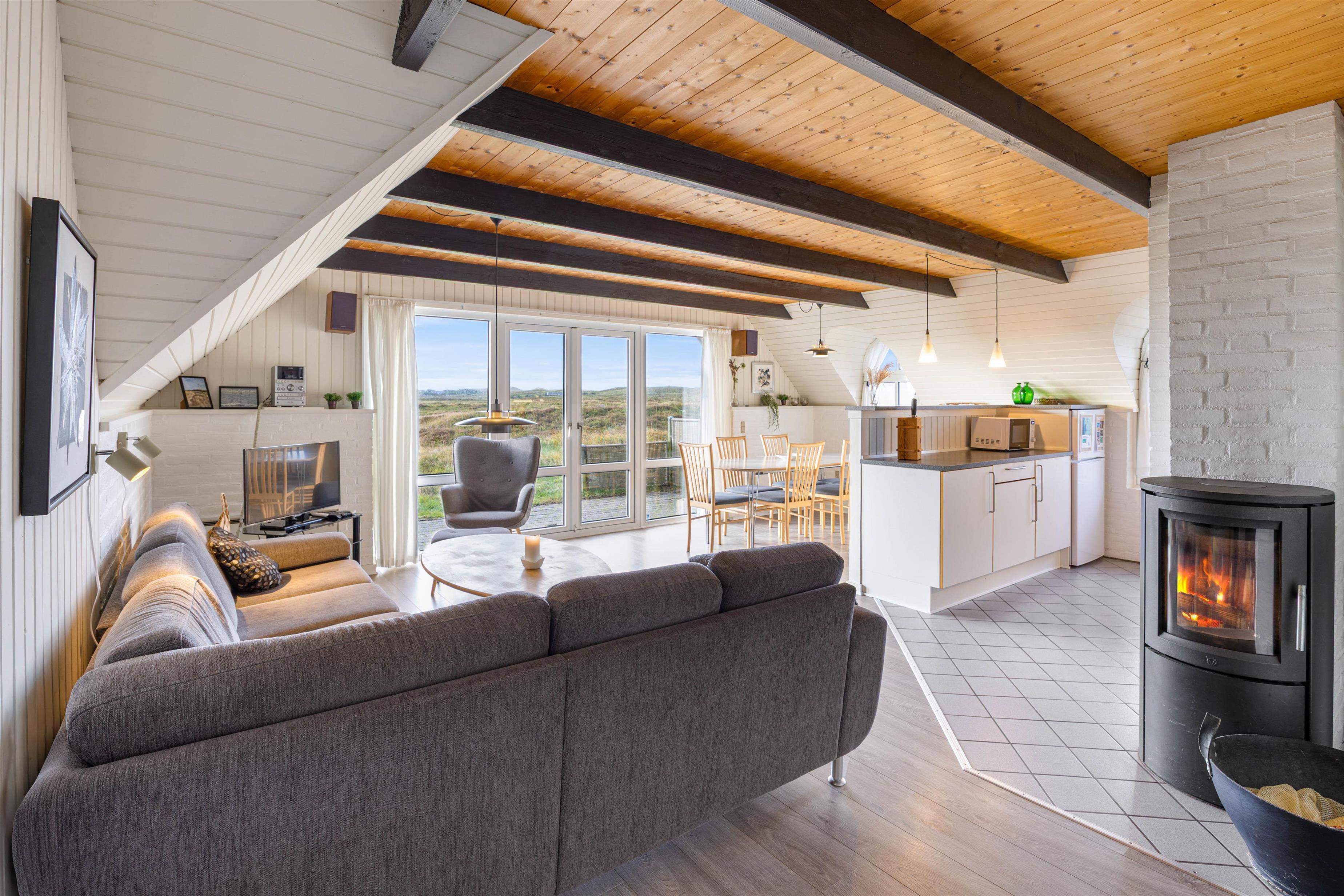 Et dejligt hus, hvor I kan ferien sammen i hyggelige rammer – også sammen med jeres hunde. Feriehusets hjerterum er alrummet, der forener stue og køkken i ét. Her er plads til hygge og samvær med familie og venner, og ikke mindst en smuk udsigt udover klitlandskabet. Tag plads i sofaen, spil brætspil med familien, læs en god bog og nyd en kop kaffe. På de køligere aftener kan I tænde op i brændeovnen, der sørger for den rette feriestemning.
