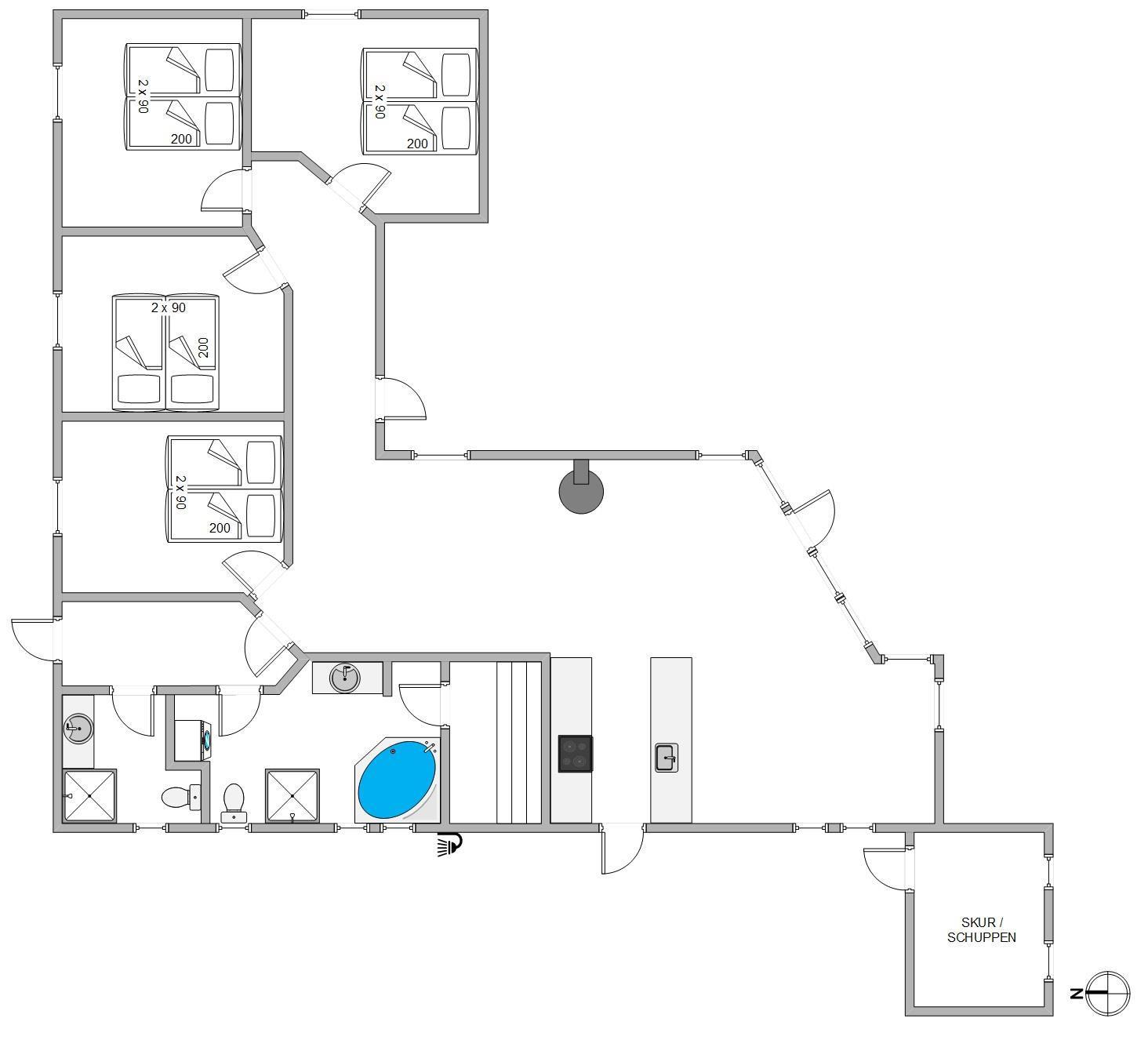 Her på Julianevej 19 ligger der et lyst og rummeligt feriehus, der med sine 4 dobbeltværelser og 2 badeværelser er helt perfekt til 8 personer. Her kan du bare slappe af og nyde ferien med gåture til stranden eller små udflugter i lokalområdet. Du kan også tage plads på den gode terrasse, mens børnene leger på naturgrunden.