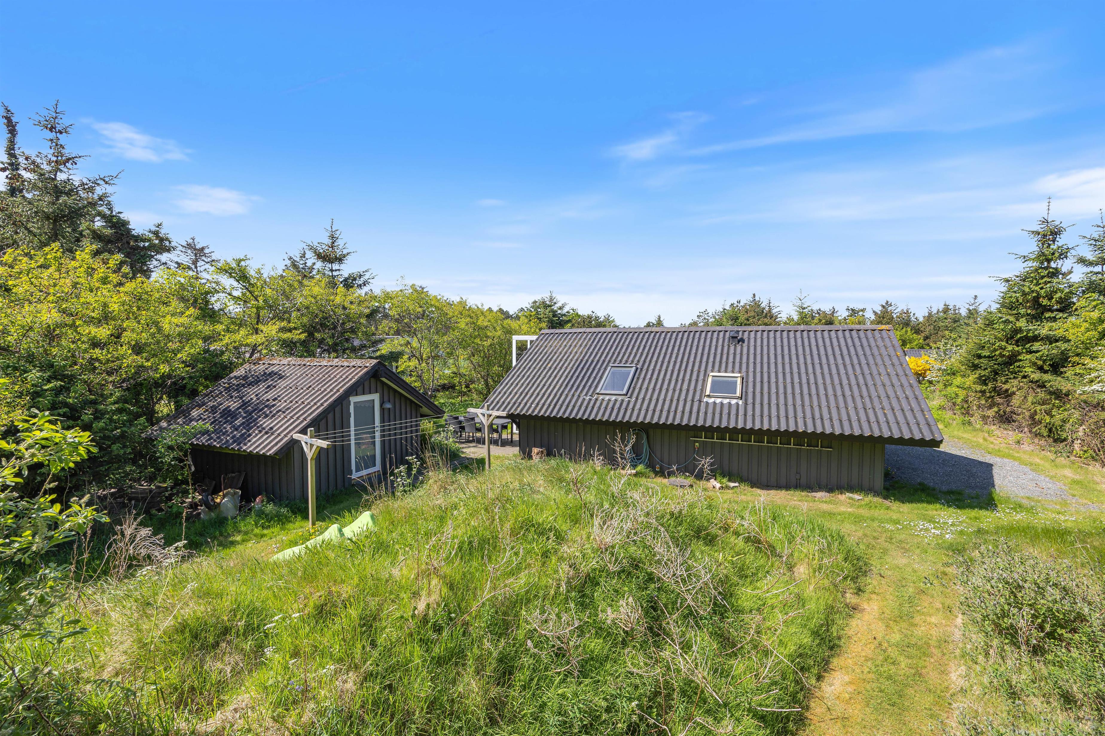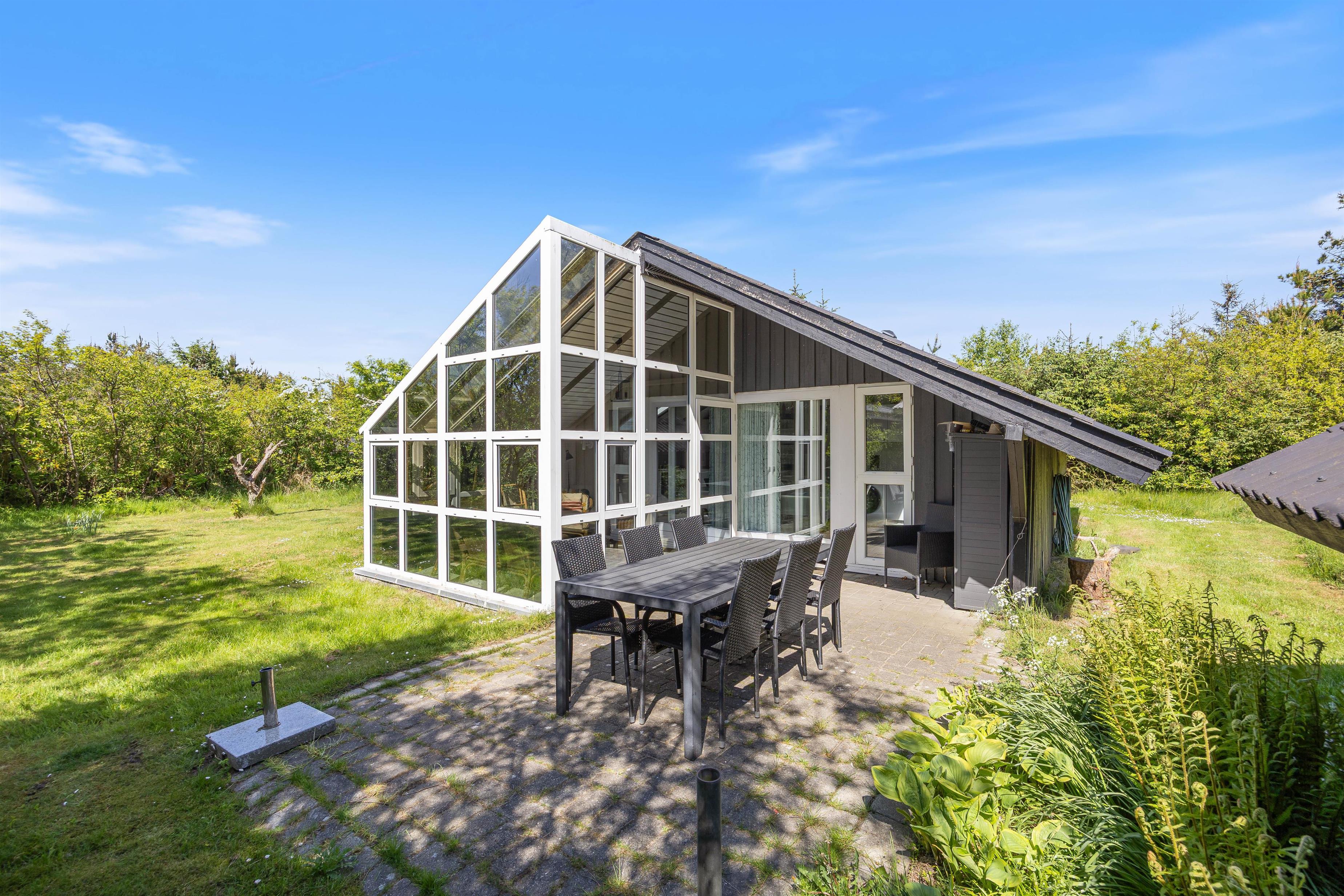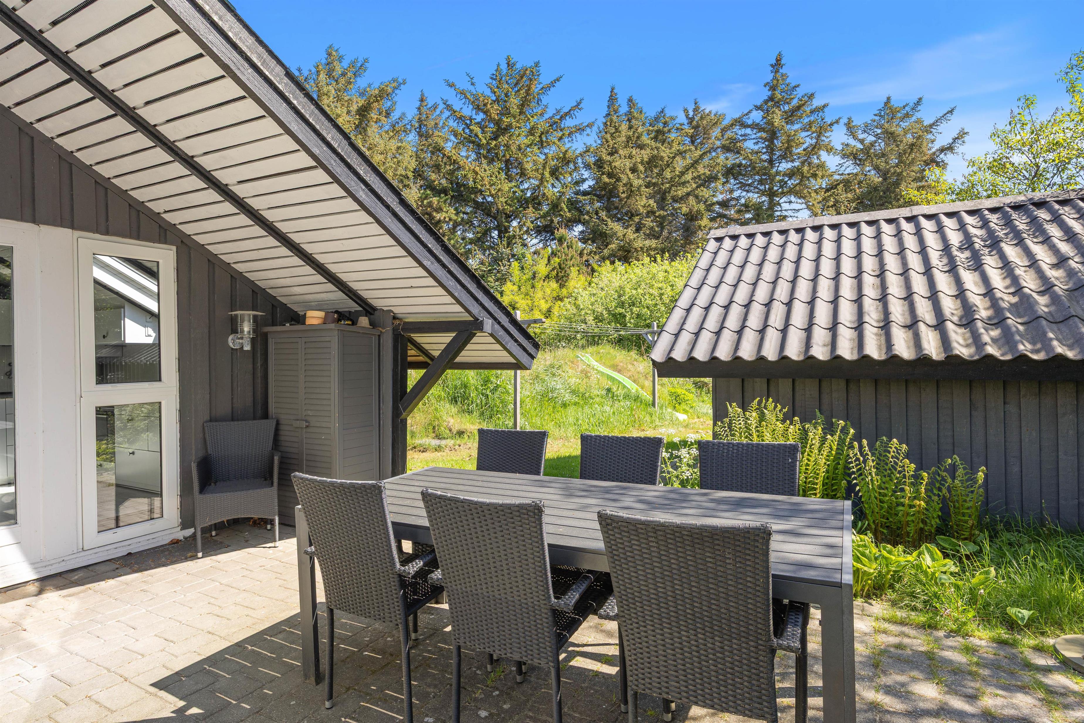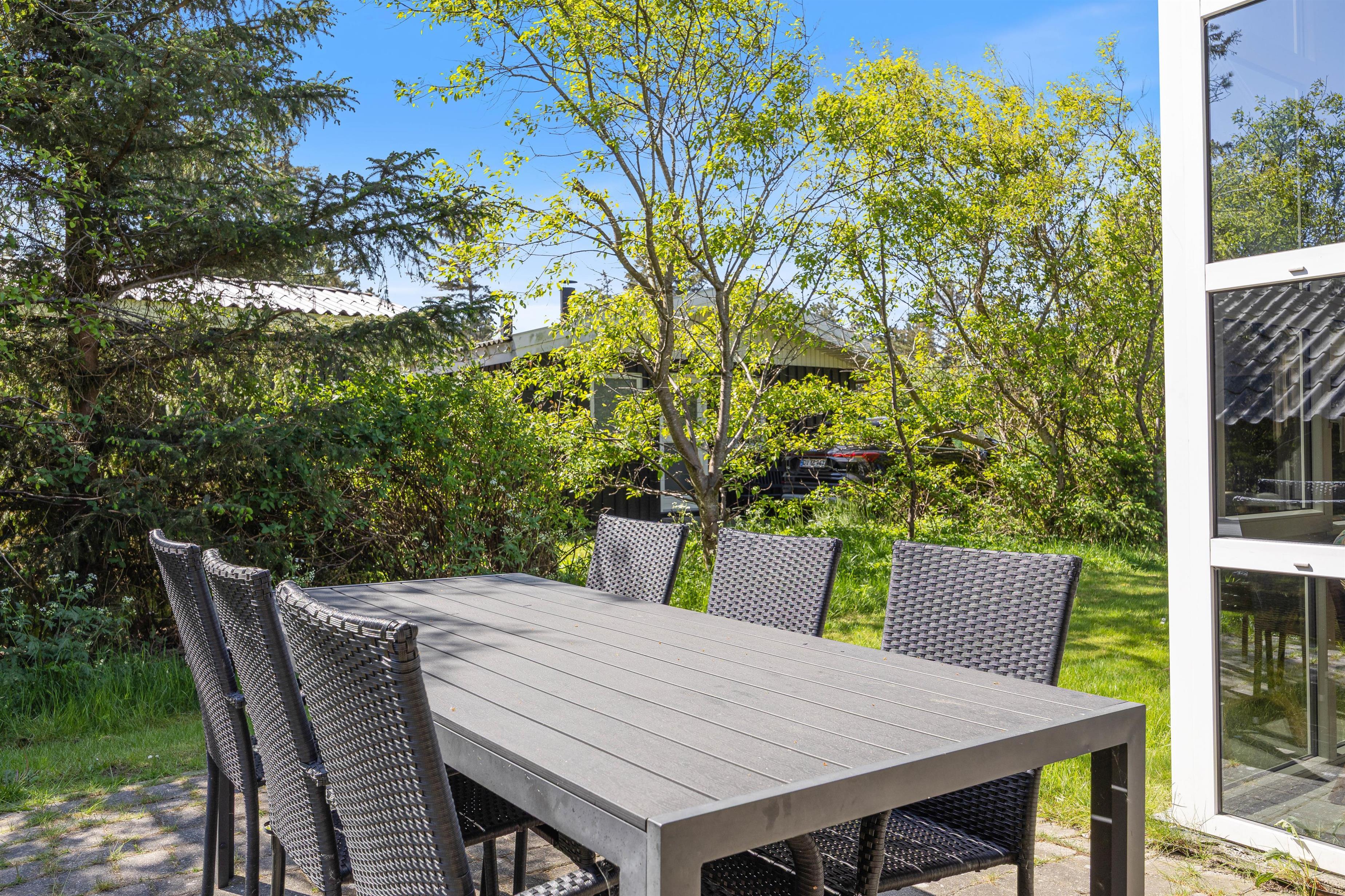 Terrassen er placeret mod syd og er delvist overdækket og afskærmet, hvilket gør den ideel til grillaftener. Sommerhusgrunden er omgivet af træer, som giver en dejlig ro, duft og feriestemning. Her kan I spille boldspil eller lade alle deltage i et vikingespil. Vesterhavet er kun en frisk gåtur væk fra huset, og her er naturligvis gode muligheder for lange og skønne traveture med både børn og hund.