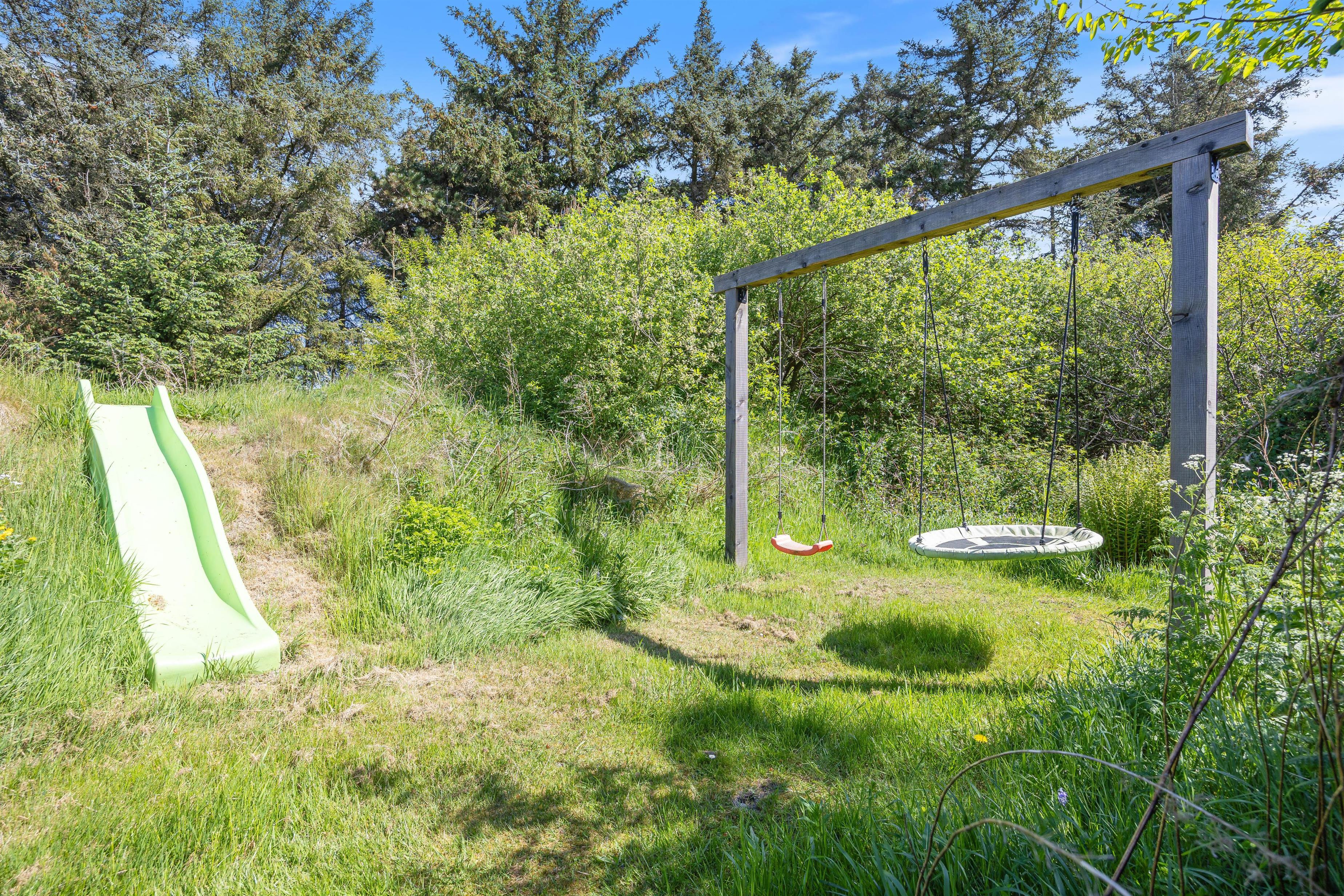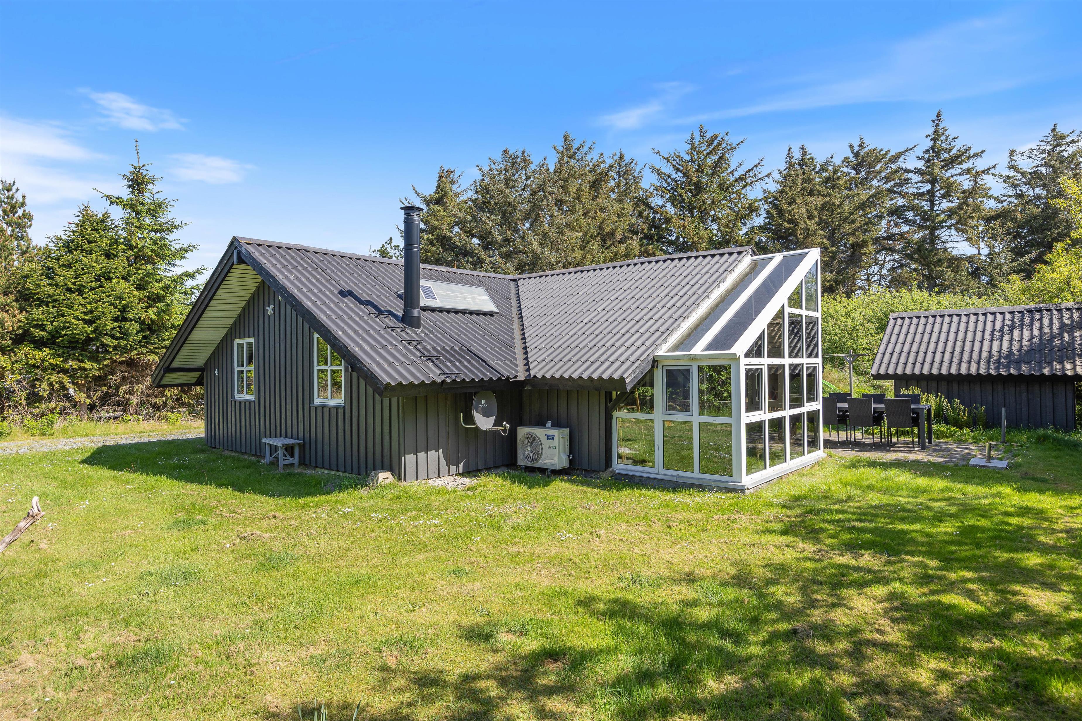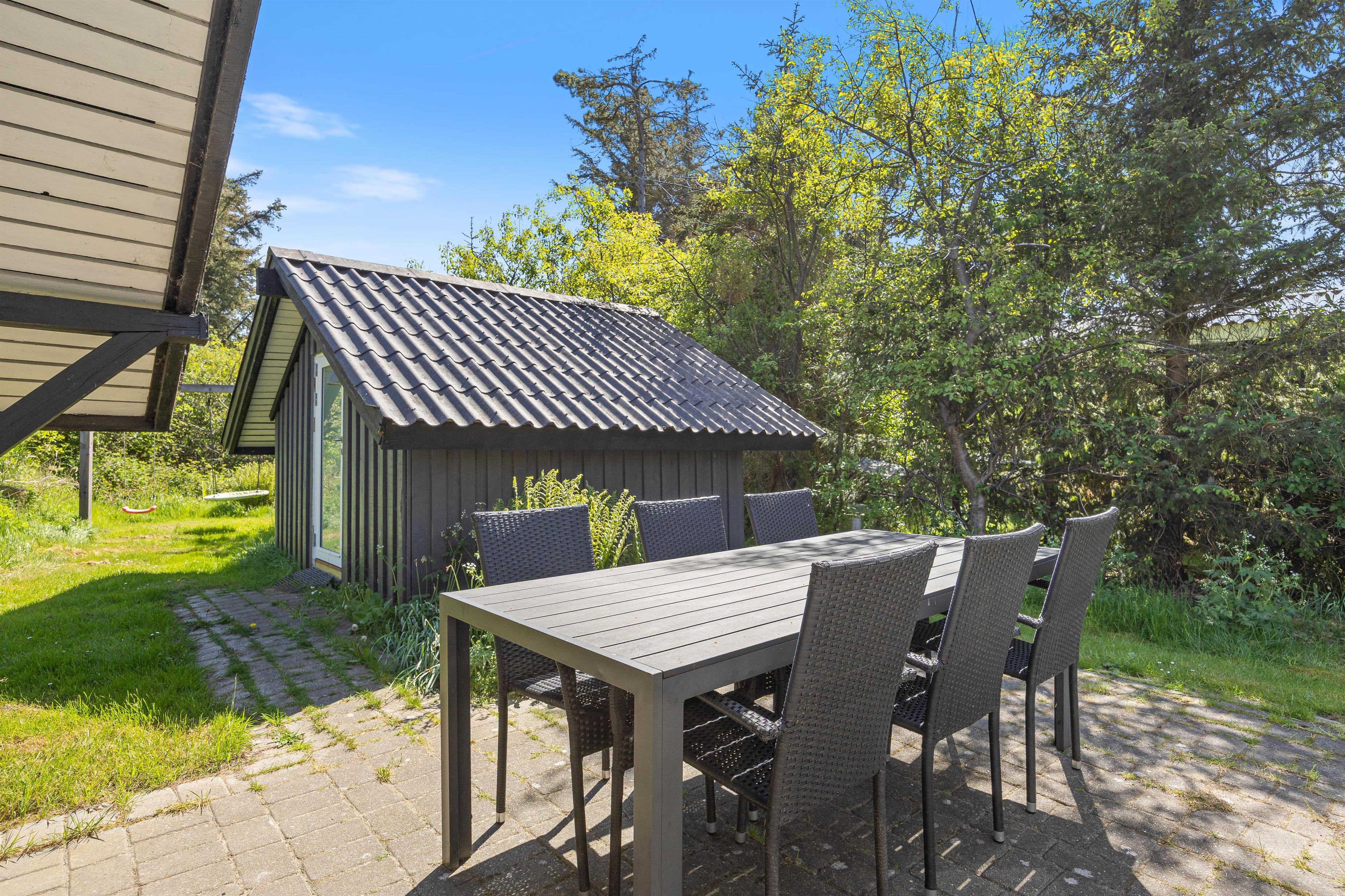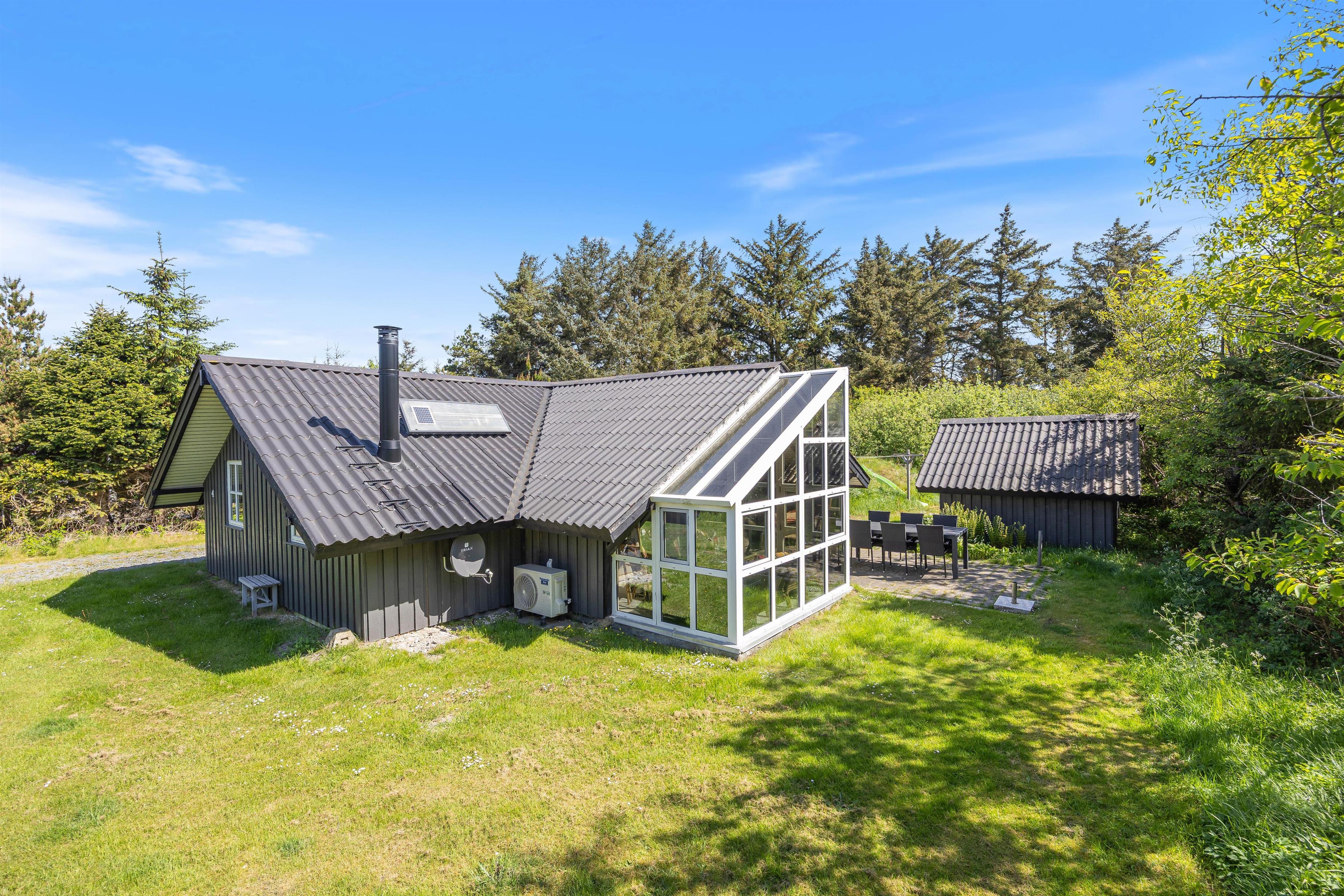 Terrassen er placeret mod syd og er delvist overdækket og afskærmet, hvilket gør den ideel til grillaftener. Sommerhusgrunden er omgivet af træer, som giver en dejlig ro, duft og feriestemning. Her kan I spille boldspil eller lade alle deltage i et vikingespil. Vesterhavet er kun en frisk gåtur væk fra huset, og her er naturligvis gode muligheder for lange og skønne traveture med både børn og hund.