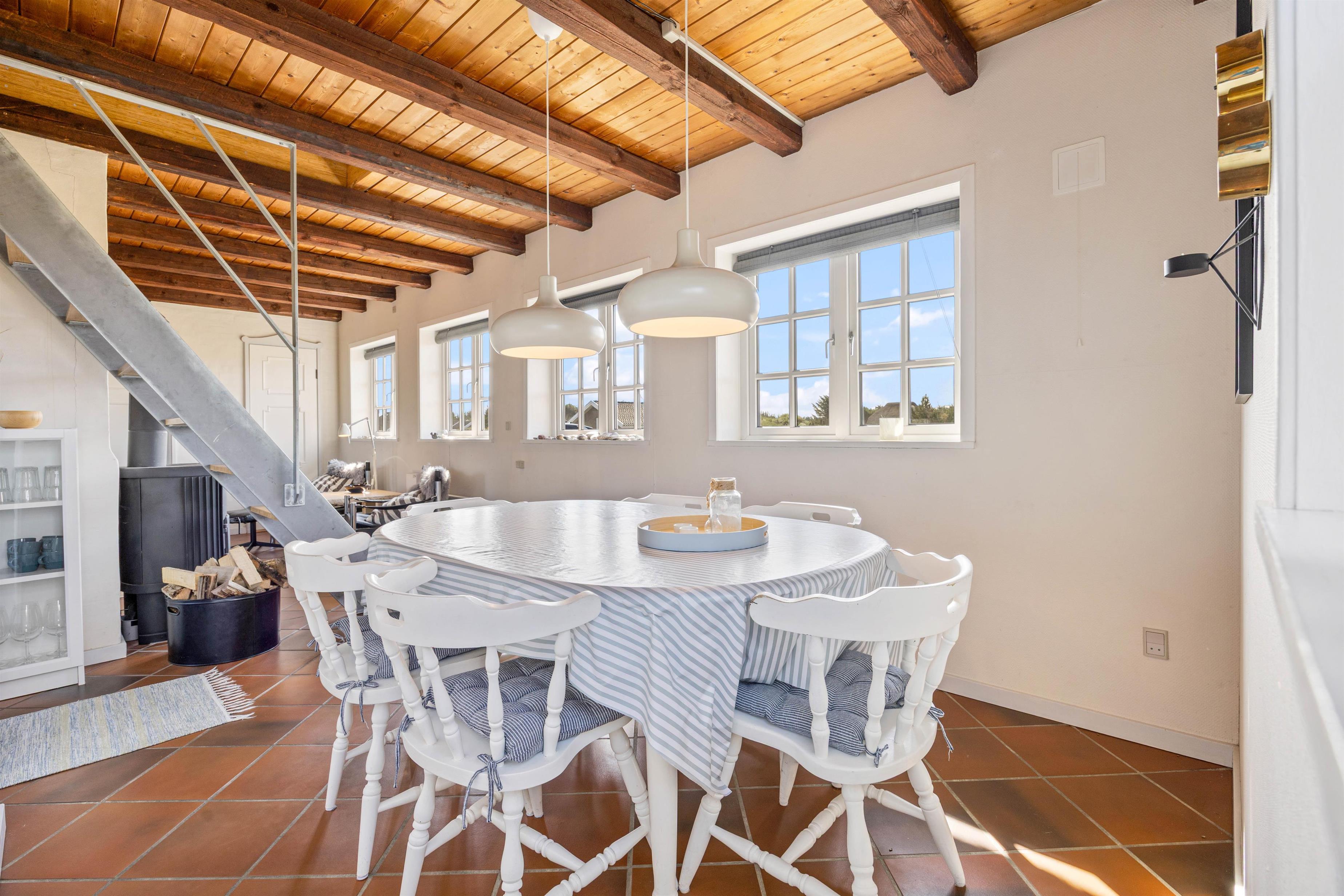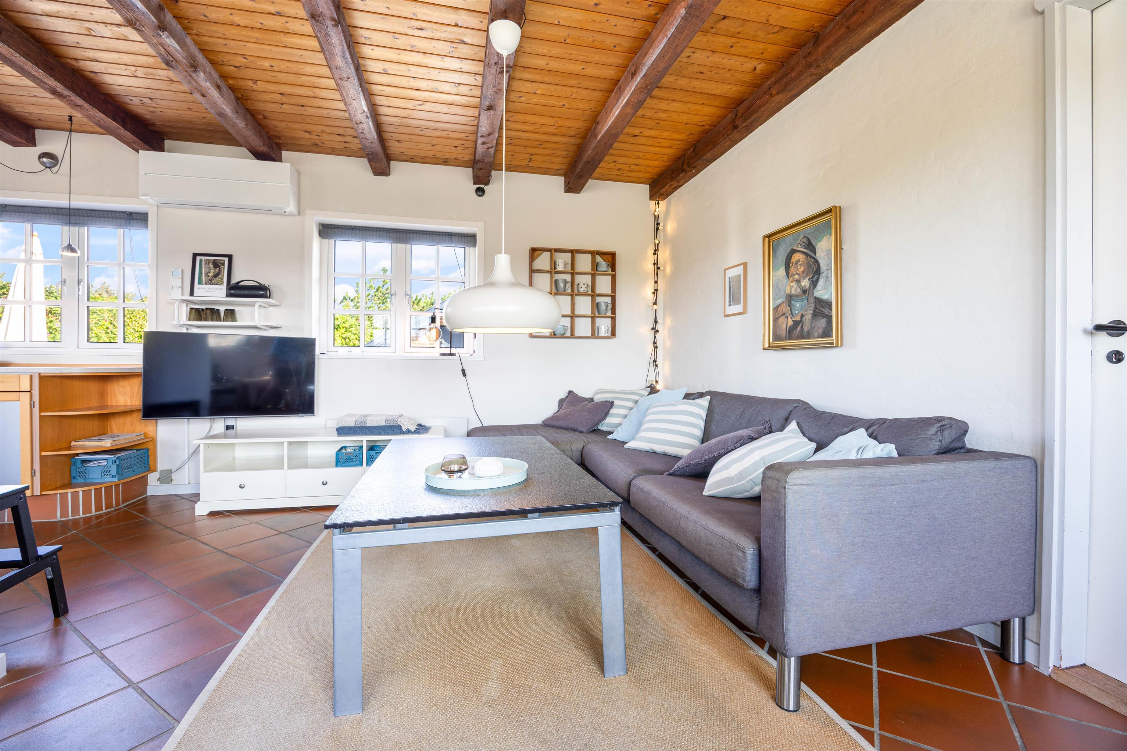 Dette hyggelige sommerhus i gammel dansk stil er venligt og indbydende. I den lyse og åbne opholdsstue med flot træloft og synlige bjælker føler I jer straks velkommen. Den rustikke brændeovn spreder en hyggelig varme, men du kan også bruge den energibesparende varmepumpe til opvarmning, så selv på kolde dage behøver du ikke at fryse.