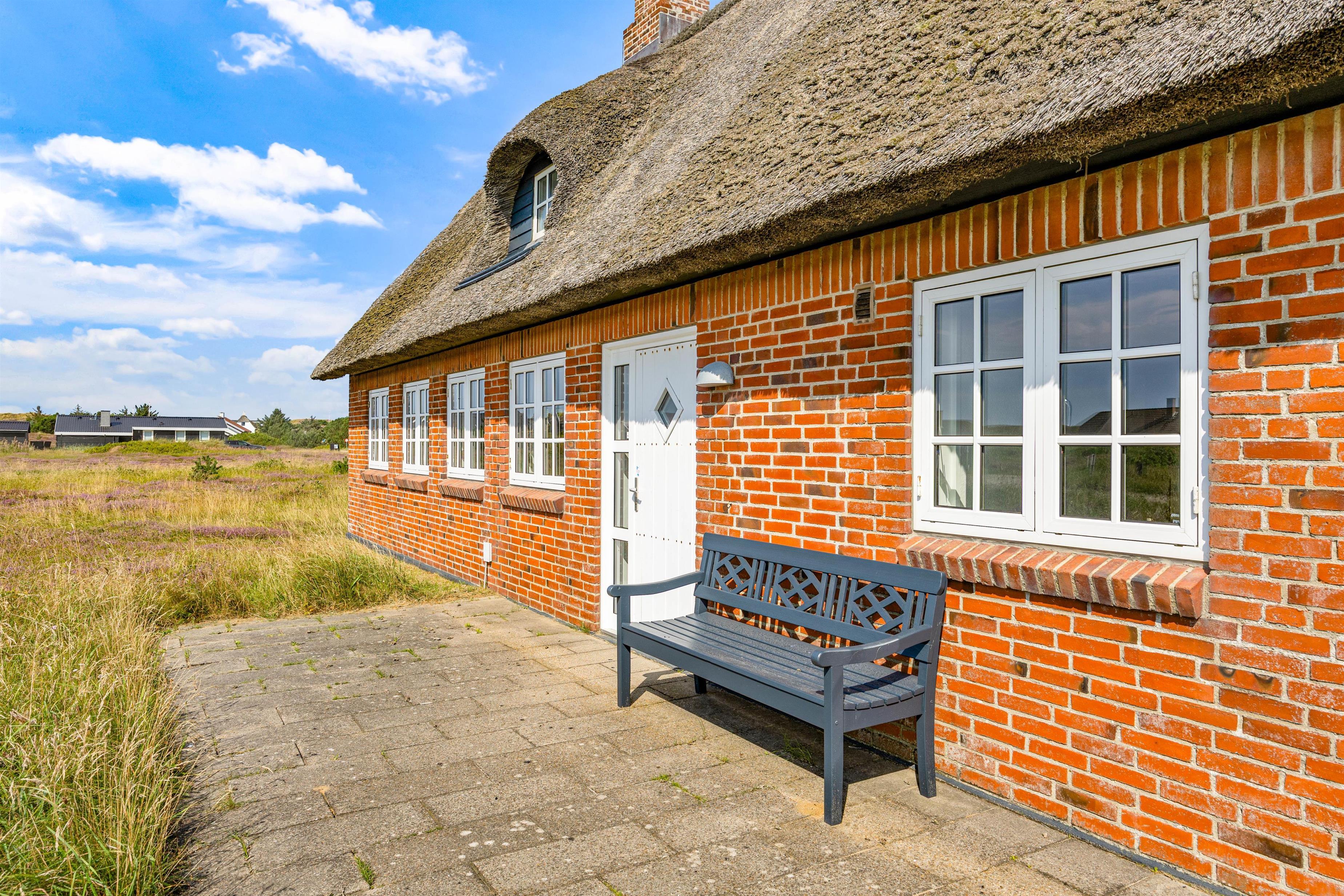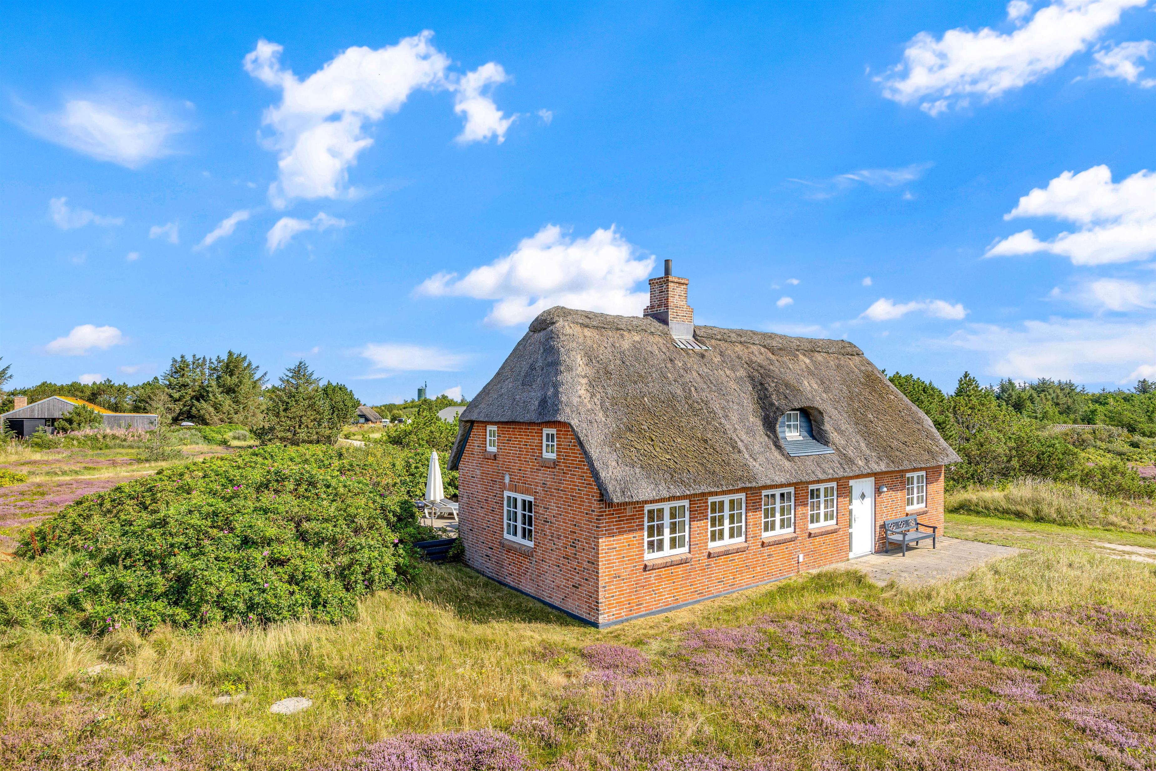 I Bjerregård byder dette stråtækte feriehus med sprossevinduer velkommen til op til 6 personer og en firbenet ven. Perfekt til familie og venner. Sommerhuset tilbyder blandt andet en lys og venlig opholdsstue med åbent køkken, brændeovn, energibesparende varmepumpe og sauna. Beliggenheden i Bjerregård er perfekt til at gå på opdagelse på Holmsland Klit. Glæd dig til afslappende timer foran brændeovnen, lange gåture til stranden og et par grillaftener på terrassen.