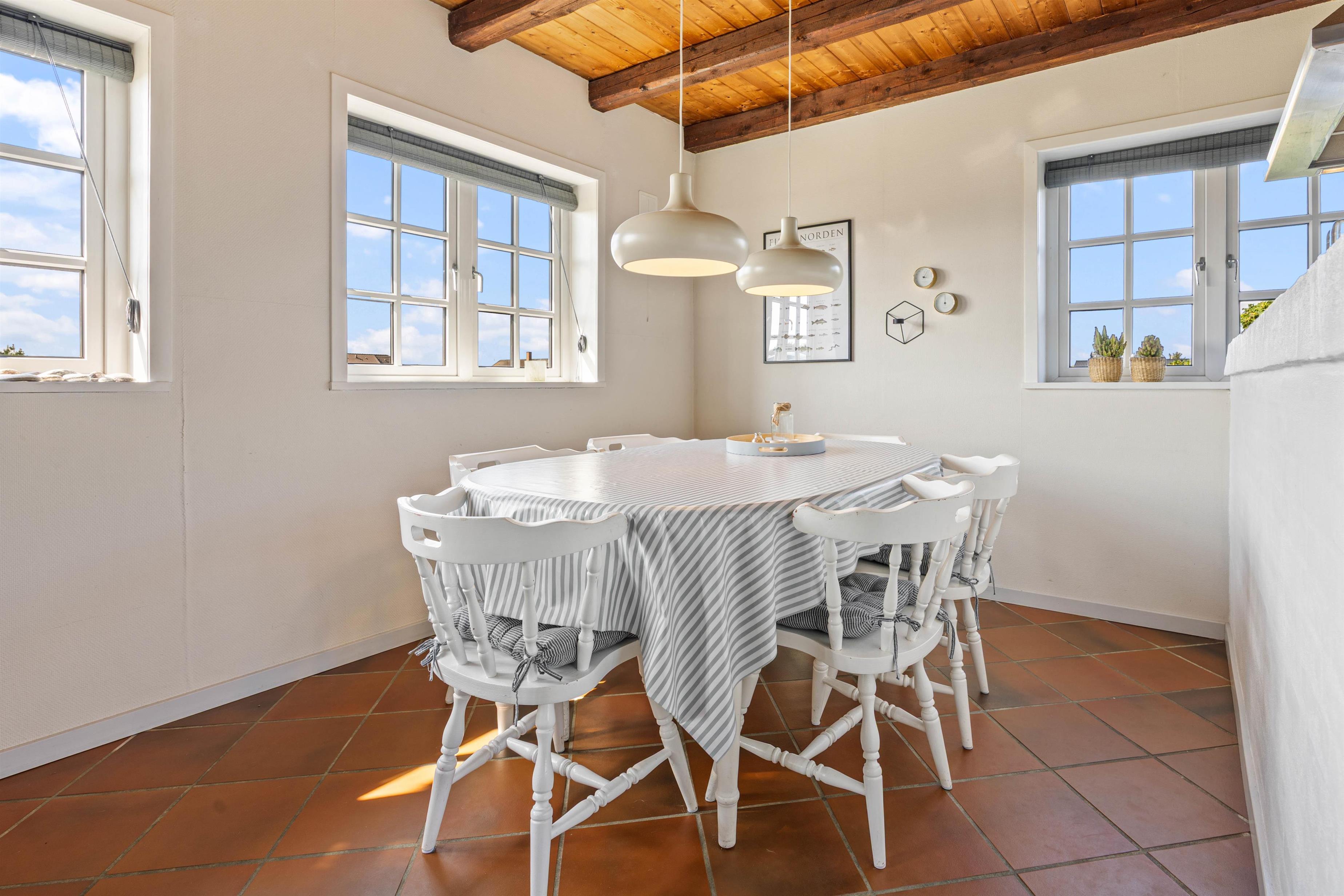 Det praktiske badeværelse med gulvvarme og den tilstødende sauna giver velvære og afspænding efter en begivenhedsrig dag ved Vesterhavet. I de 3 soveværelser er der 2 dobbeltsenge og et værelse med 2 enkeltsenge til fordeling imellem op til 6 personer.