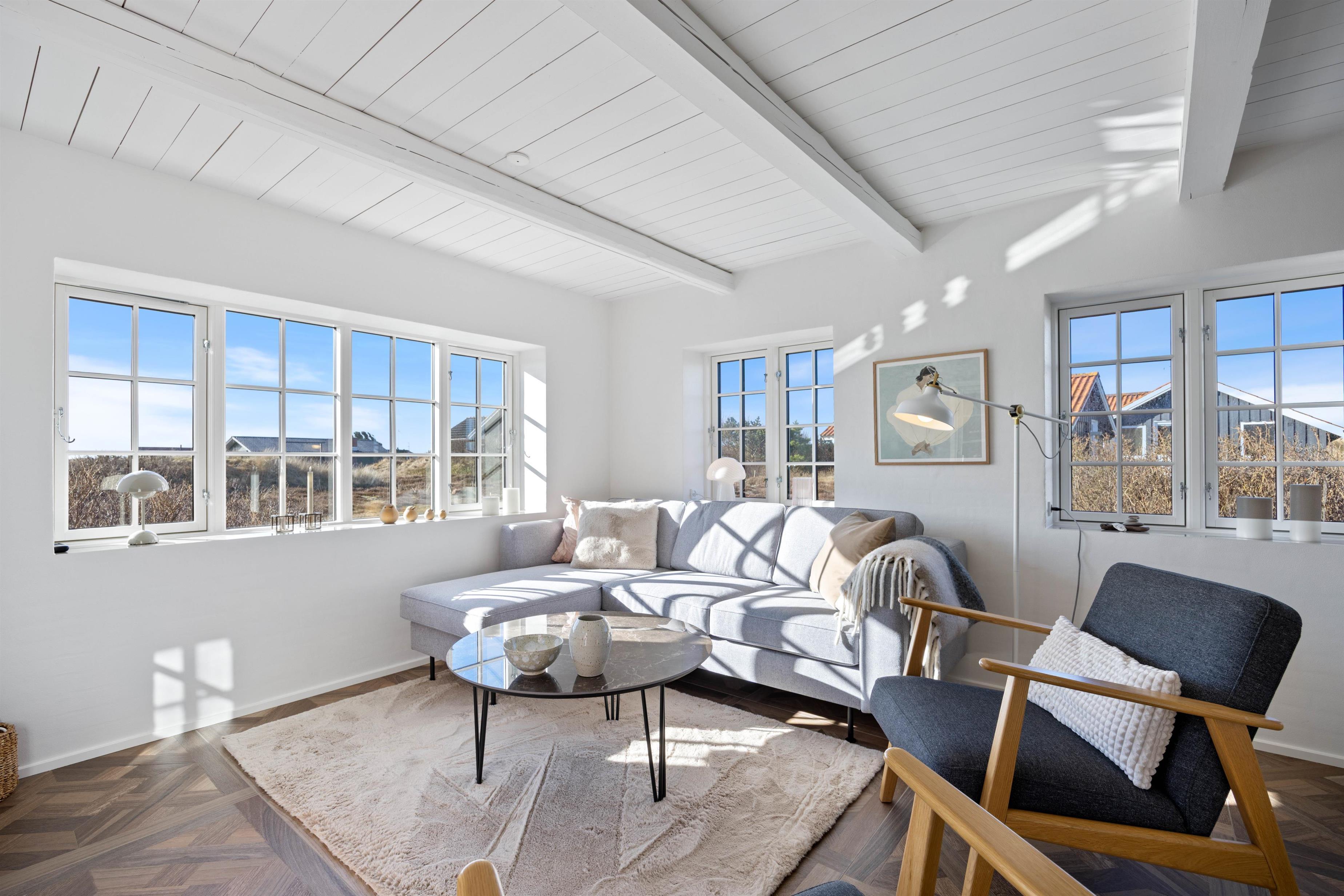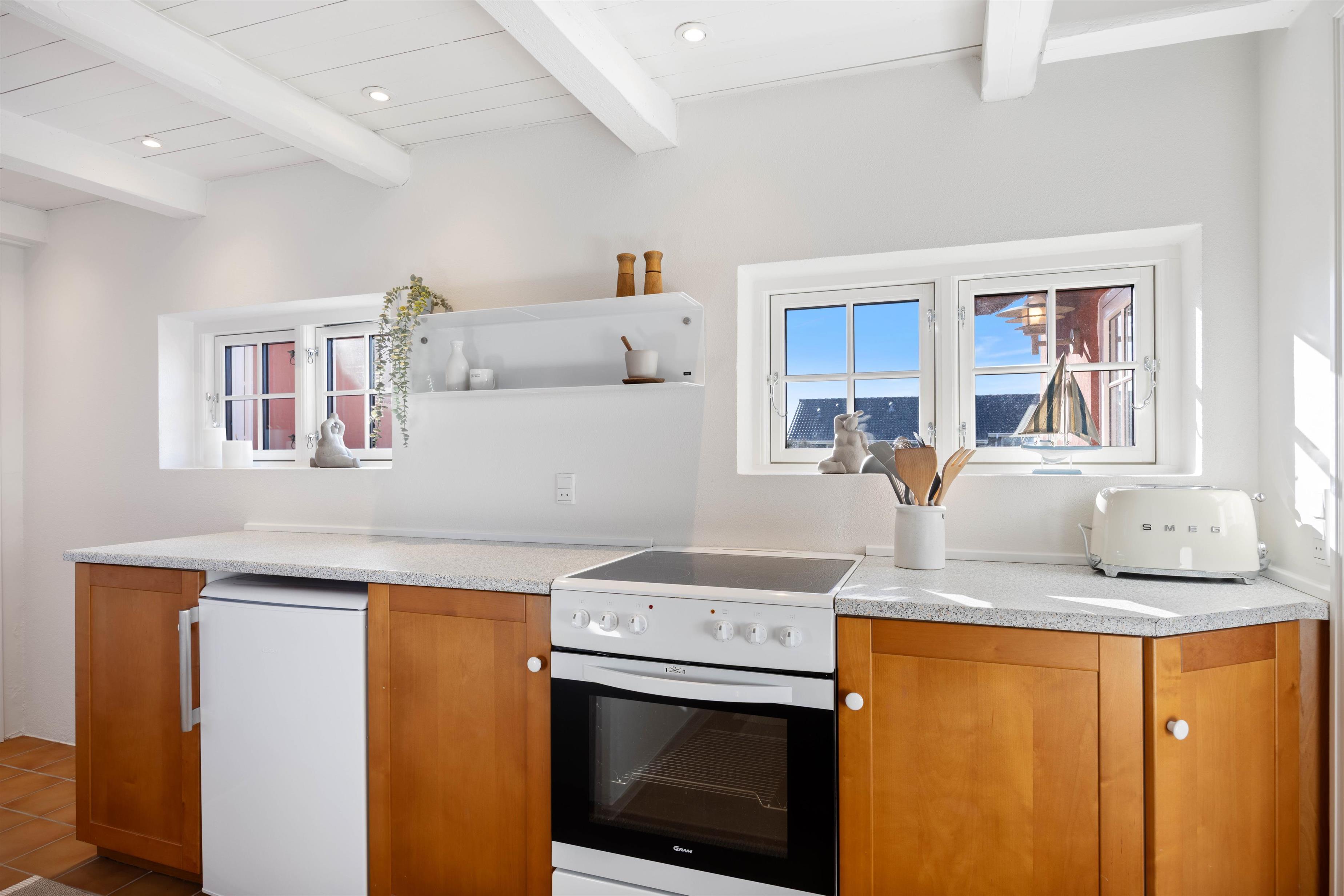 Køkkenet er fuldt udstyret med service til, at I kan forkæle hinanden med lækre, hjemmelavede måltider. I badeværelset med gulvvarme behøver I ikke at frygte kolde tæer under tandbørstningen. De 2 soveværelser indeholder hver en dobbeltseng, hvor I kan hvile rigtig godt ud i den friske vesterhavsluft. Fra det ene soveværelse er der udgang til den sydvendte terrasse.