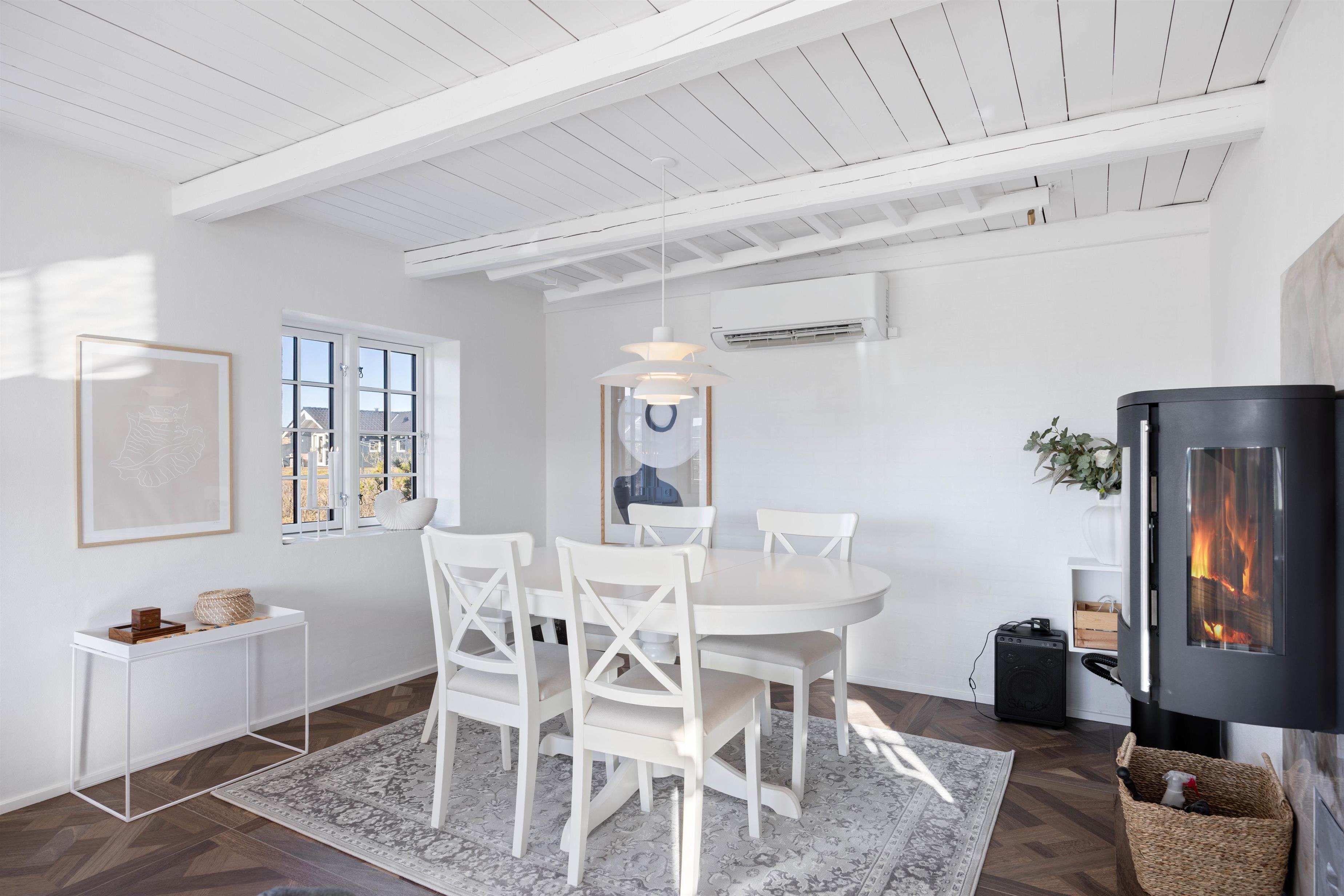Det charmerende sommerhus er opført i sten og strå, og den lyse og venlige indretning med de rustikke materialer byder straks velkommen indenfor. De synlige bjælker, hvidmalede lofter og fyldningsdøre tilfører et gedigent og tidstypisk indtryk. Der er et fint lysindfald i alle rum igennem de hvidmalede sprossevinduer. I stuen med klinker er en hyggelig spiseplads, hvor I kan spille kort eller et sjovt brætspil. Eller I kan slappe af i sofagruppen med en god bog eller se en film sammen. Alt i mens brændeovnen sætter prikken over i'et til feriestemningen. Sommerhuset har desuden varmepumpe.