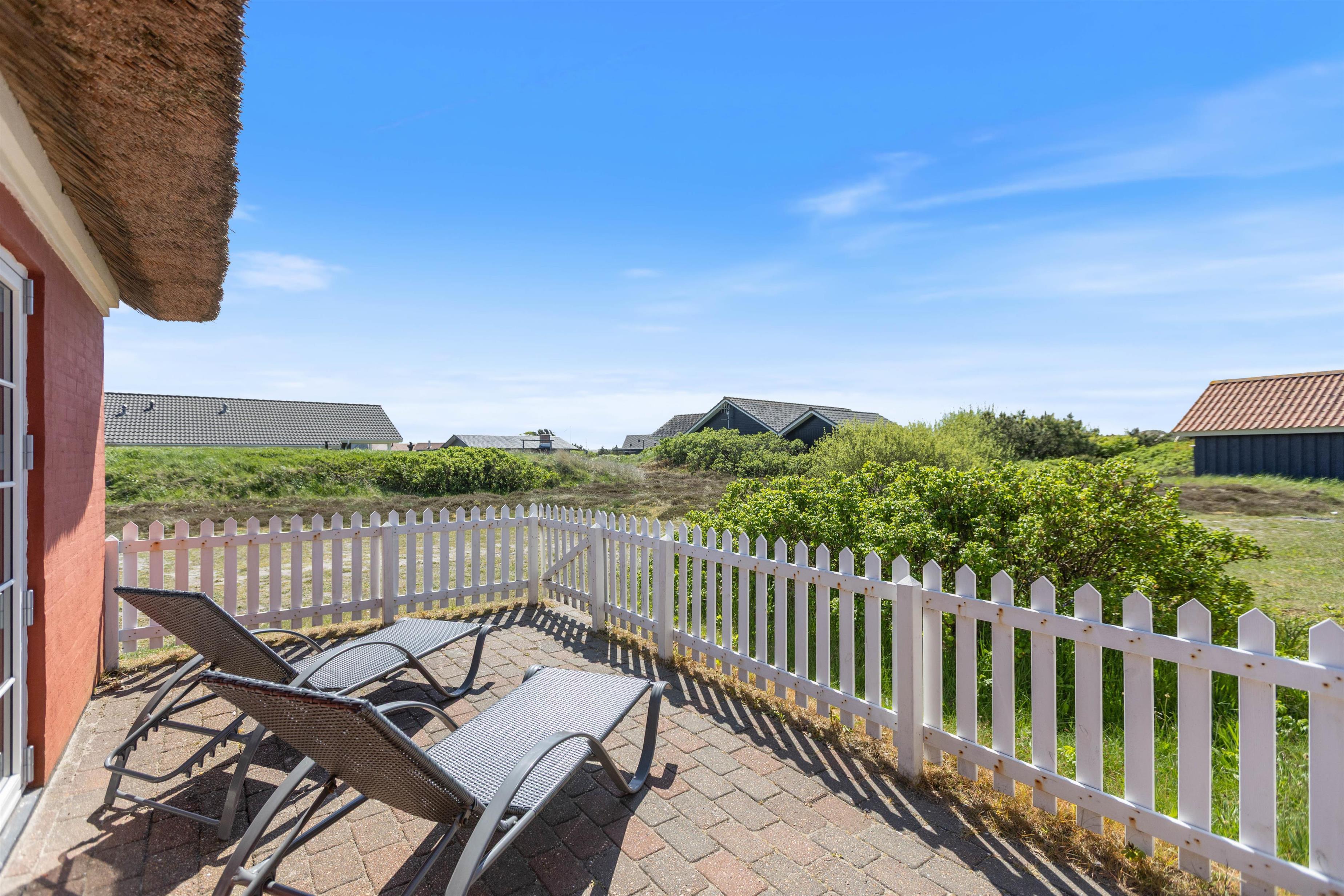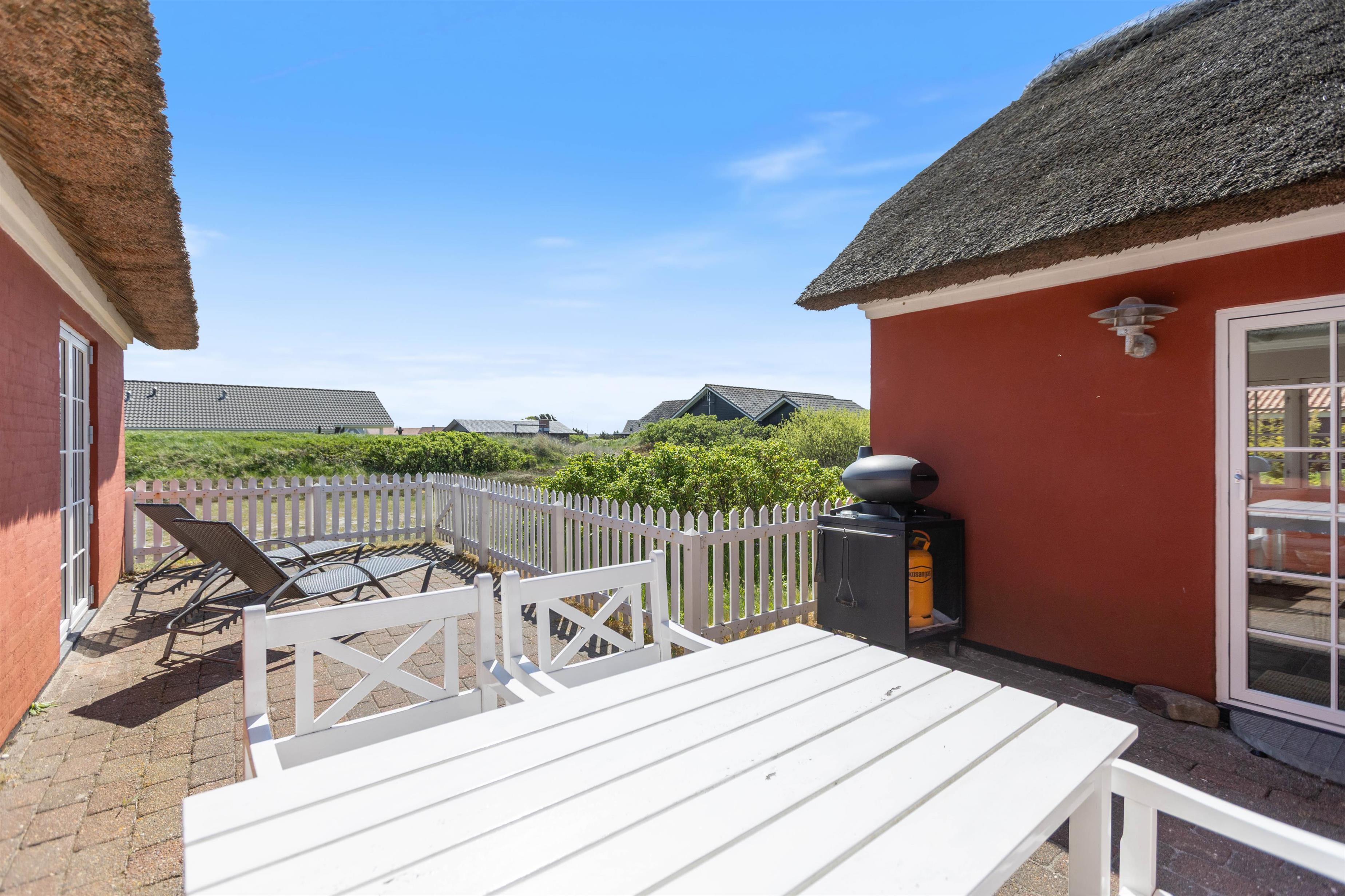 Sommerhuset på den vestjyske klitgrund byder også på udendørs oplevelser. På den afskærmede terrasse mod syd kan i slappe af eller solbade i de komfortable havemøbler, ligesom I kan indtage dagens måltider herude. Tænd op i gasgrillen til aften og nyd et fælles grillmåltid, imens skyggerne bliver lange.