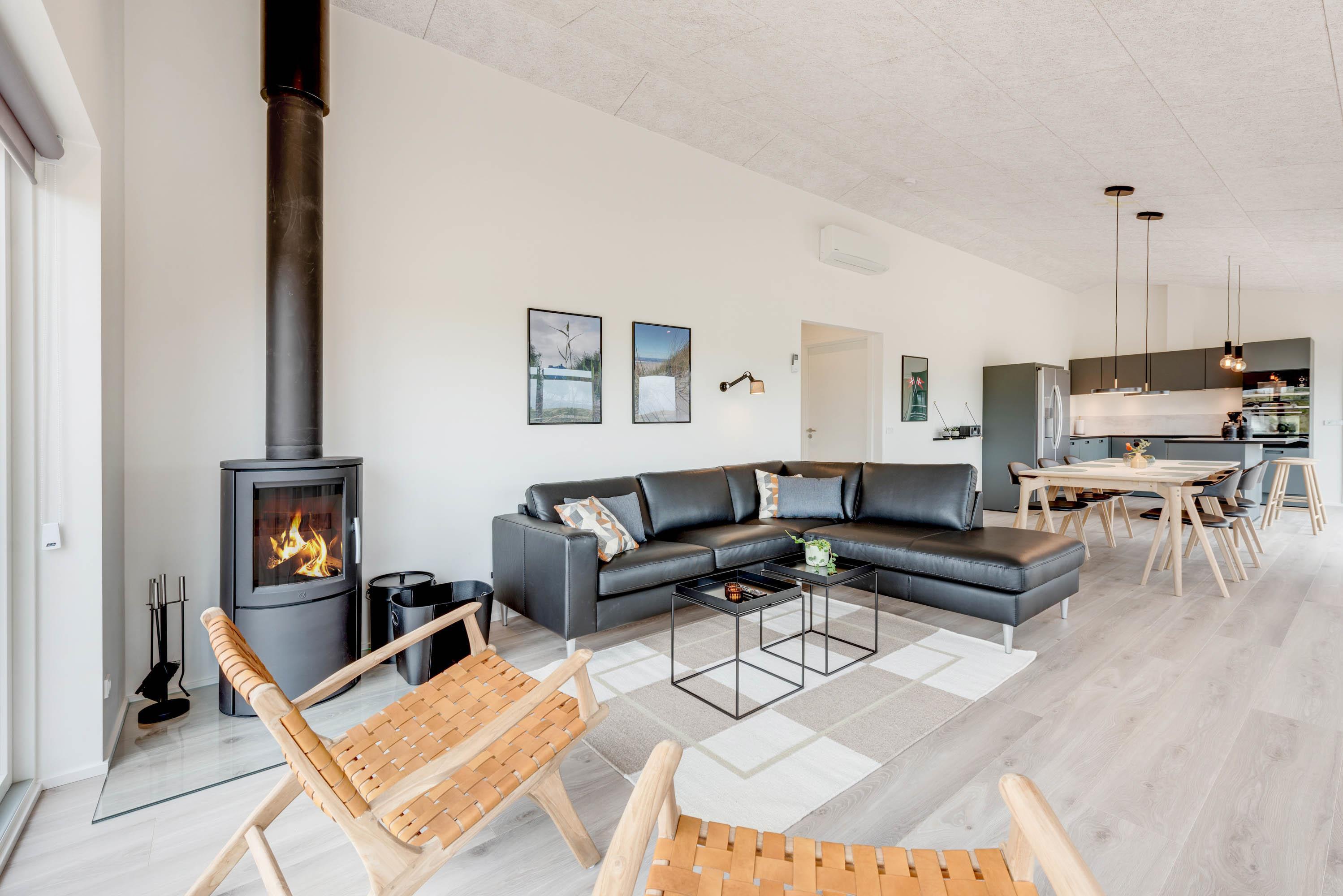 Dette feriehus vil uden tvivl opfylde selv den mest kræsne feriegæsts drømme. Den moderne og stilfulde indretning byder på en række af lækre faciliteter, bl.a. udendørs spabad, sauna, gasgrill, vaskemaskine, tørretumbler, varmepumpe og hele 4 fladskærme. Feriehusets hjerte er uden tvivl det store lyse køkkenalrum, hvor det flotte åbne køkken har udsigt over stuen med brændeovnen, som lægger op til mange hyggelige stunder med familie og venner.