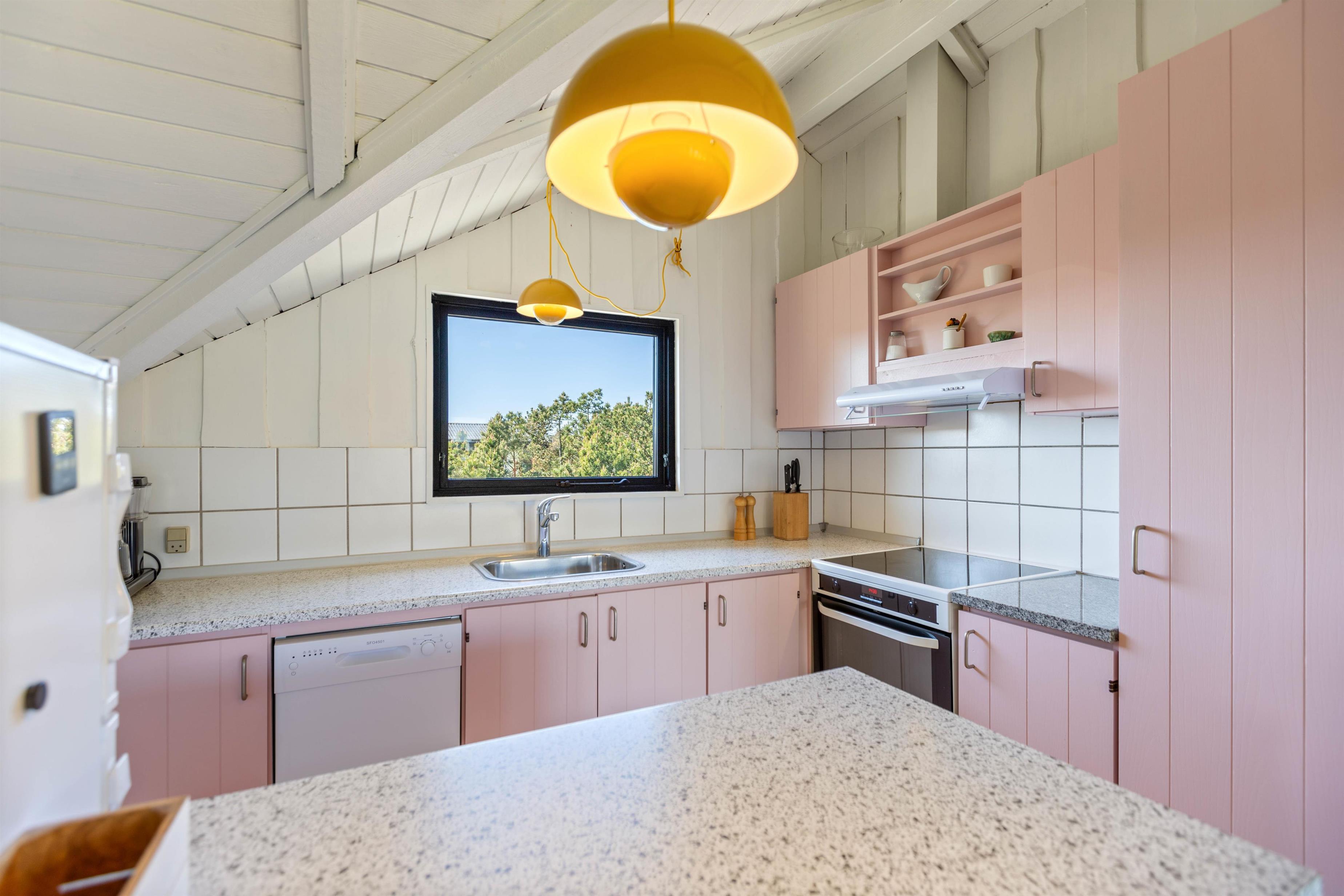 Samlingspunktet i feriehuset finder I i det hyggelige opholdsrum. Opholdsrummet ligger i åben forbindelse med sommerhusets køkken, så familien kan være samlet mest muligt under ferien. Stuen er indrettet med en brændeovn, som spreder varme og en ekstra hyggelig feriestemning. Sommerhuset har desuden en varmepumpe, som I med fordel kan benytte jer af.