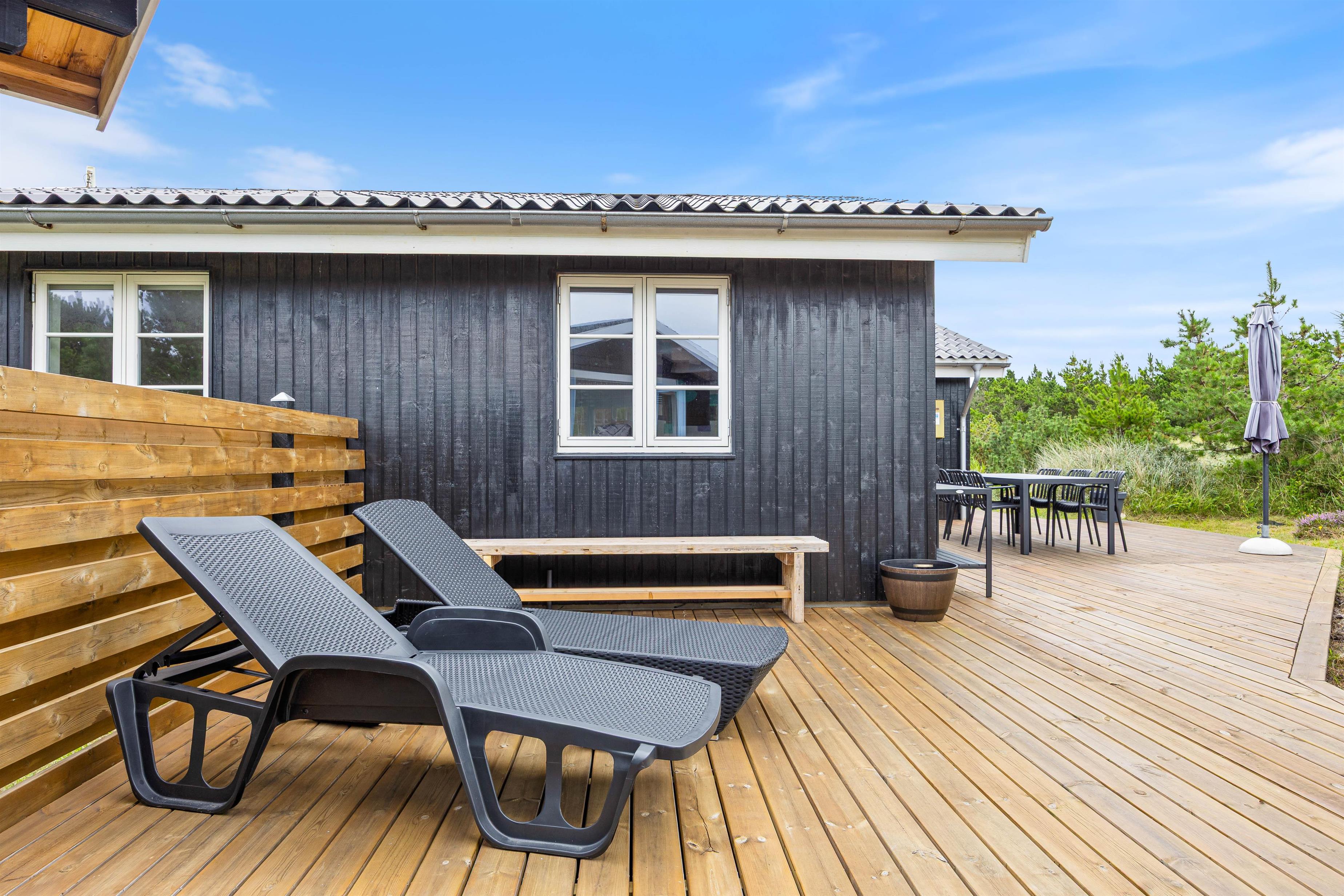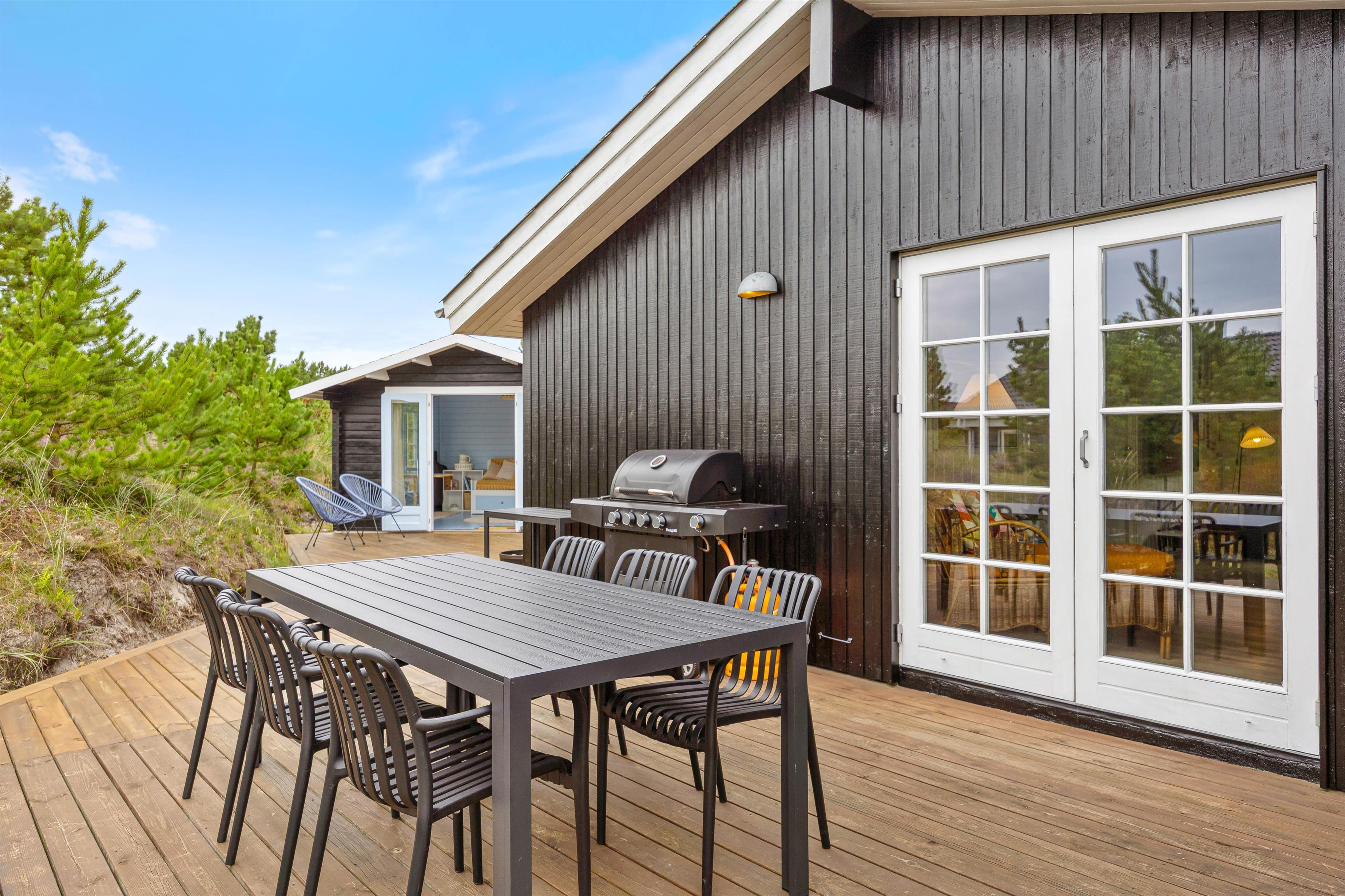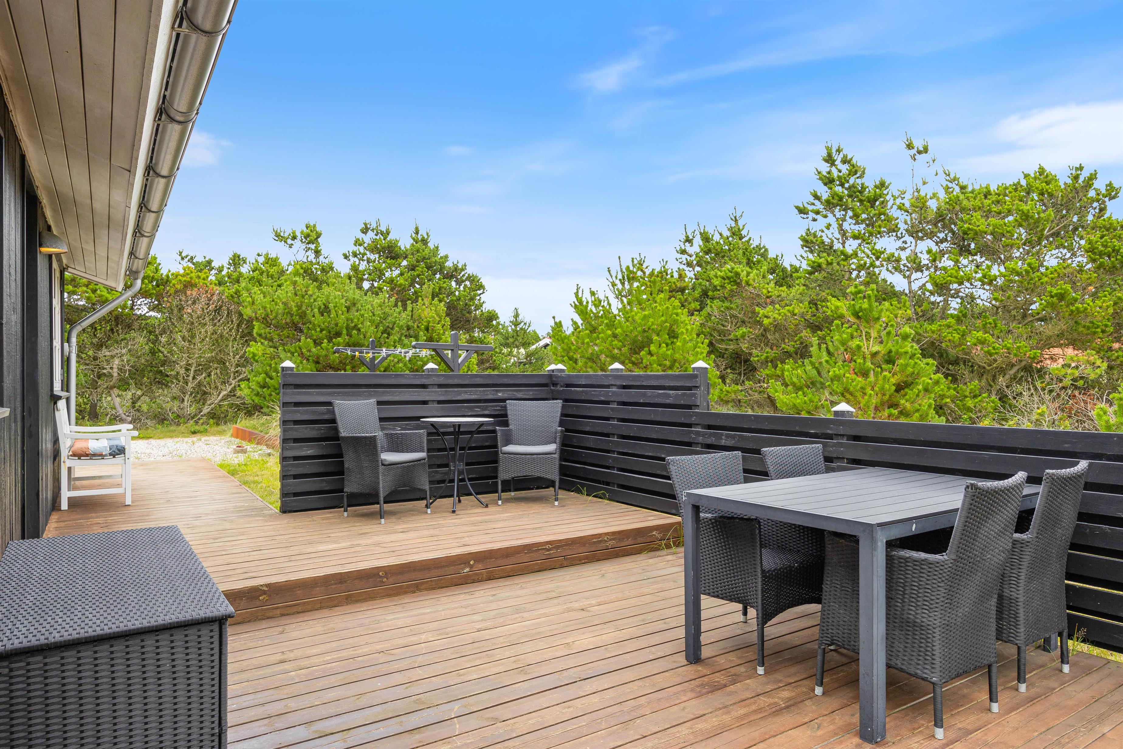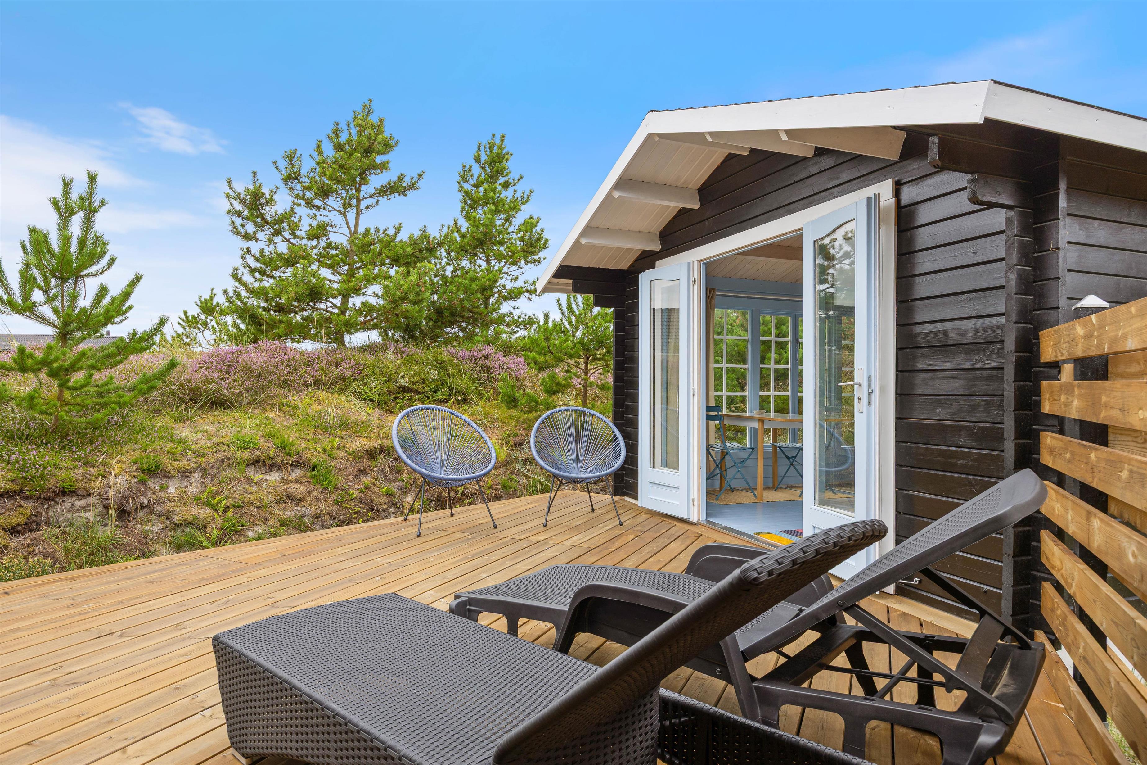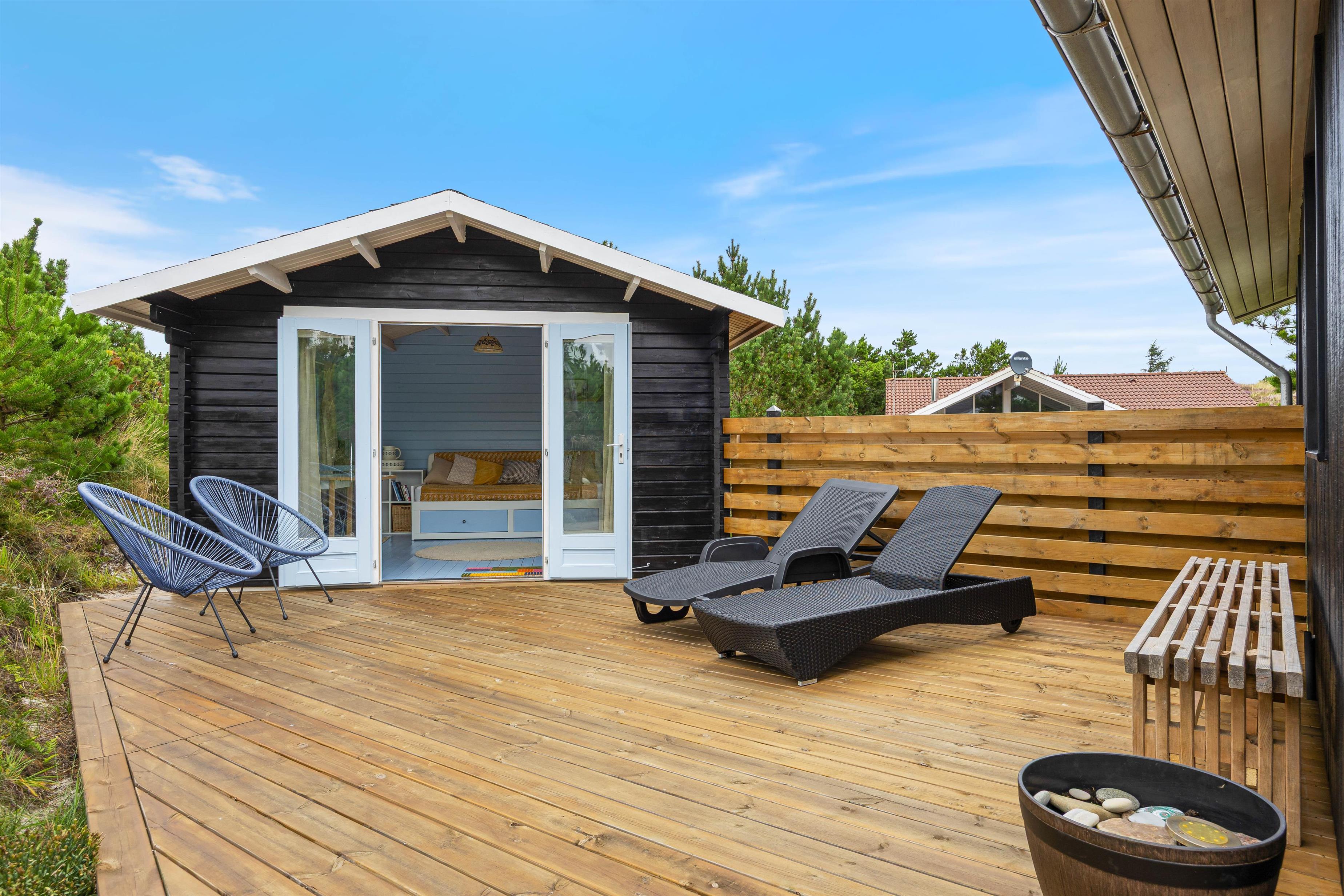Omkring sommerhuset er der flere gode terrasser, så du har god mulighed for at sidde ude og nyde solen, den friske luft, og den smukke naturgrund. En del af terrasserne er afskærmede, så du nemt kan finde en plads med læ til en hyggelig grillaften.