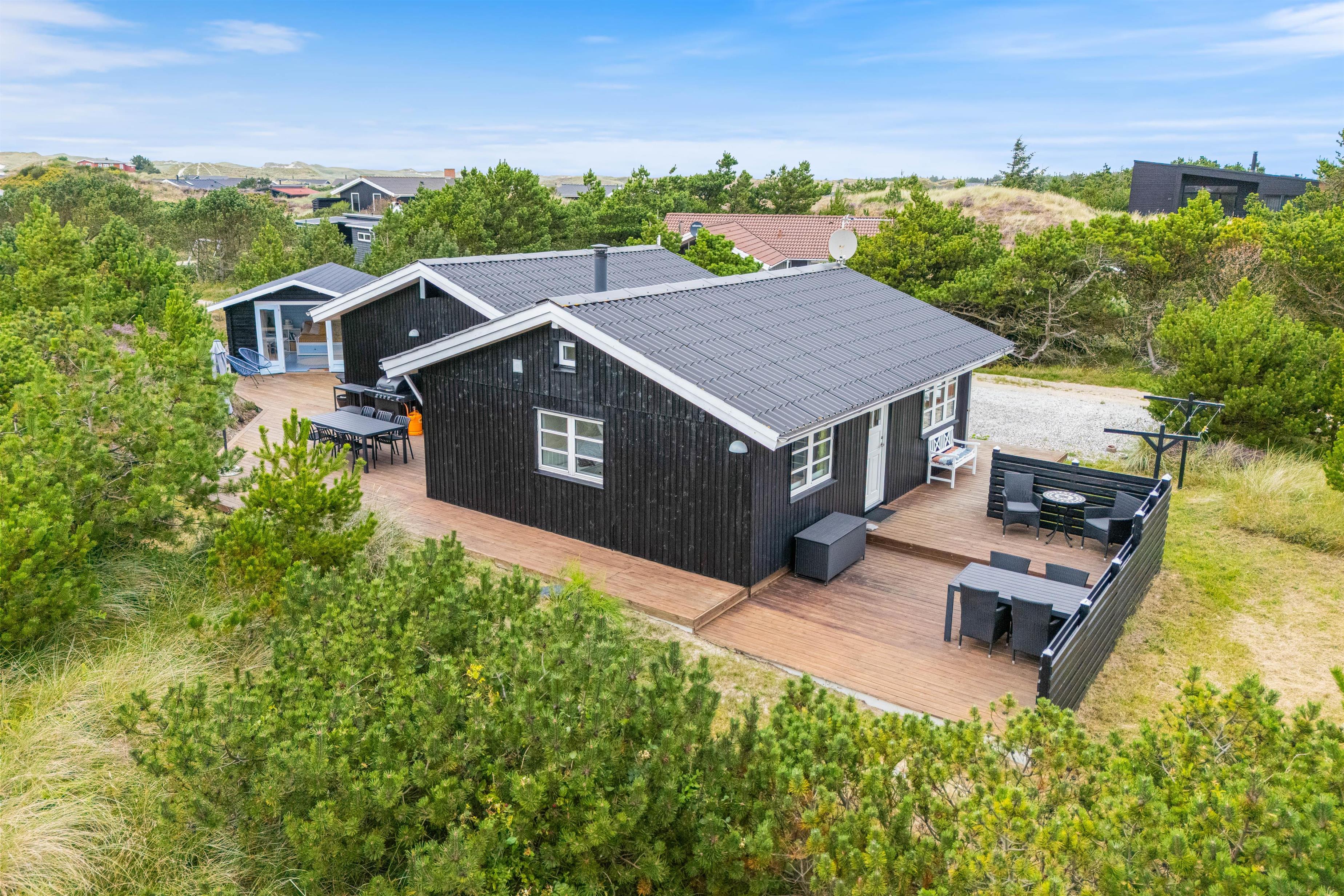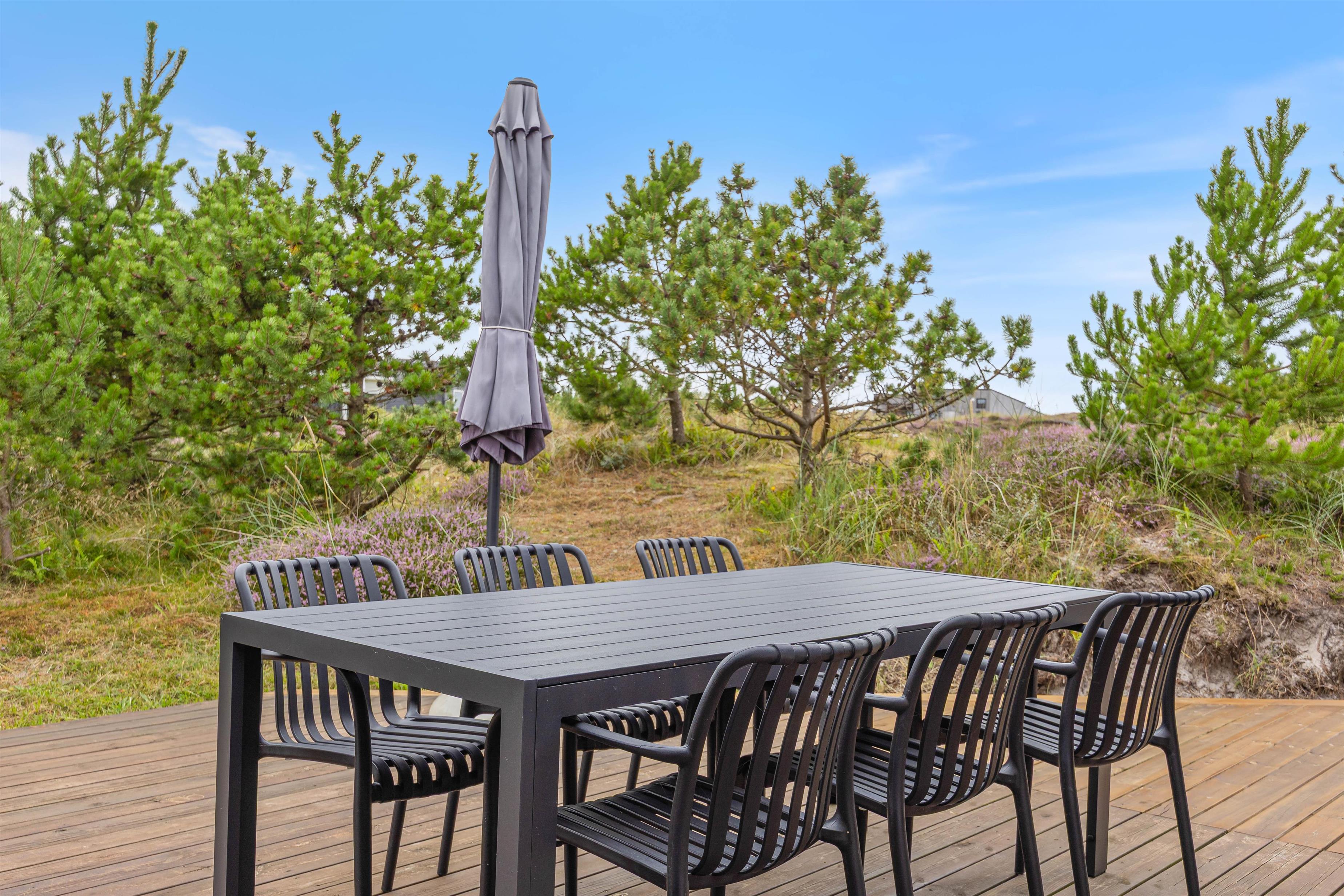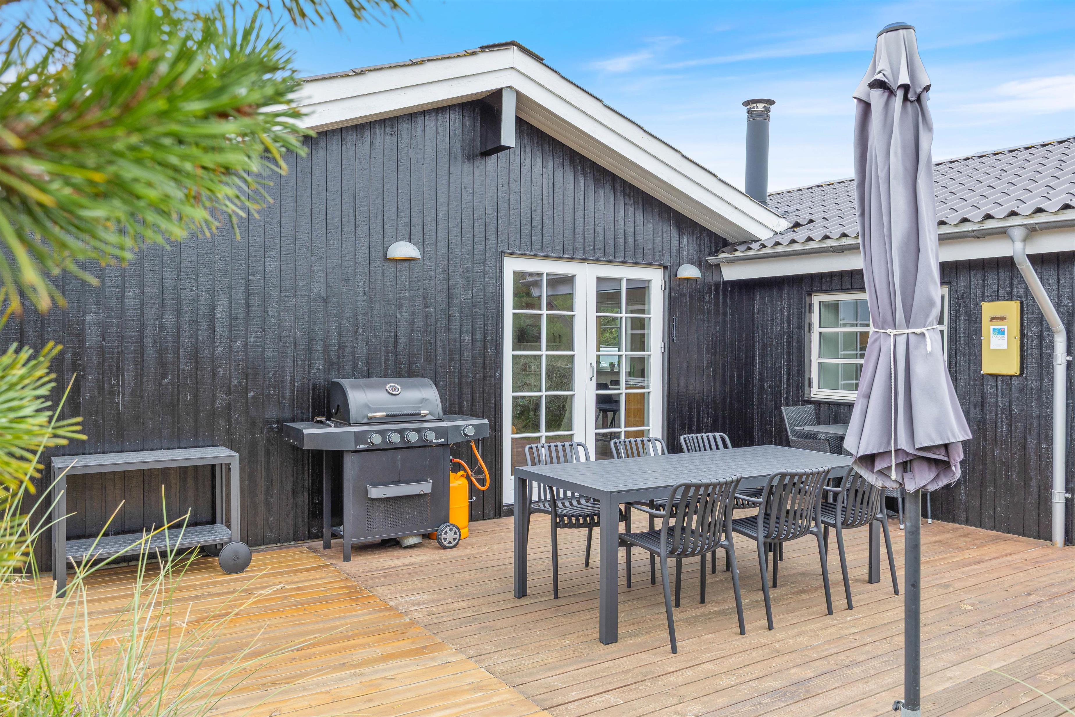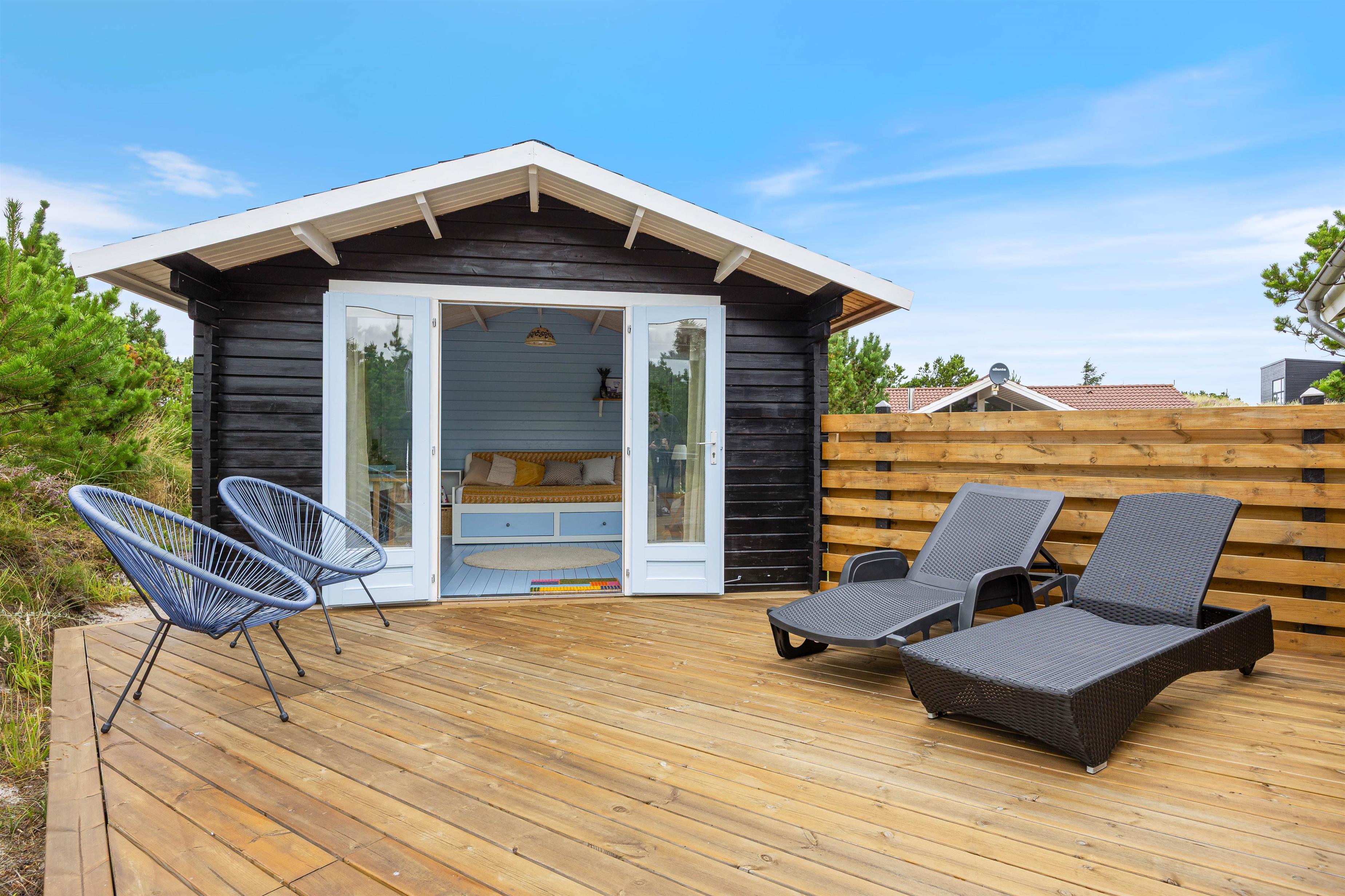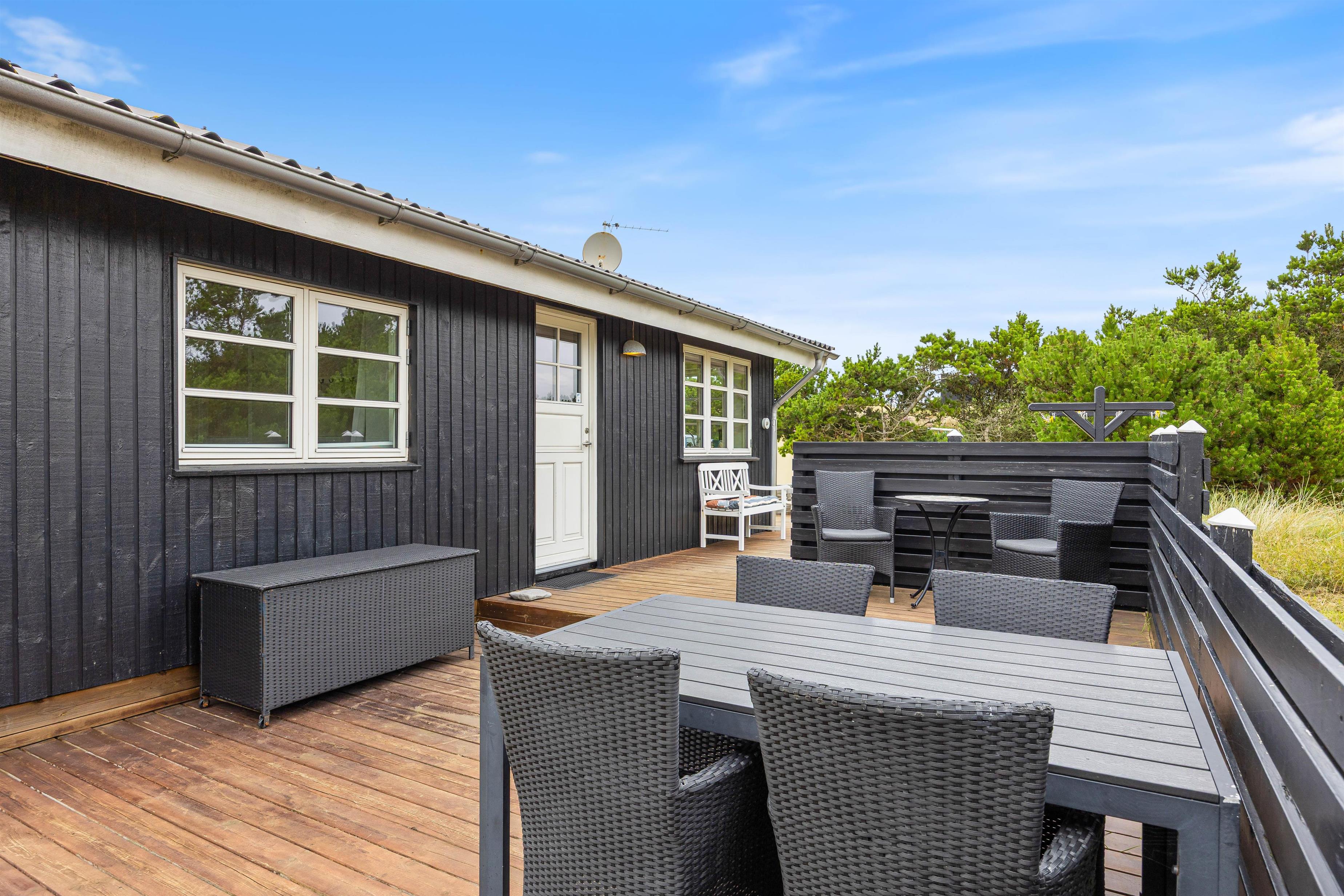 Omkring sommerhuset er der flere gode terrasser, så du har god mulighed for at sidde ude og nyde solen, den friske luft, og den smukke naturgrund. En del af terrasserne er afskærmede, så du nemt kan finde en plads med læ til en hyggelig grillaften.
