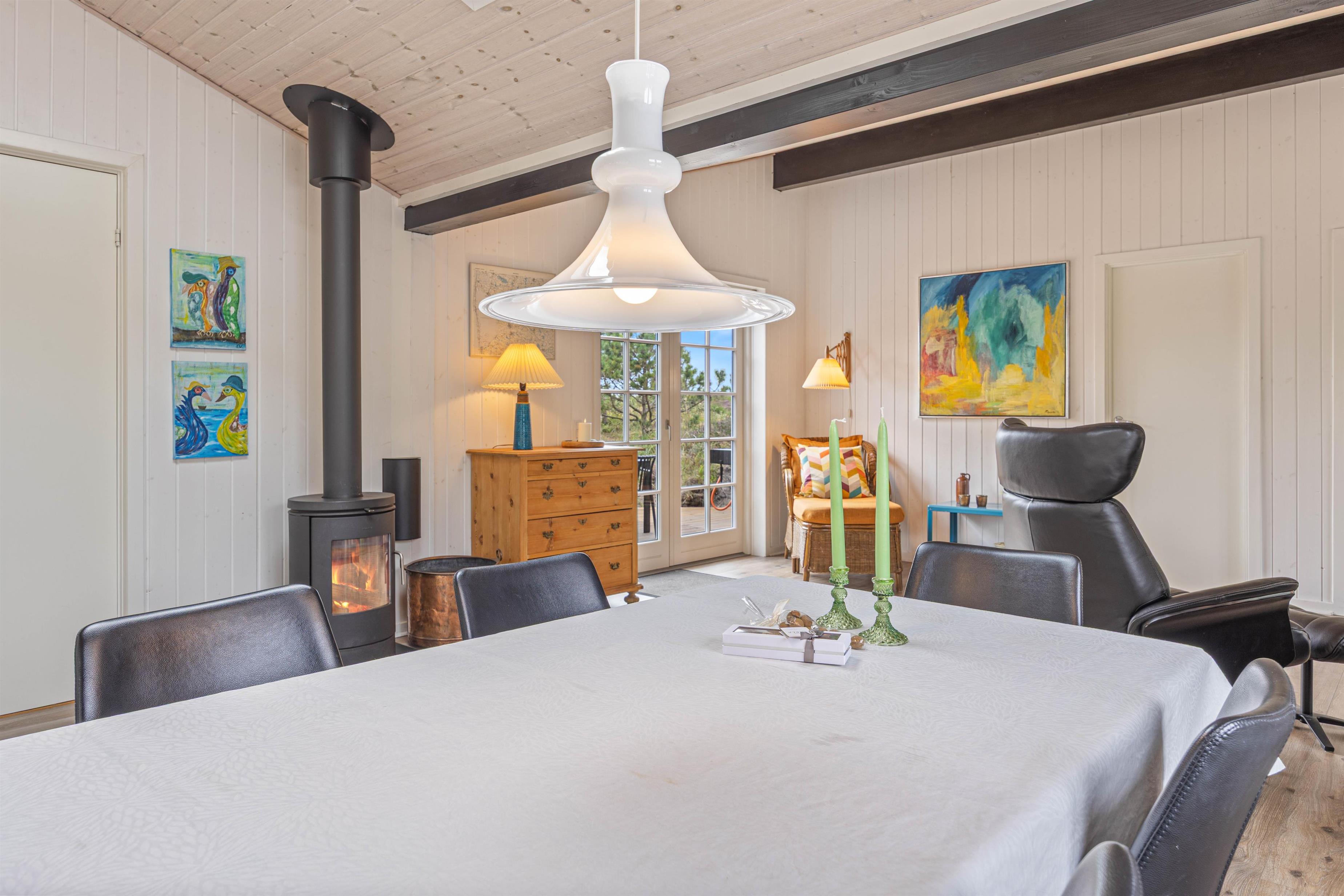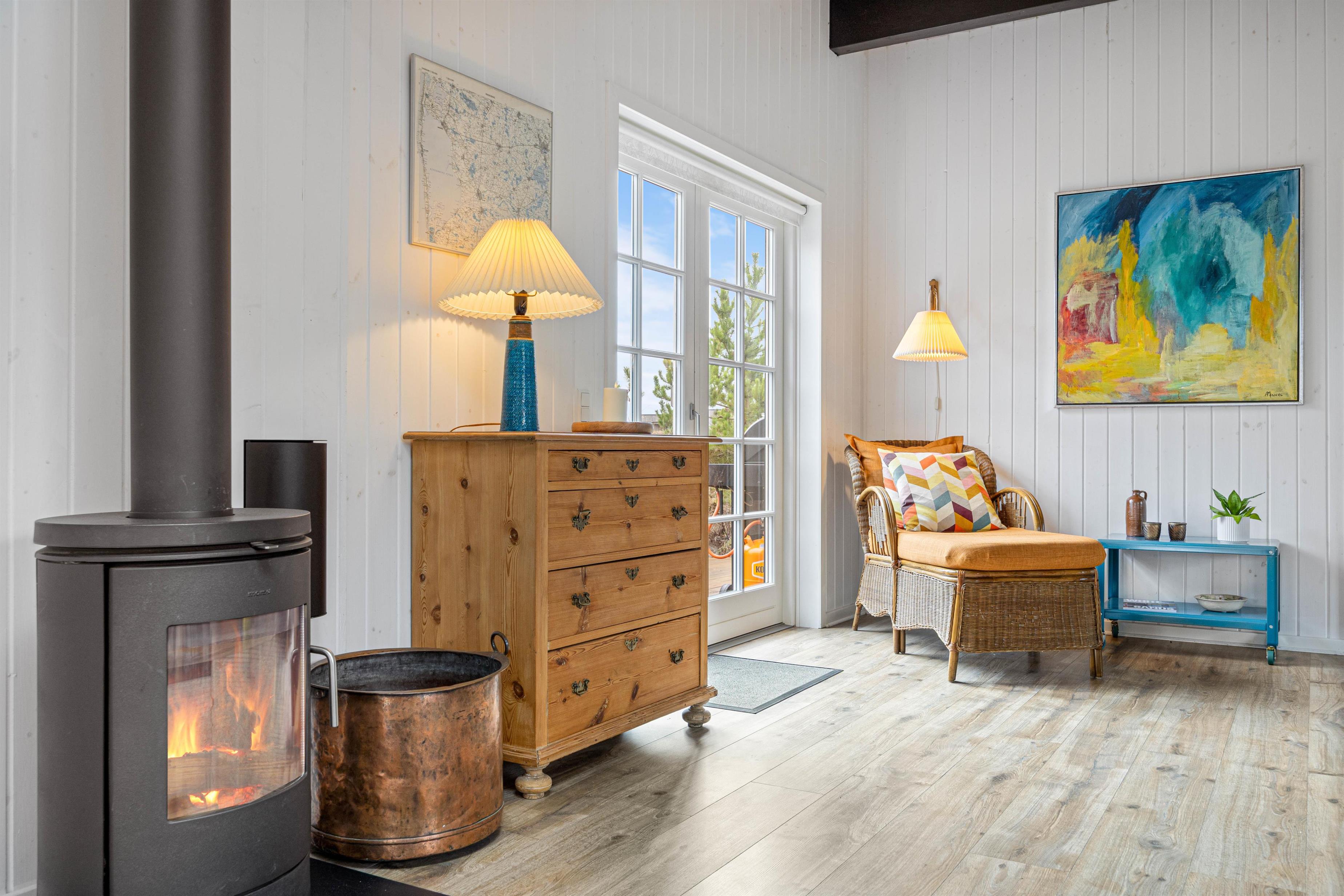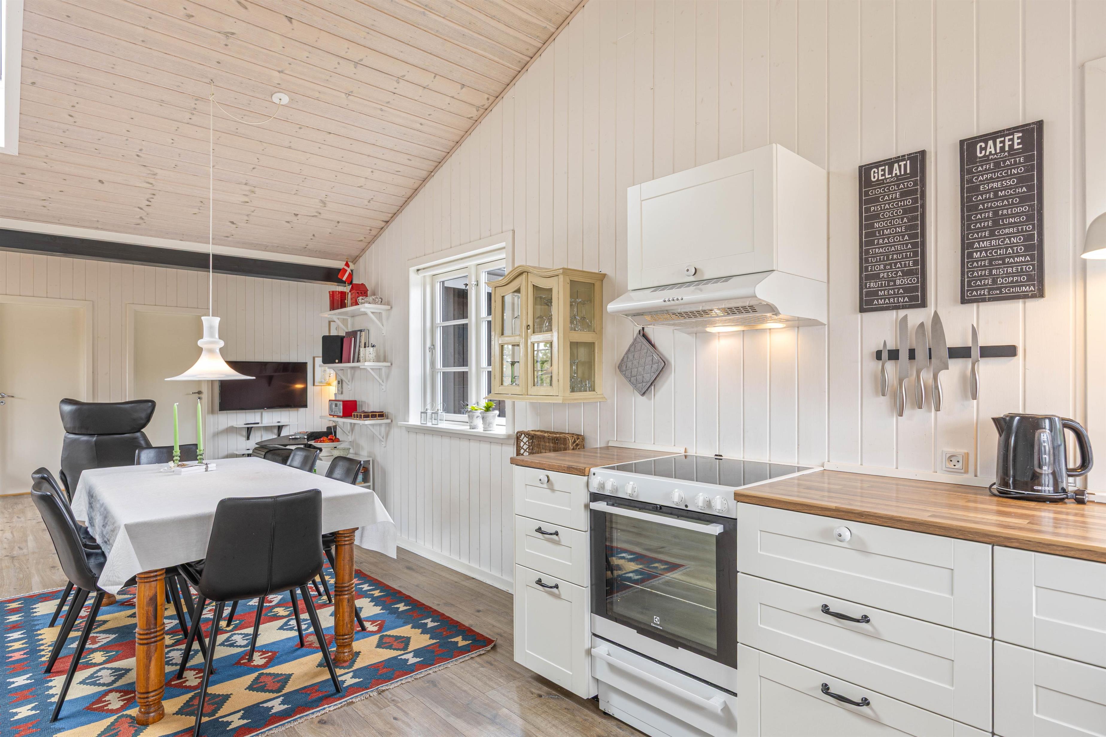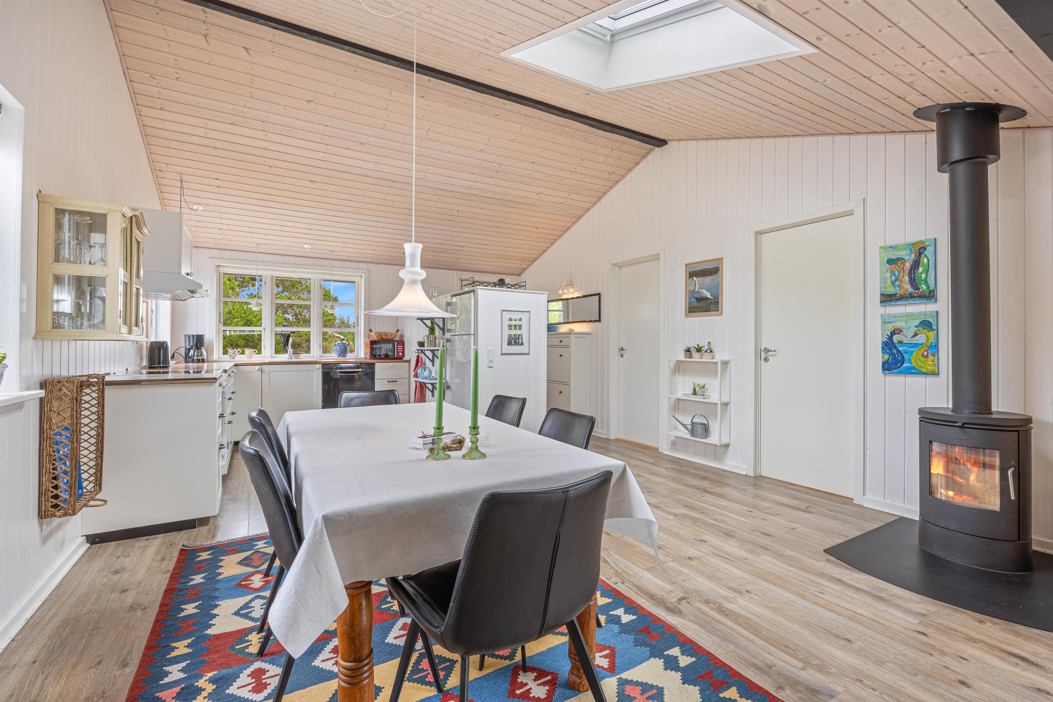 Sommerhuset har en varm og hjemlig atmosfære med personlige detaljer, der skaber den helt rette feriestemning. Køkken, spiseafdeling og stue ligger i åben forbindelse, så der er rig mulighed for at samles om madlavning, spil eller afslapning. Efter en dag fyldt med oplevelser kan I nyde en hyggelig aften foran den knitrende brændeovn, der giver både varme og ekstra hygge.