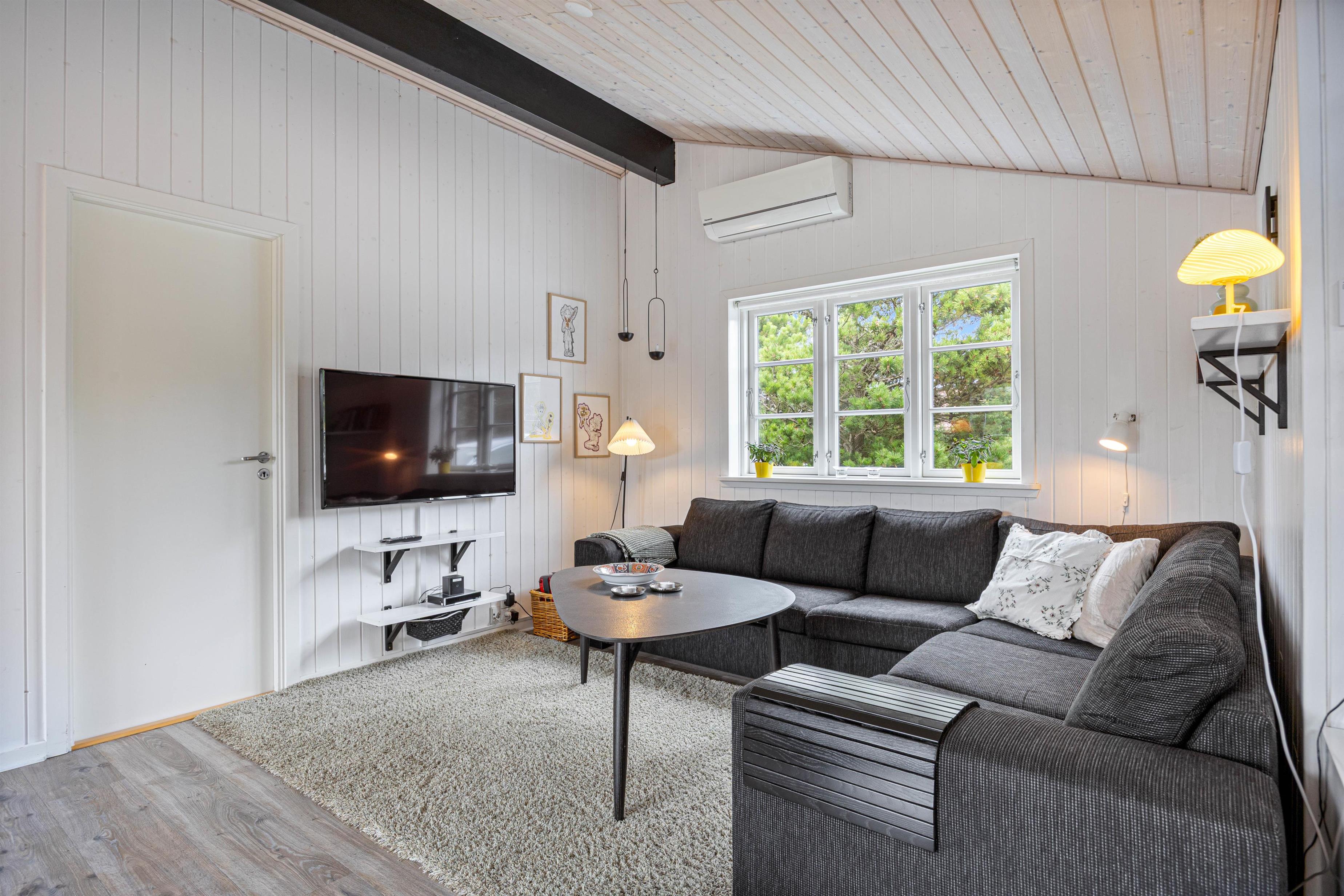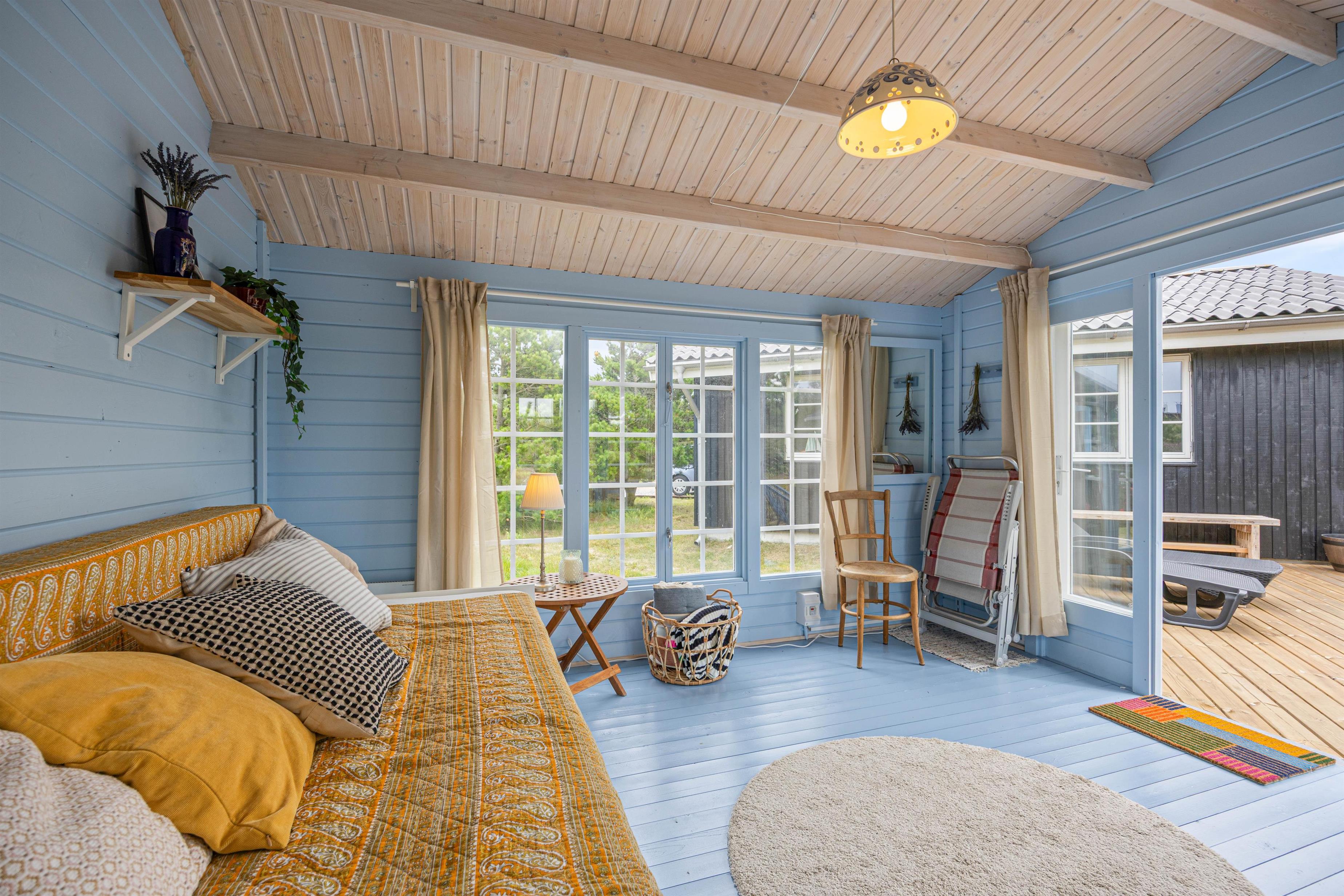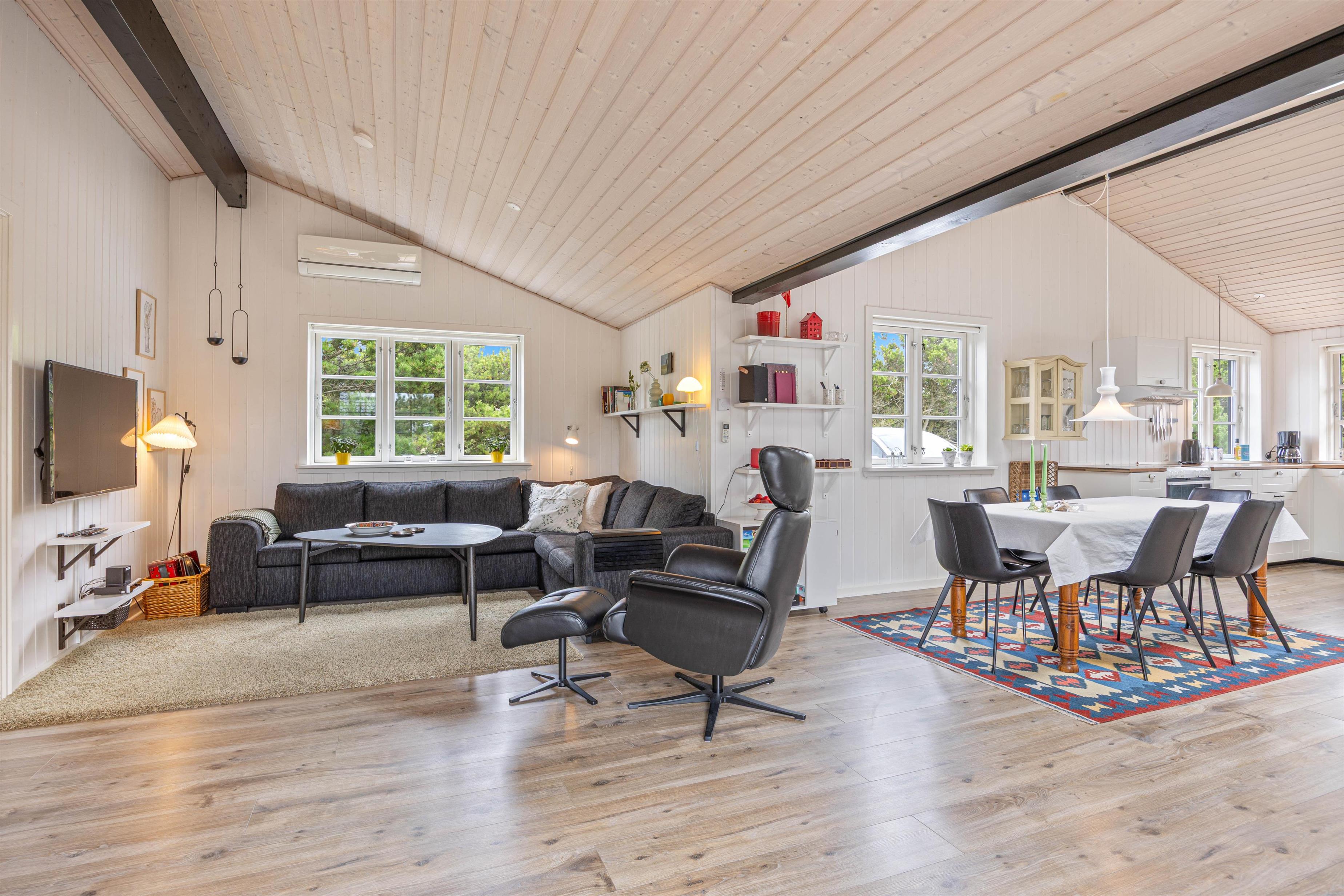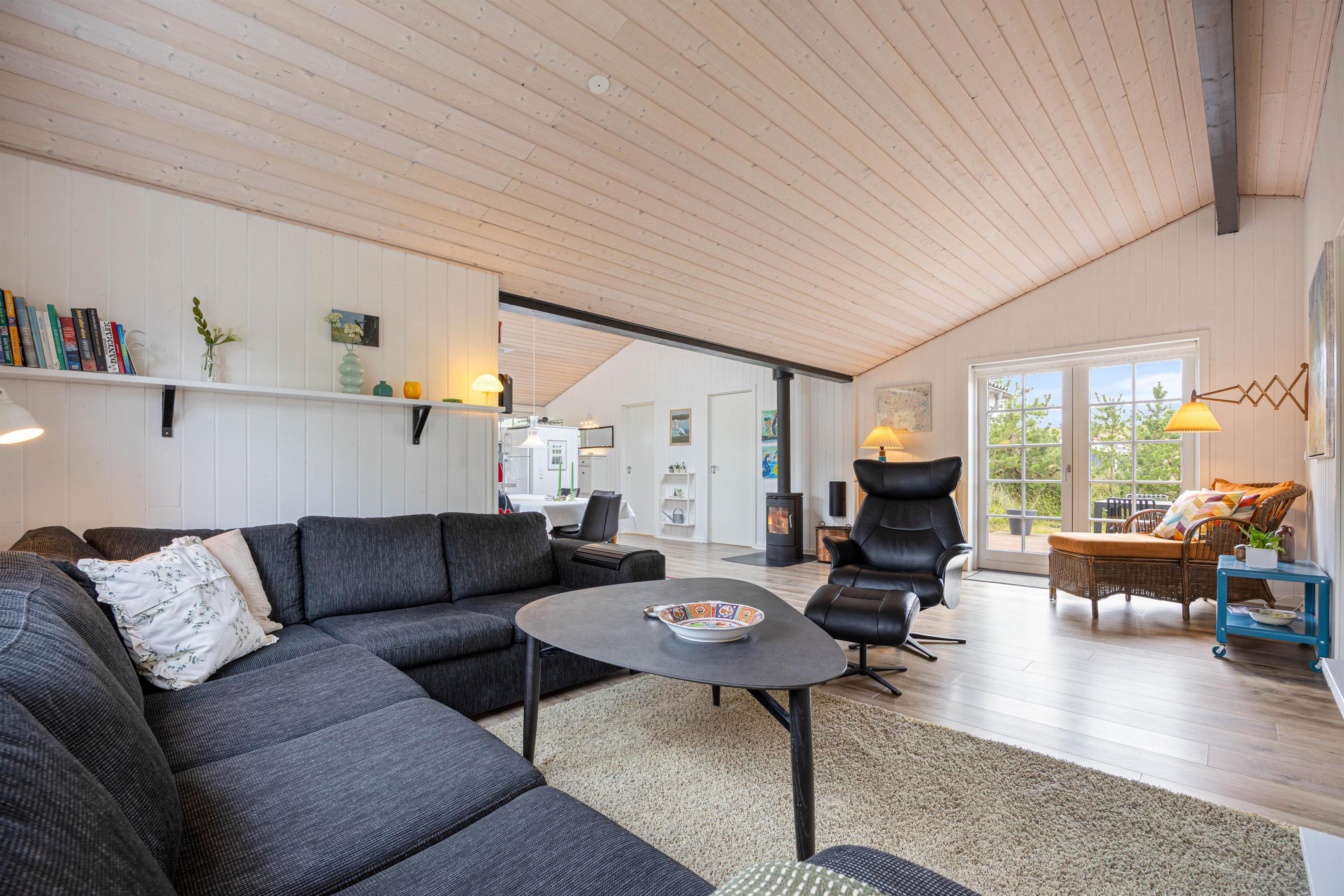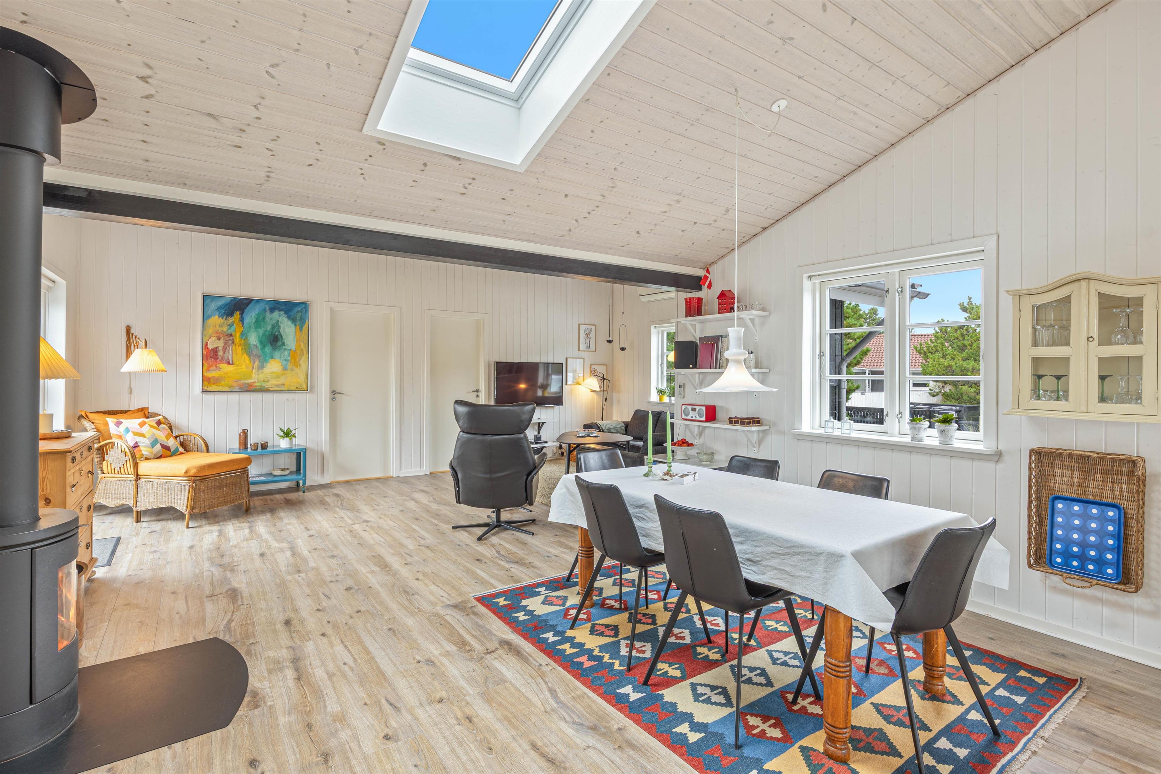 Sommerhuset har en varm og hjemlig atmosfære med personlige detaljer, der skaber den helt rette feriestemning. Køkken, spiseafdeling og stue ligger i åben forbindelse, så der er rig mulighed for at samles om madlavning, spil eller afslapning. Efter en dag fyldt med oplevelser kan I nyde en hyggelig aften foran den knitrende brændeovn, der giver både varme og ekstra hygge.