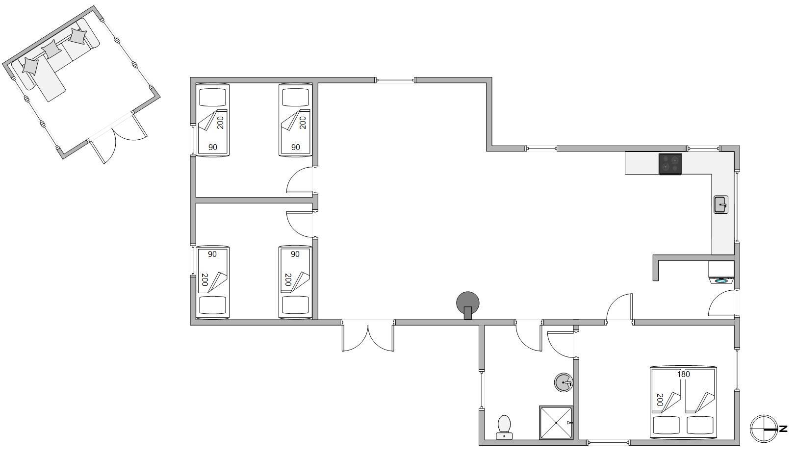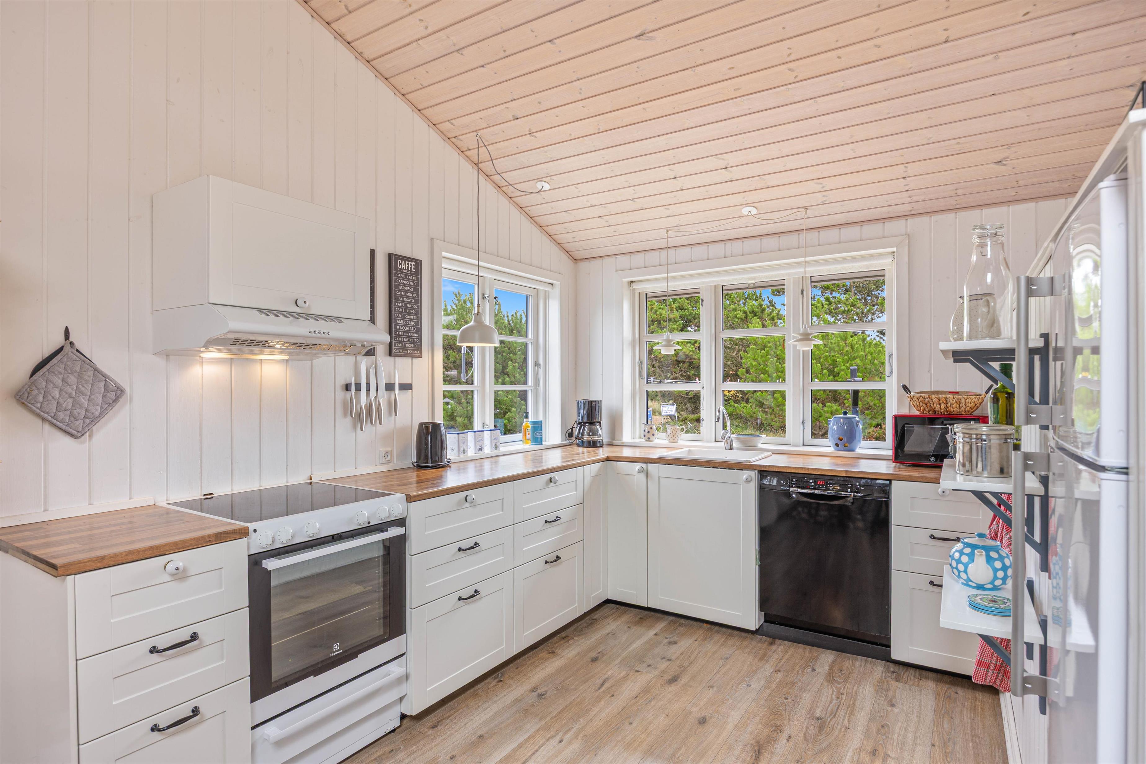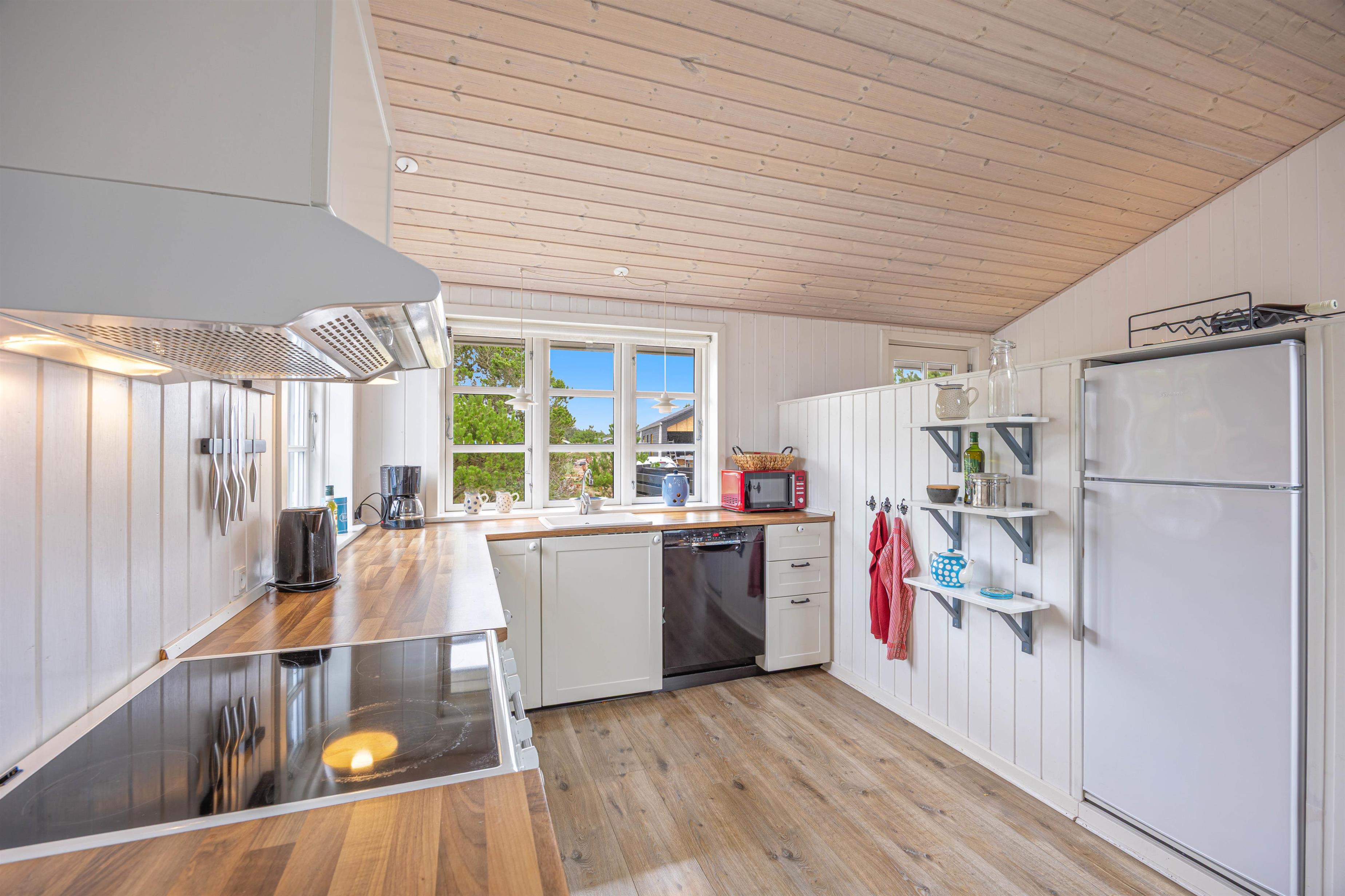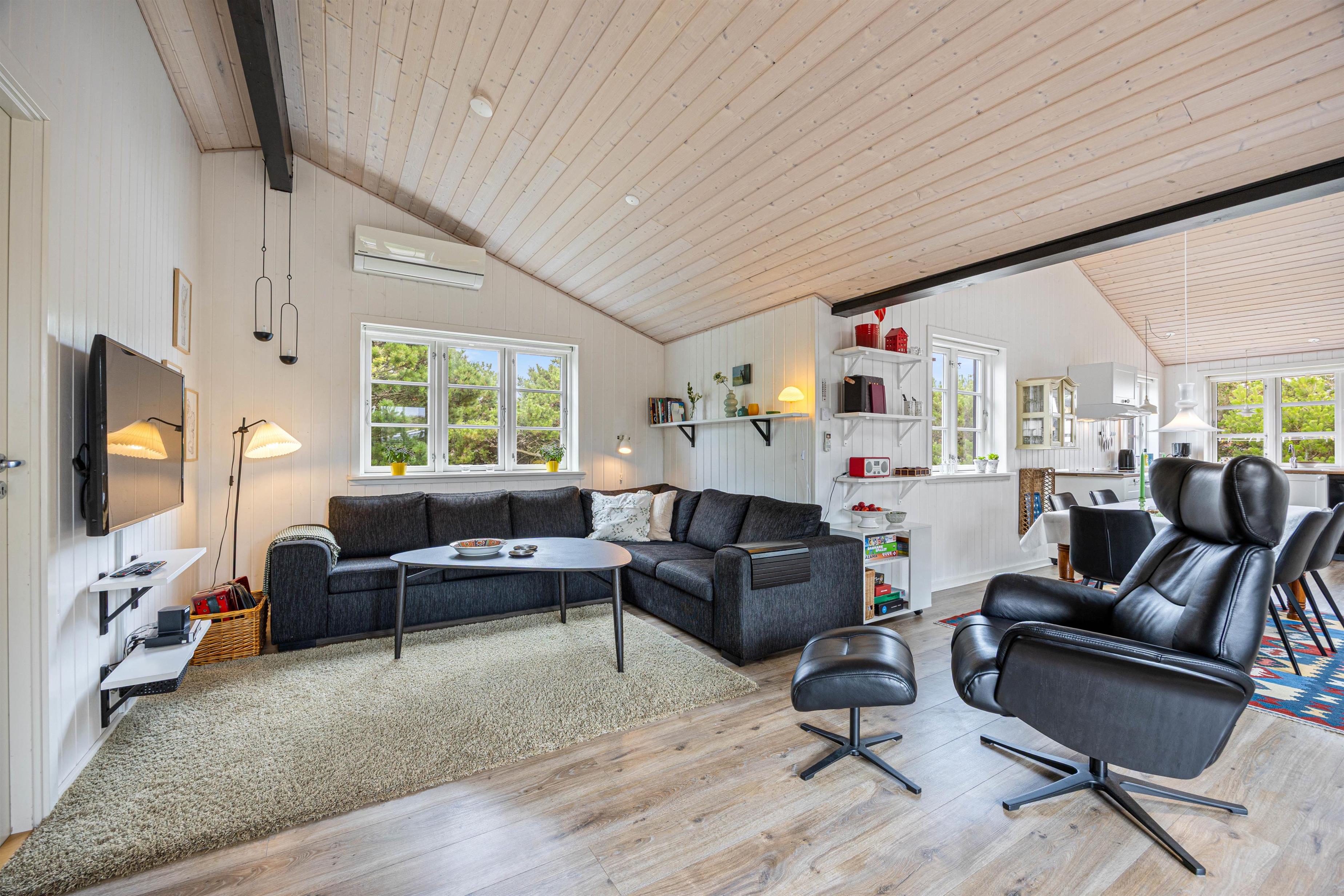 Sommerhuset har en varm og hjemlig atmosfære med personlige detaljer, der skaber den helt rette feriestemning. Køkken, spiseafdeling og stue ligger i åben forbindelse, så der er rig mulighed for at samles om madlavning, spil eller afslapning. Efter en dag fyldt med oplevelser kan I nyde en hyggelig aften foran den knitrende brændeovn, der giver både varme og ekstra hygge.