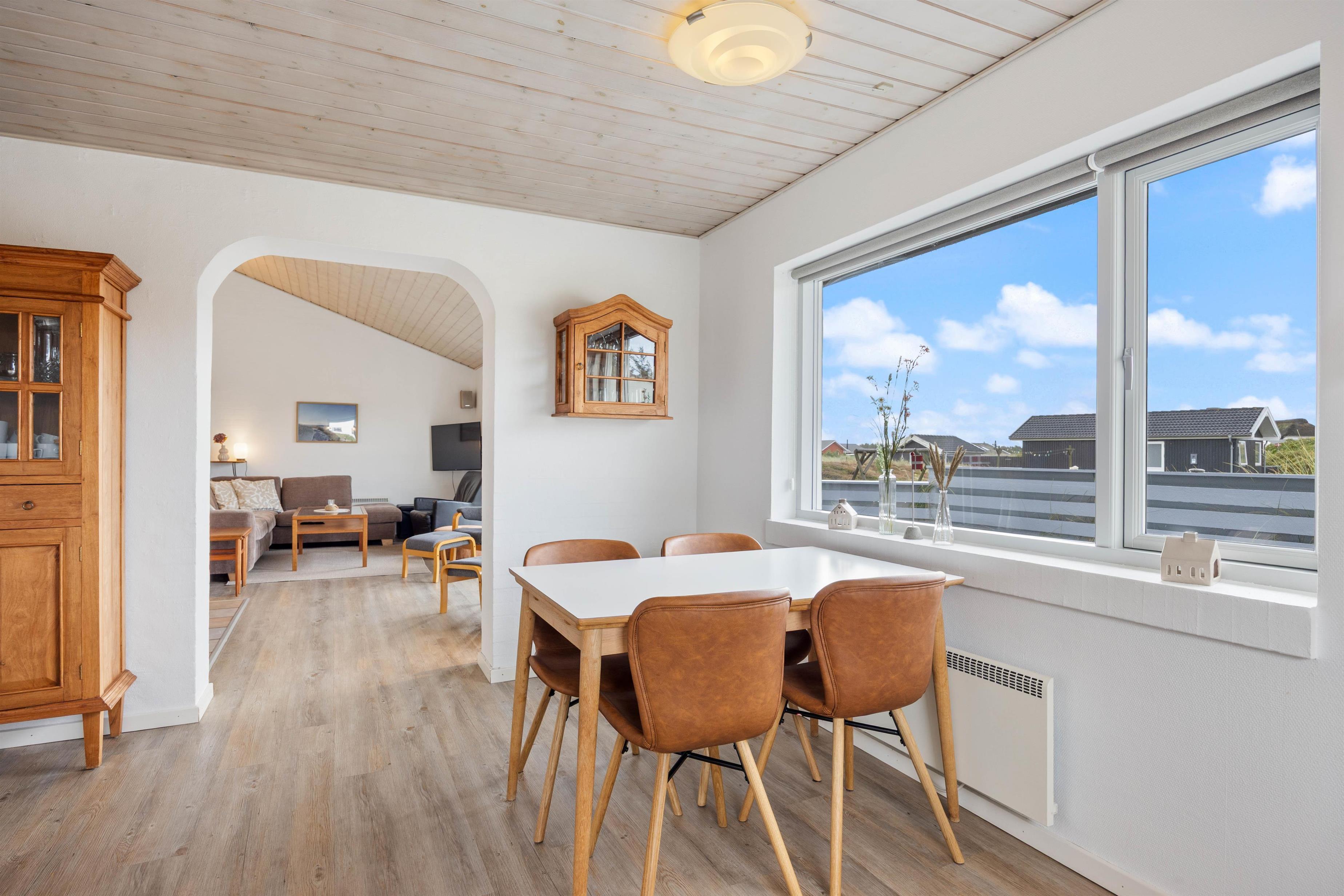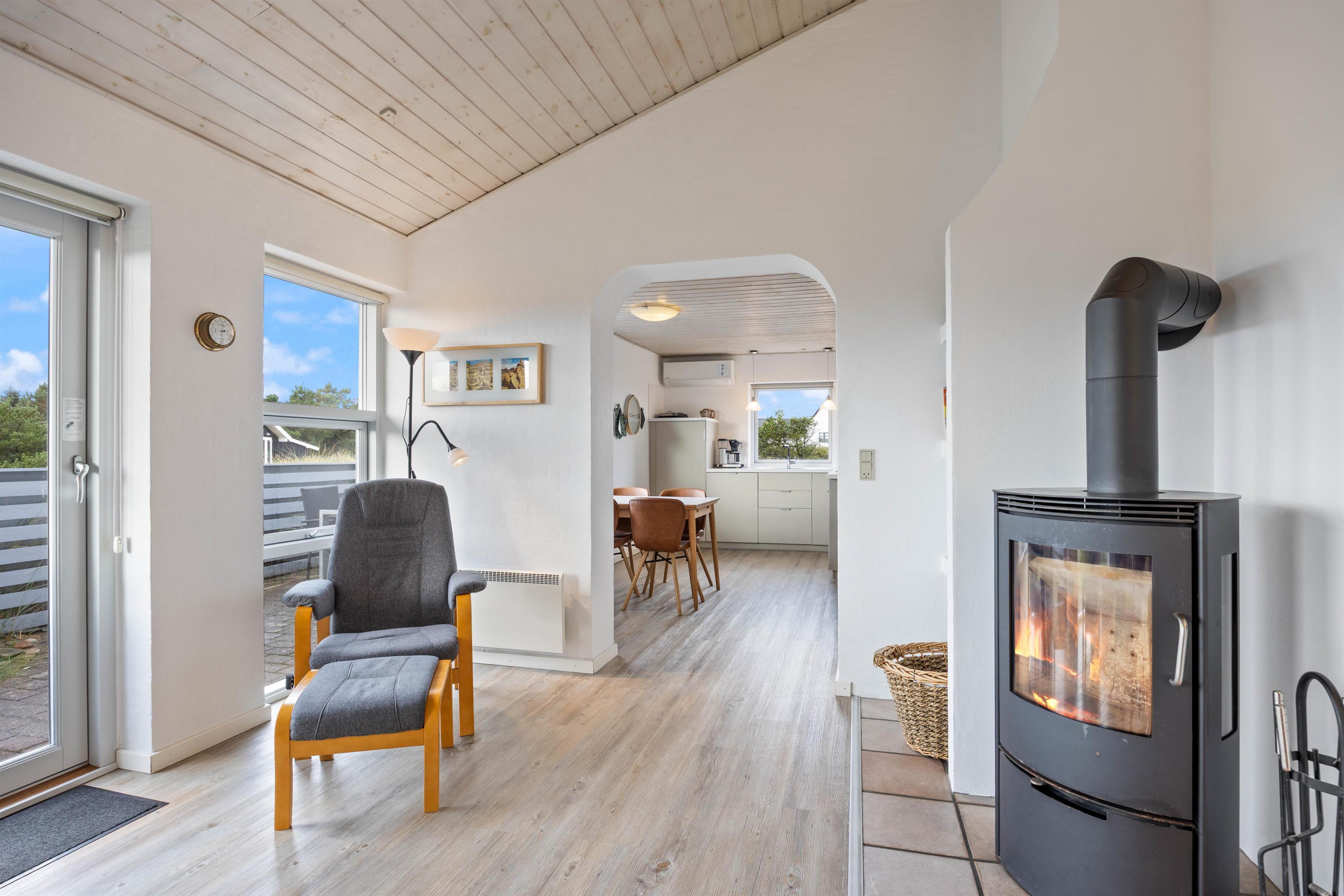 Her får I et solidt muret sommerhus, der er renoveret i 2025. Det lyse spisekøkken er husets hjerte, hvor I kan samles om madlavningen og feriens måltider. Fra køkkenet er der åben forbindelse til den hyggelige opholdsafdeling, hvor brændeovnen skaber en dejlig varm atmosfære – perfekt til kølige aftener med kortspil.
