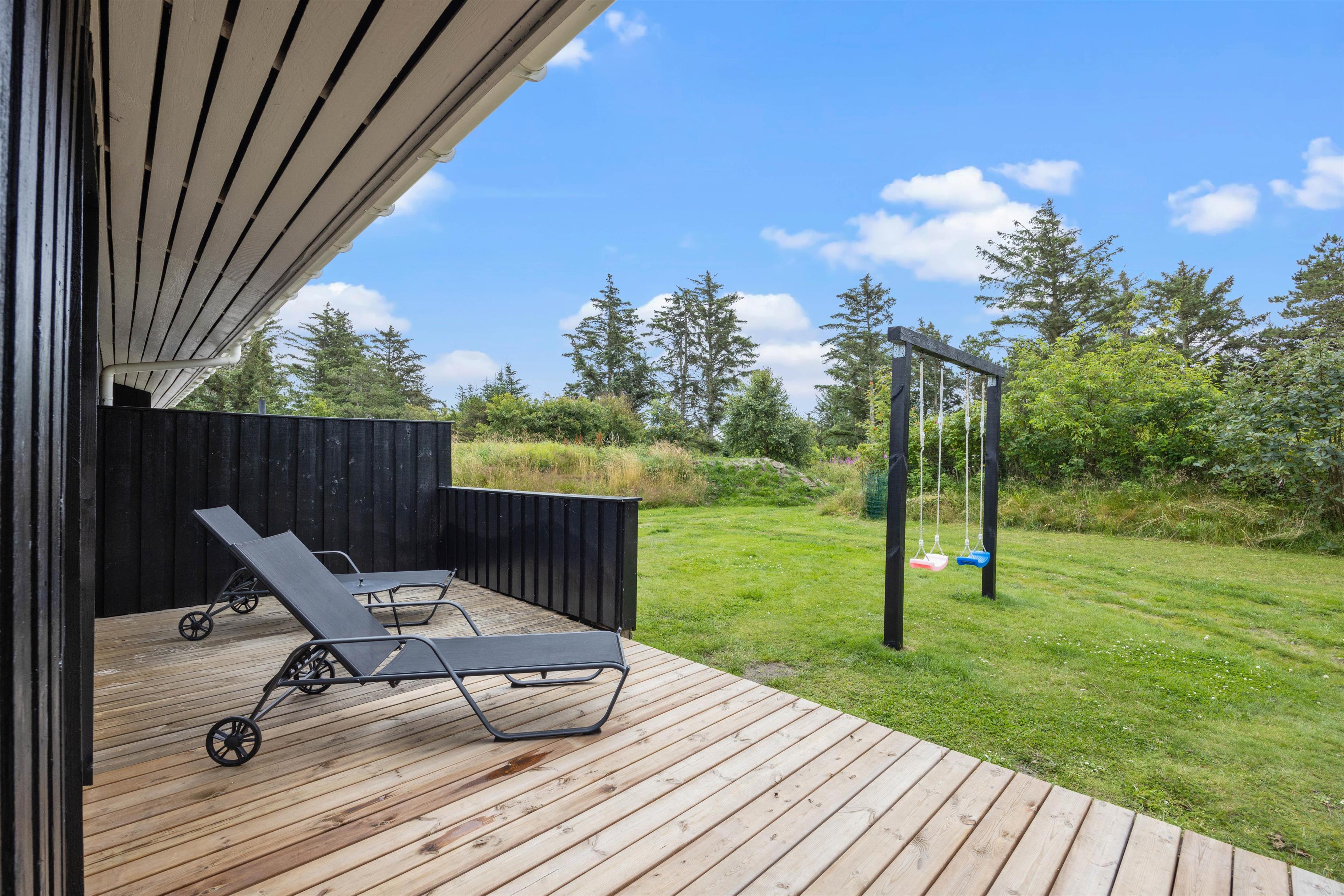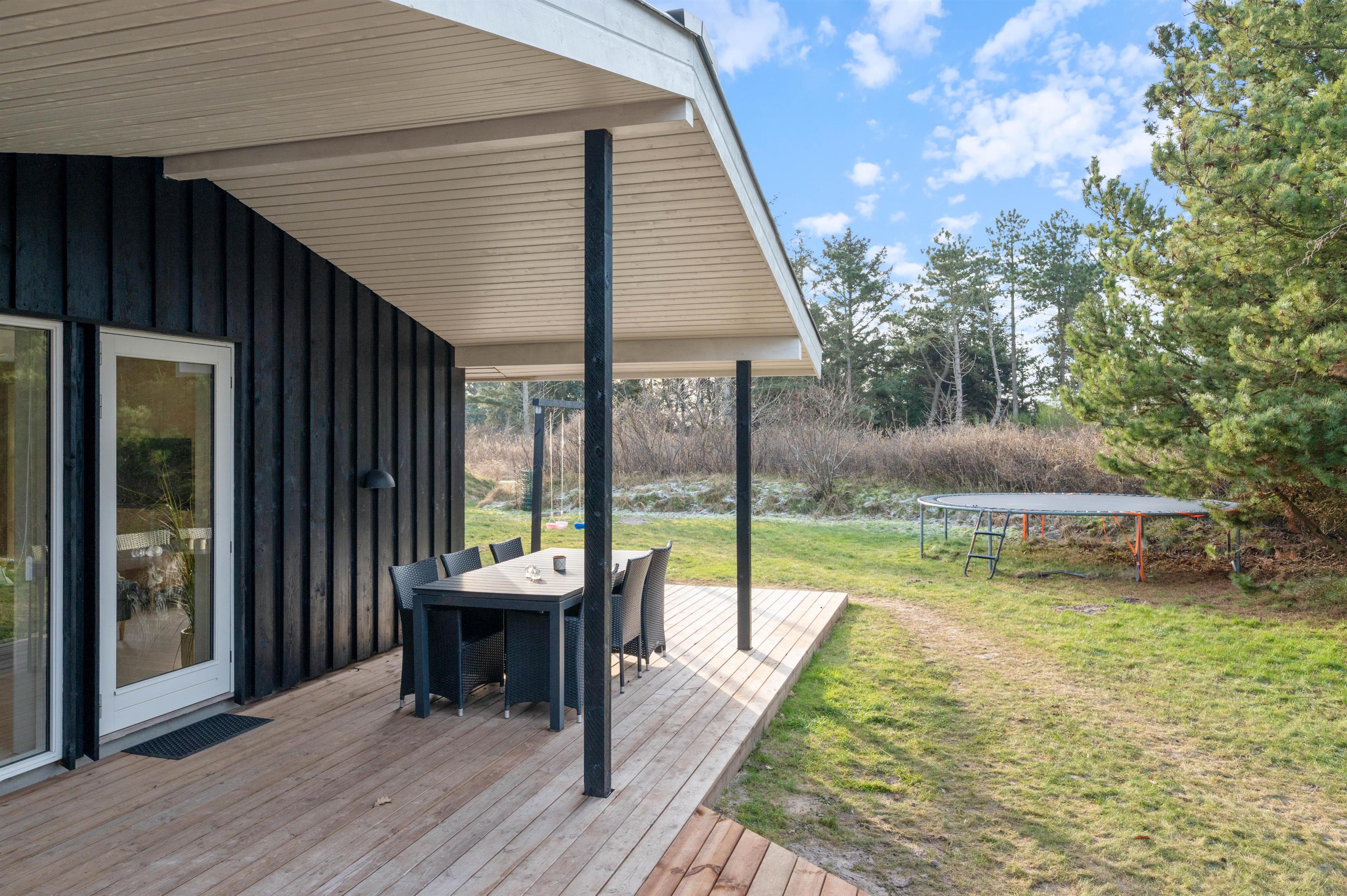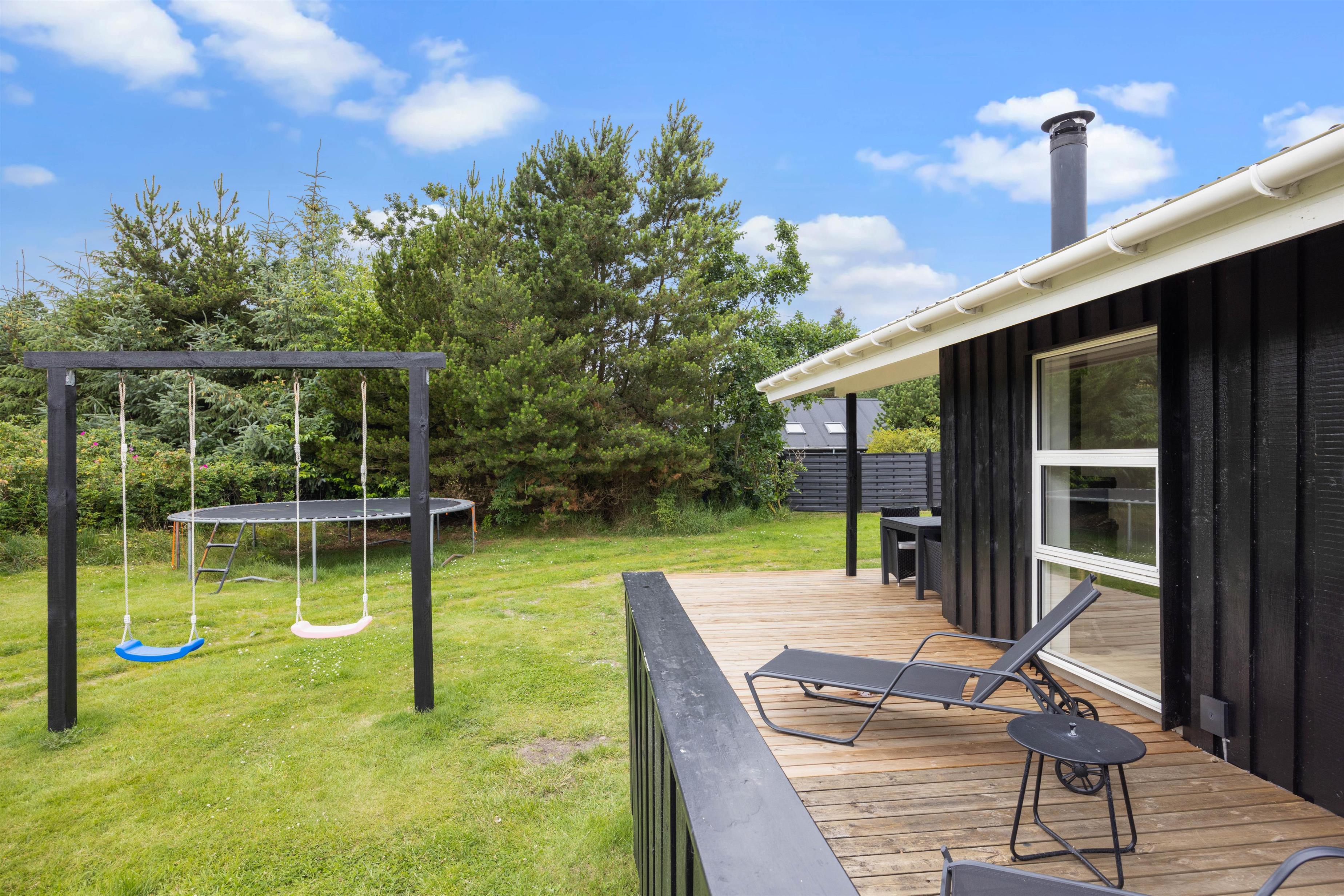 Buske og småtræer søger for, at sommerhuset har en fredelig og læfyldt beliggenhed. I kan derfor sidde helt uforstyrret på terrassen, mens børnene leger i haven. Plænen har masser af plads til boldspil og leg, og for de mindste børn er der et gyngestativ samt en trampolin. I er derfor sikret mange timers underholdning i uderummet ved sommerhuset. Der løber gode terrasser rundt om feriehuset, og overdækning og små afskærmning gør, at I altid kan finde en rolig lækrog.