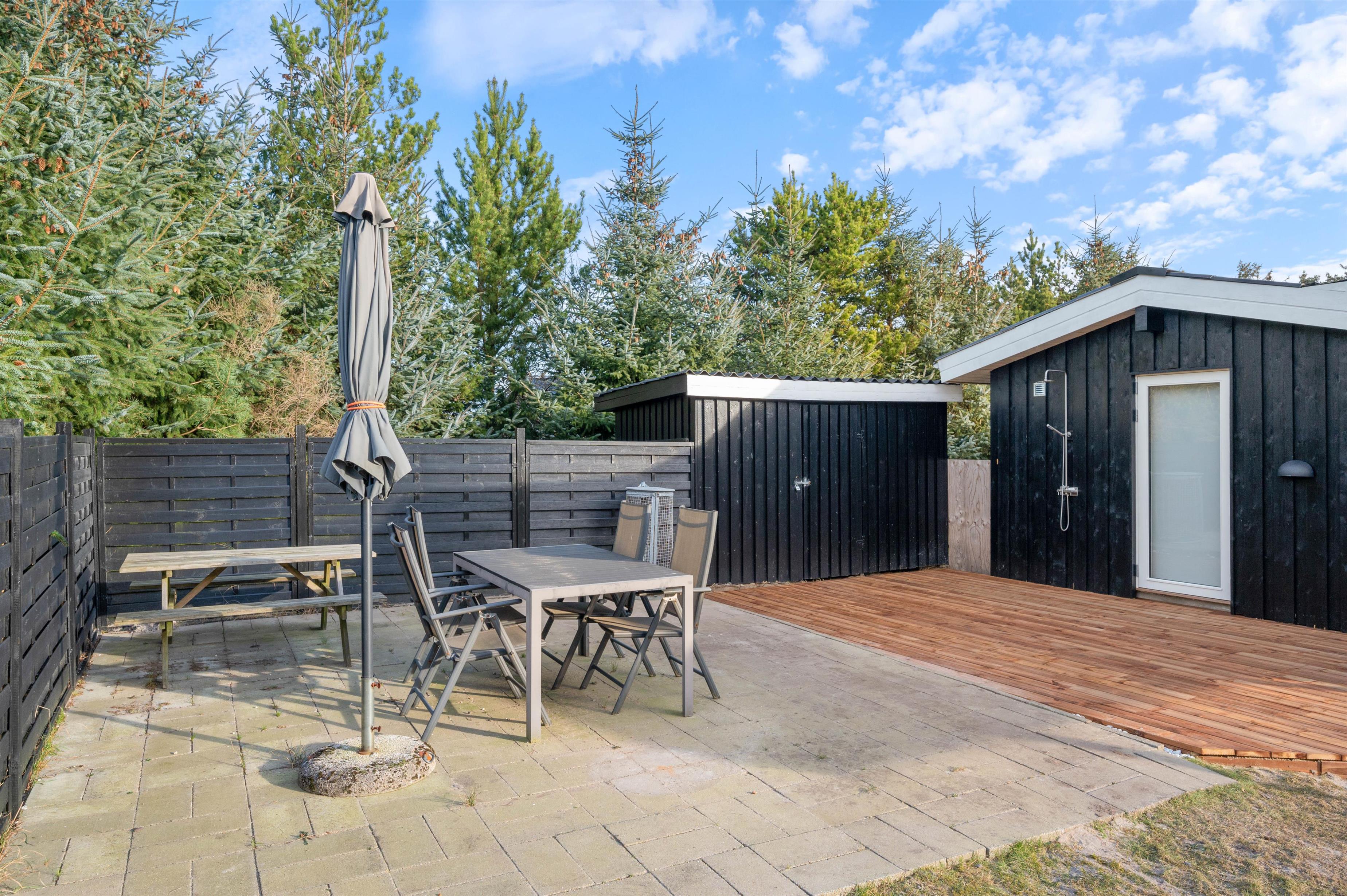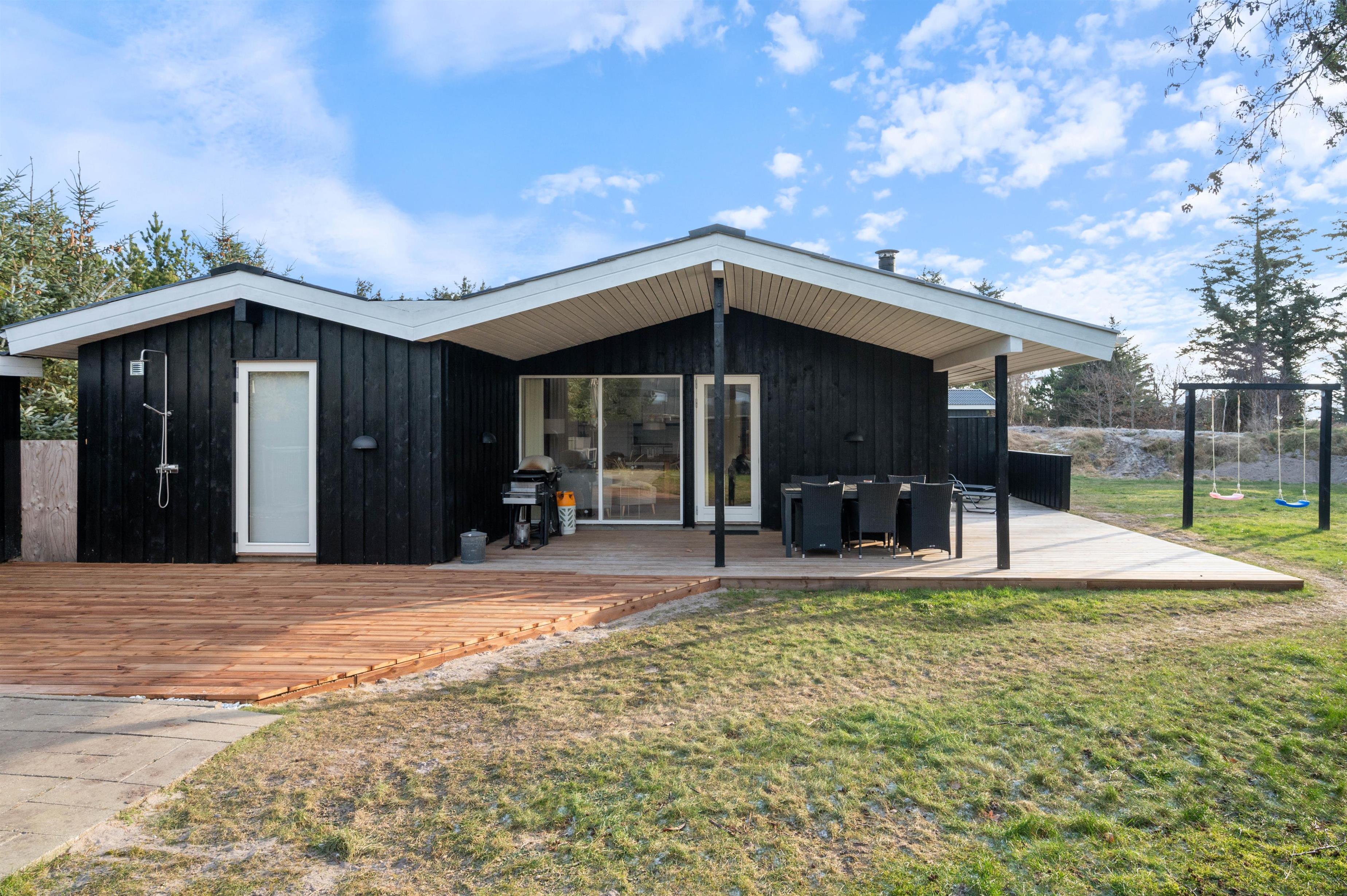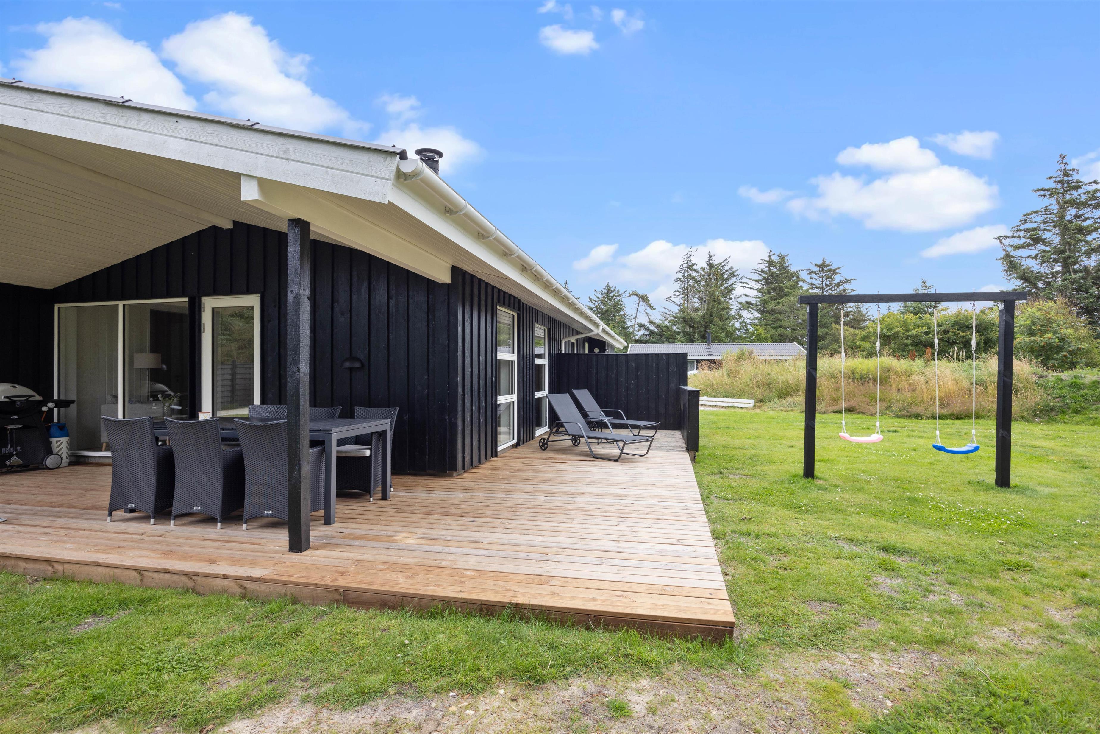 Buske og småtræer søger for, at sommerhuset har en fredelig og læfyldt beliggenhed. I kan derfor sidde helt uforstyrret på terrassen, mens børnene leger i haven. Plænen har masser af plads til boldspil og leg, og for de mindste børn er der et gyngestativ samt en trampolin. I er derfor sikret mange timers underholdning i uderummet ved sommerhuset. Der løber gode terrasser rundt om feriehuset, og overdækning og små afskærmning gør, at I altid kan finde en rolig lækrog.
