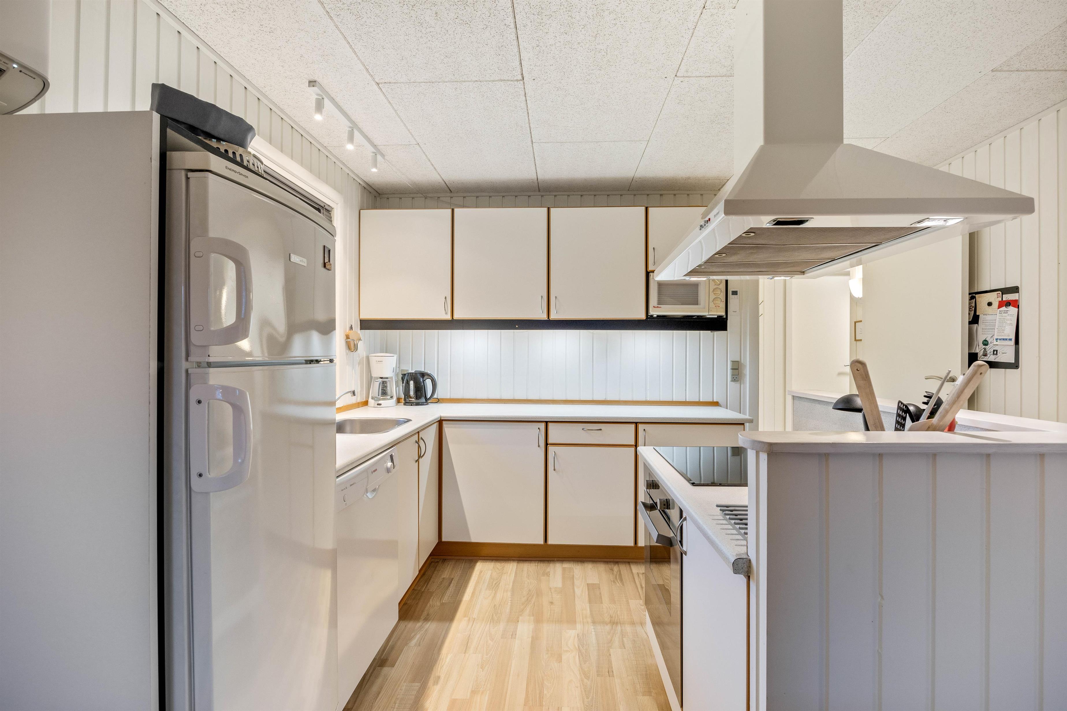 Sommerhusets køkken ligger i åben forbindelse til spiseplads og stue, hvor der er en brændeovn. Her kan I samles til et spil kort, mens ilden knitrer i baggrunden på en regnfuld efterårsaften.