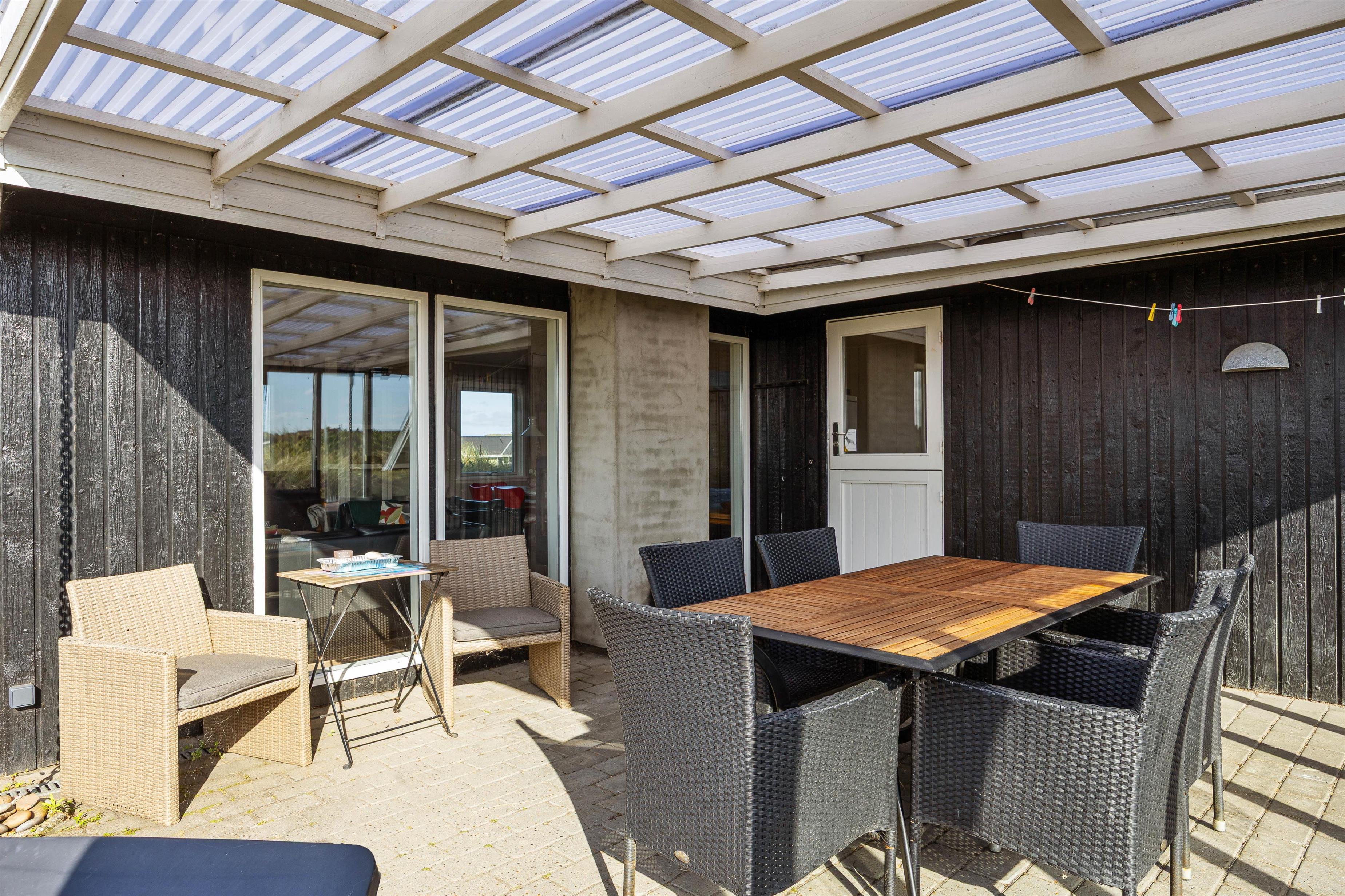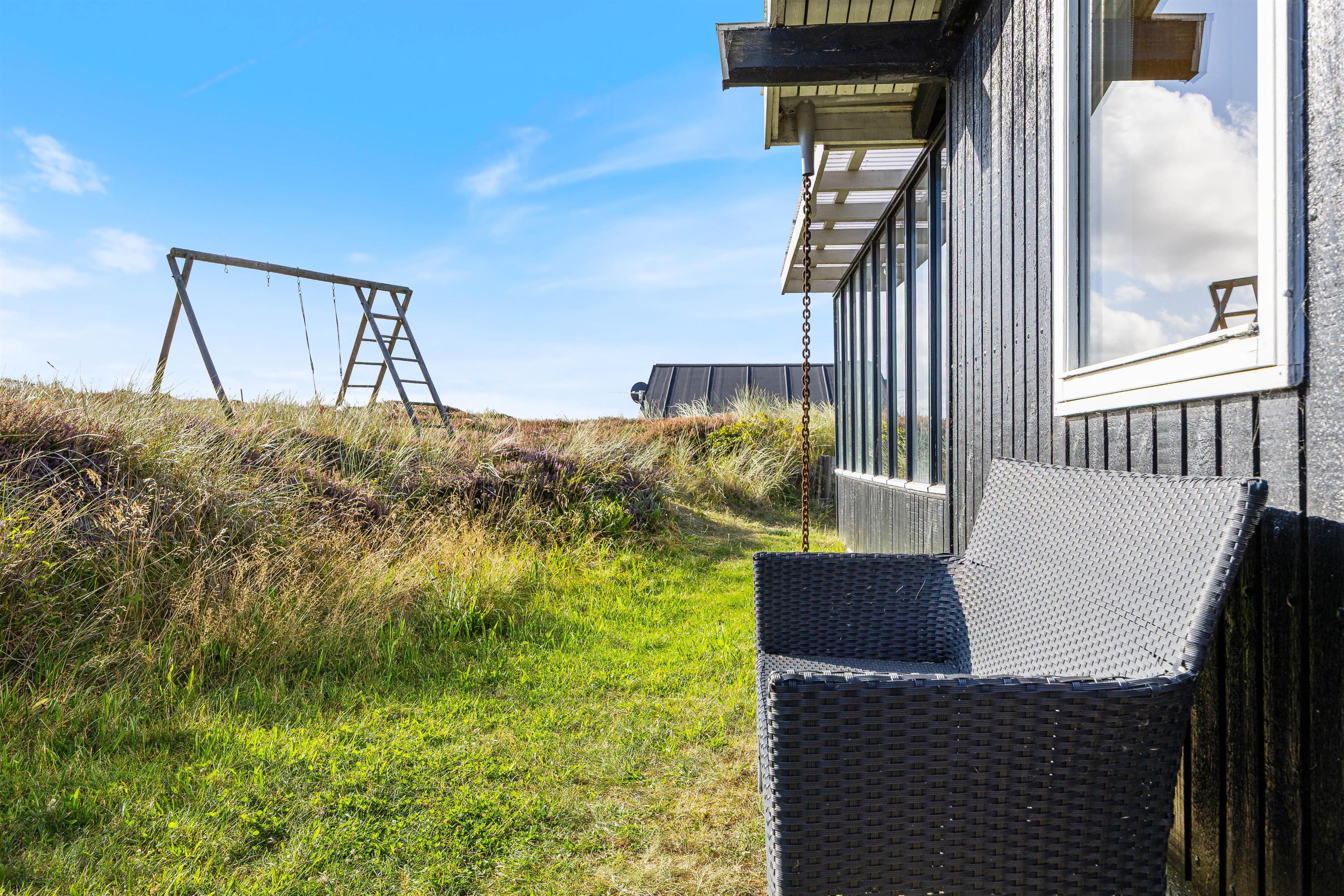 På sommerhusets både overdækkede og afskærmede terrasse kan I nyde en frisklavet kop kaffe, imens børnene slår sig løs på den store naturgrund med tilhørende gynger. Skinner solen, kan I trække jer ud og nyde strålerne derfra på sommerhusets havemøbler og liggestole.
