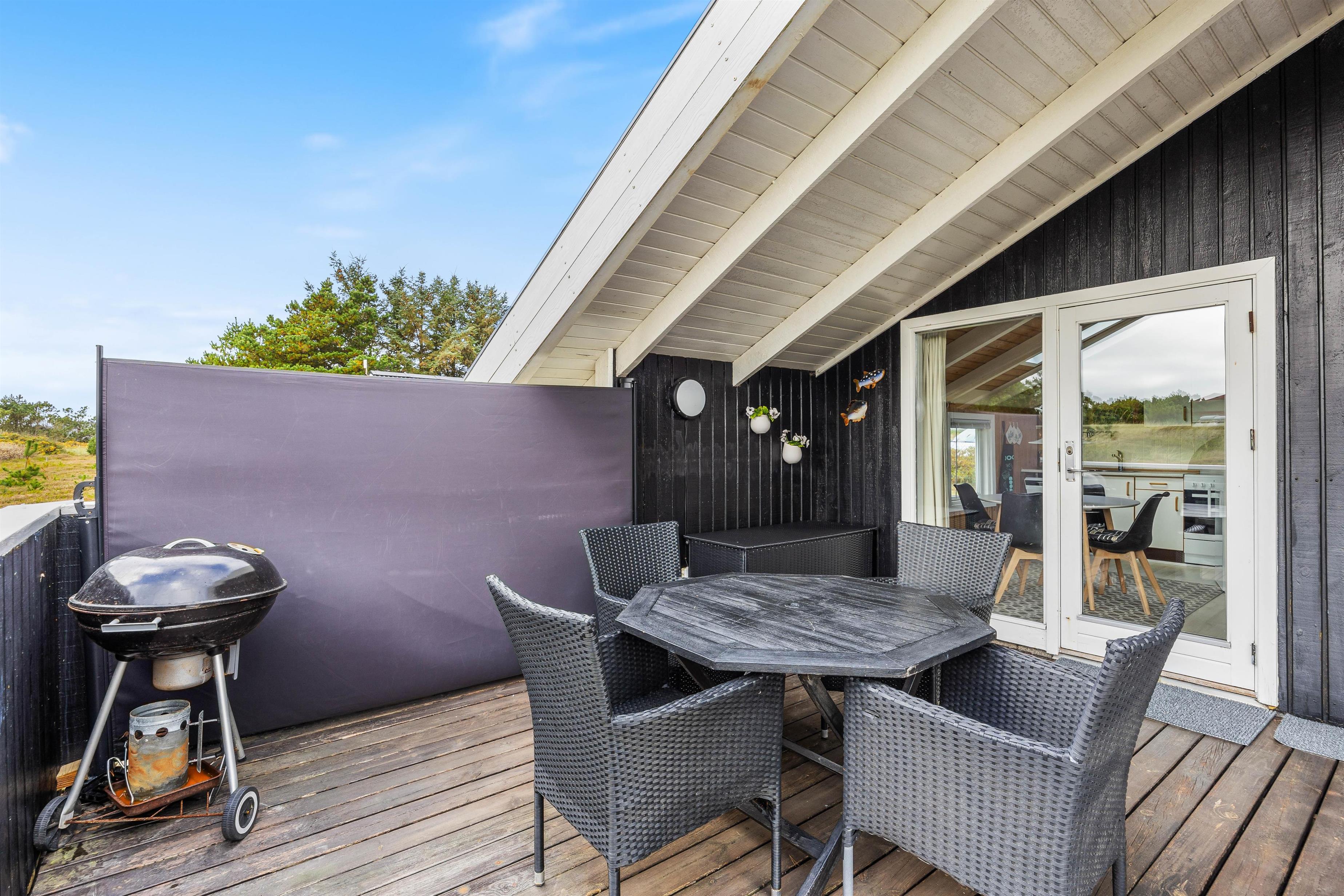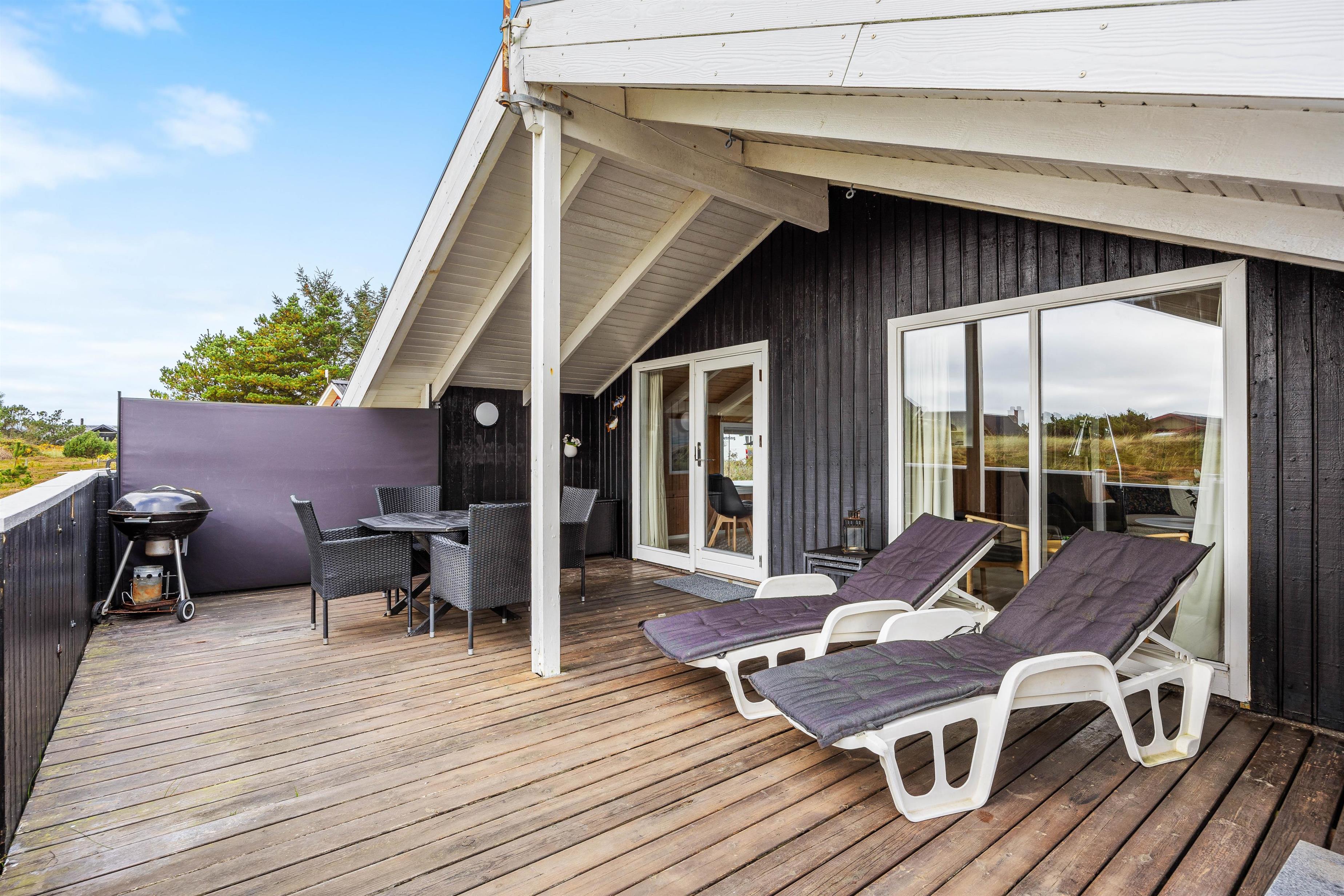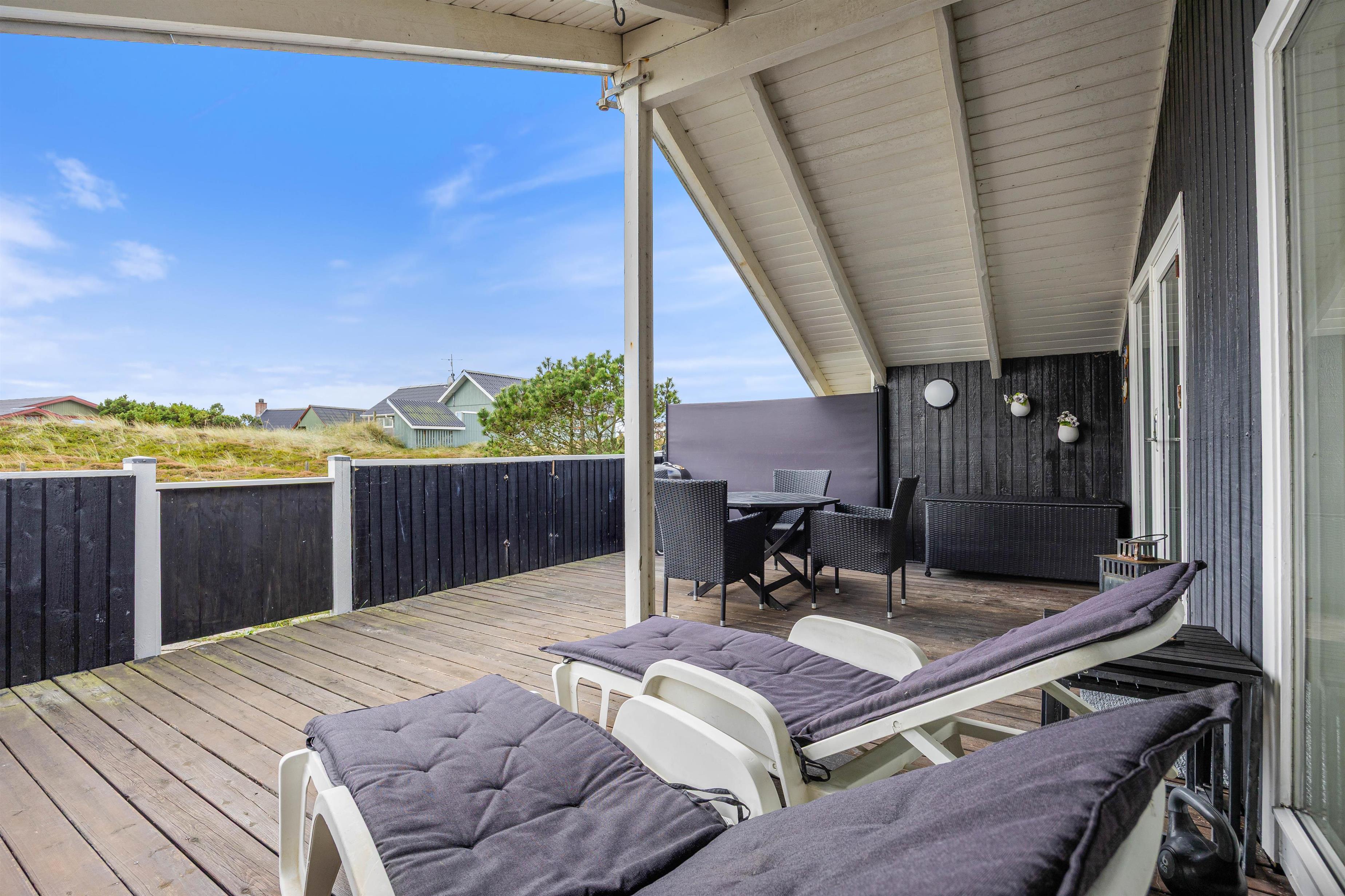 Også udenfor byder sommerhuset i Bjerregård på flere muligheder for at nyde den friske luft fra Vesterhavet. Der er et afskærmet- og et overdækket terrasseafsnit, samt en lukket terrasse, som tilbyder et lunt sted at være på alle tider af døgnet. Møblerne indbyder til at slappe af og nyde livet – hvad enten det er til morgenmad i morgensolen eller en rolig aften i det fri.