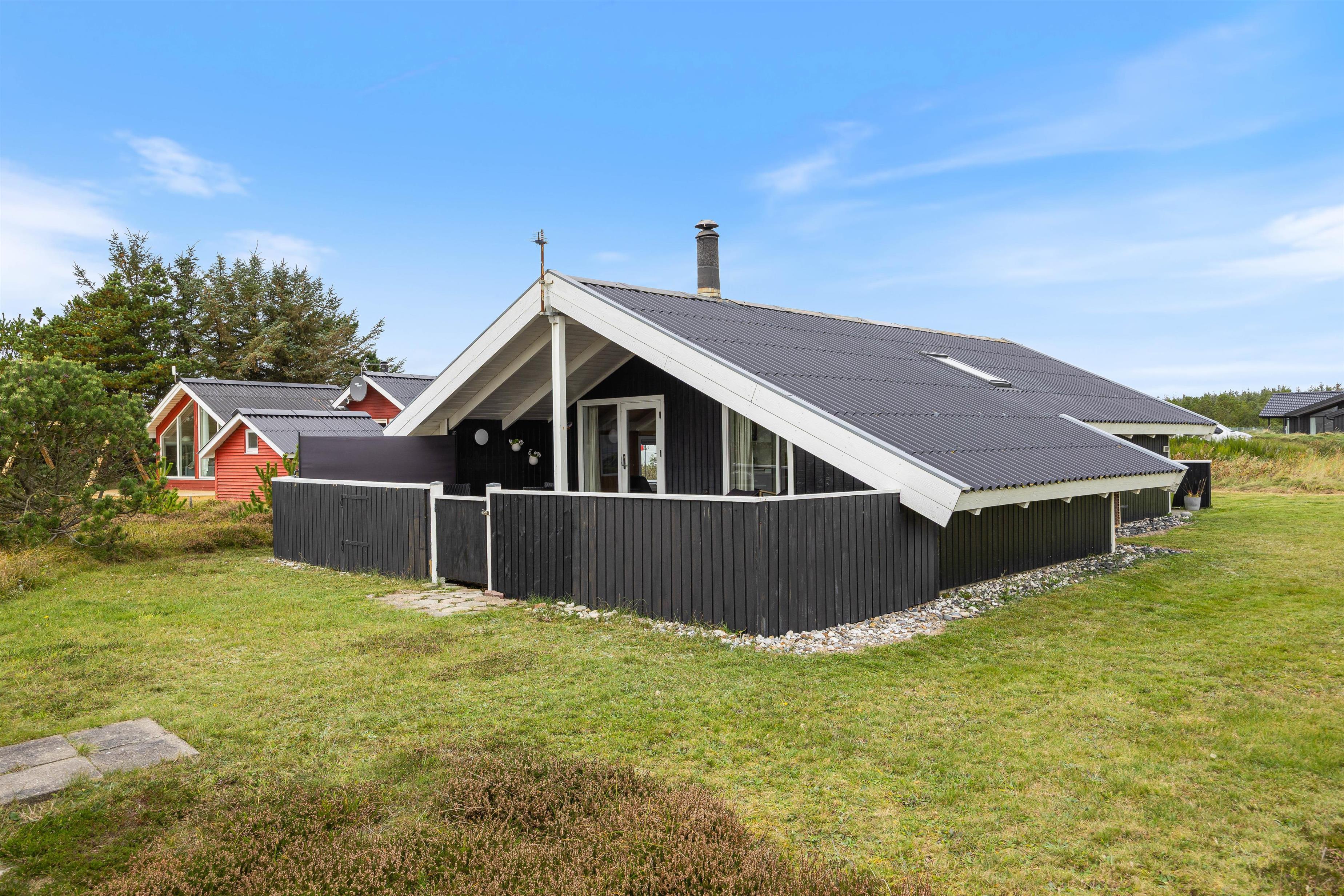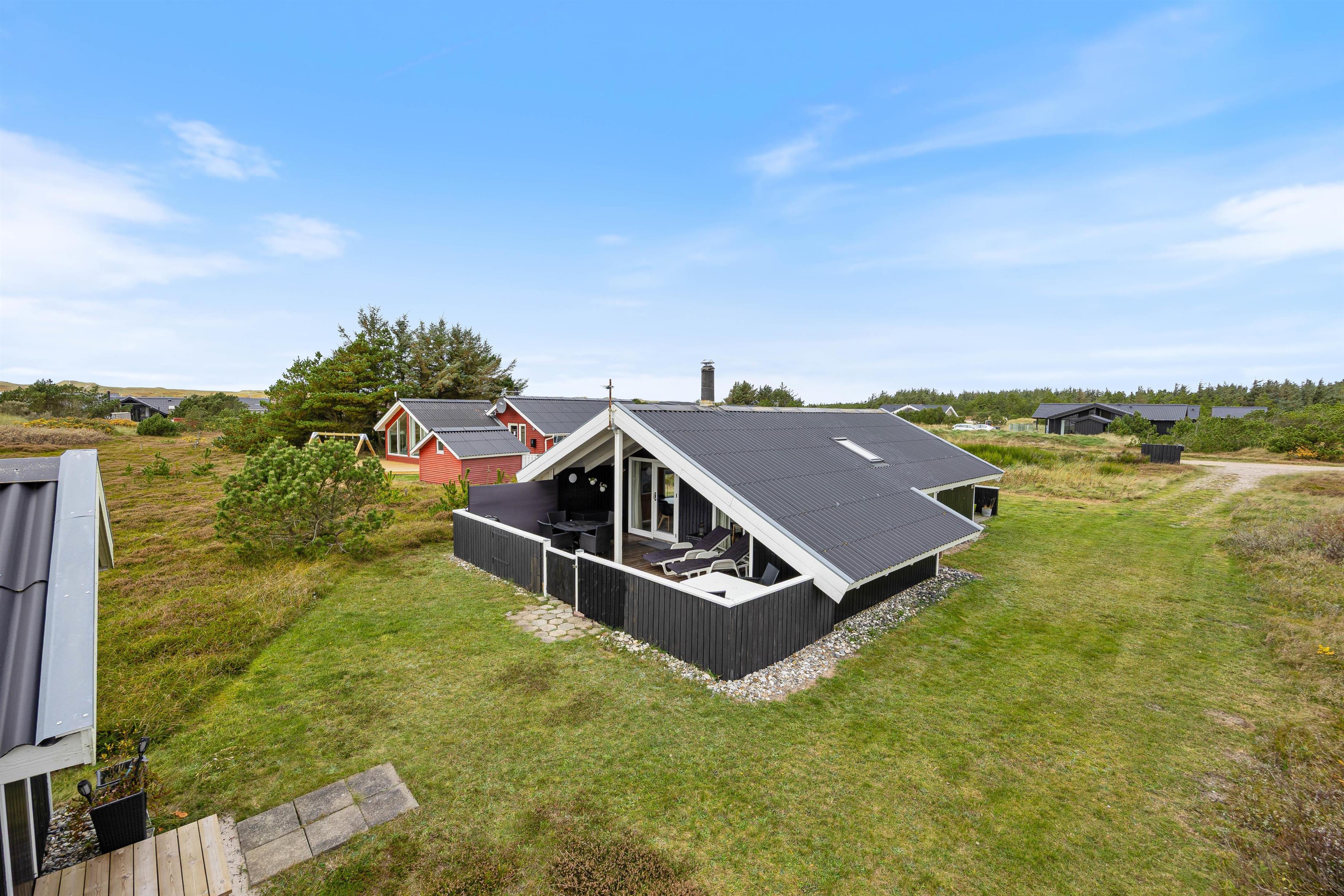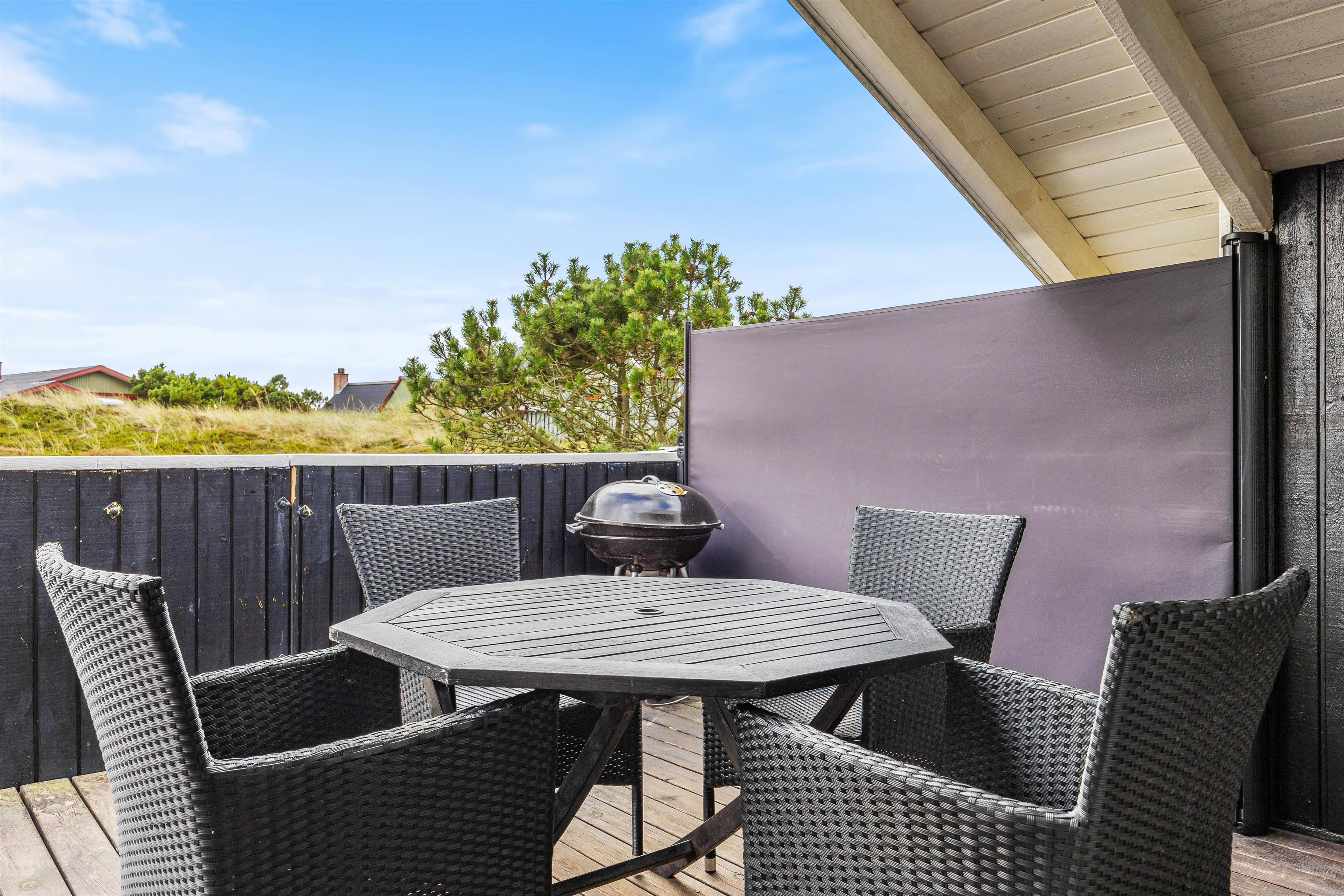 Også udenfor byder sommerhuset i Bjerregård på flere muligheder for at nyde den friske luft fra Vesterhavet. Der er et afskærmet- og et overdækket terrasseafsnit, samt en lukket terrasse, som tilbyder et lunt sted at være på alle tider af døgnet. Møblerne indbyder til at slappe af og nyde livet – hvad enten det er til morgenmad i morgensolen eller en rolig aften i det fri.