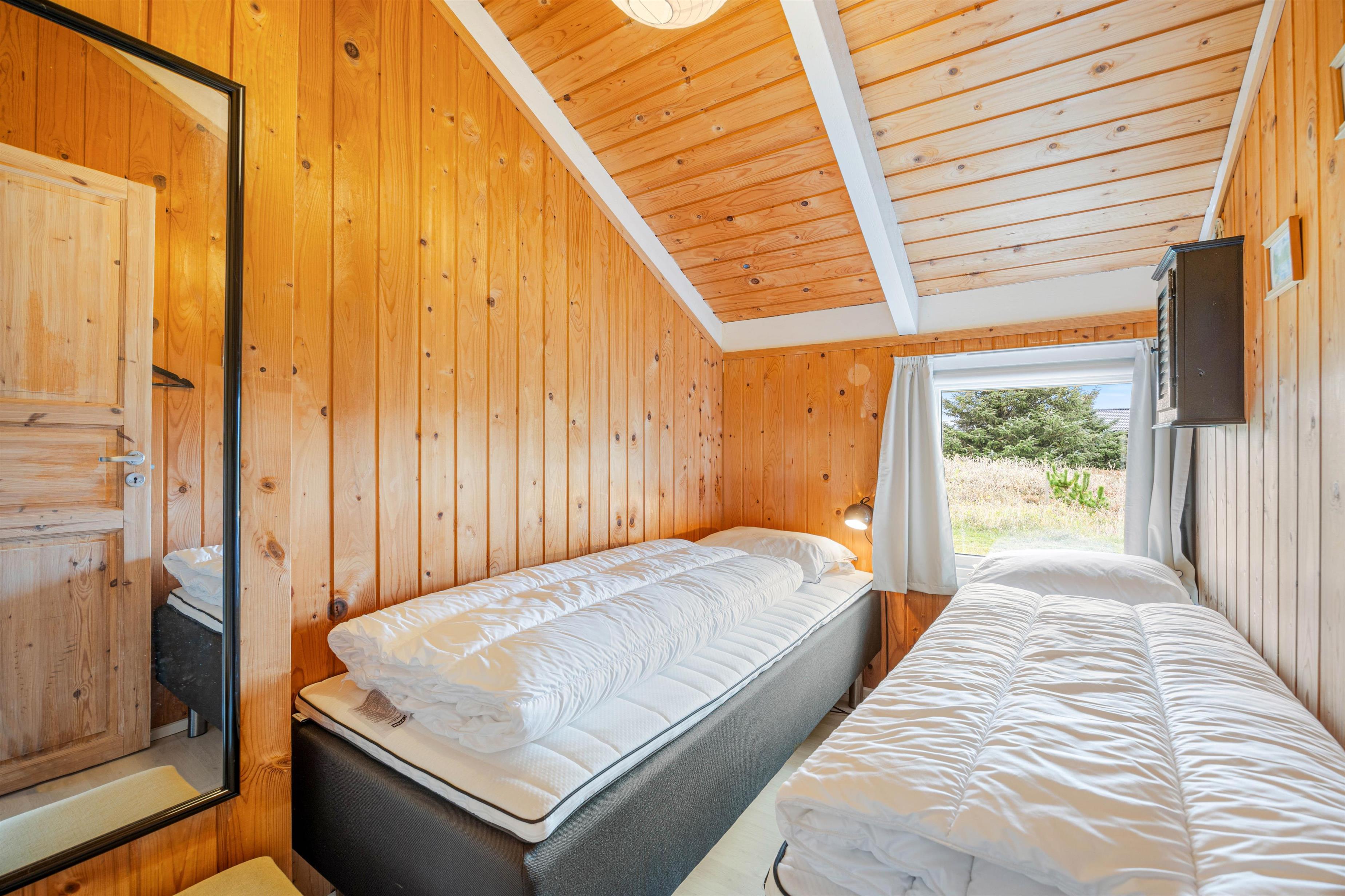 Sommerhuset har 3 soveværelser: 1 værelse med 2 enkeltsenge, 1 værelse med dobbeltseng, mens det tredje har en køjeseng med plads til børn eller enkeltpersoner. Bemærk, at de to enkeltsenge er lidt forskellige i længden – den ene måler 190 cm, den anden 200 cm, og at madrasserne i køjesengen måler 70 x 180 cm. Badeværelset er enkelt, men funktionelt indrettet og har brusebad, håndvask og toilet – perfekt til de daglige behov.