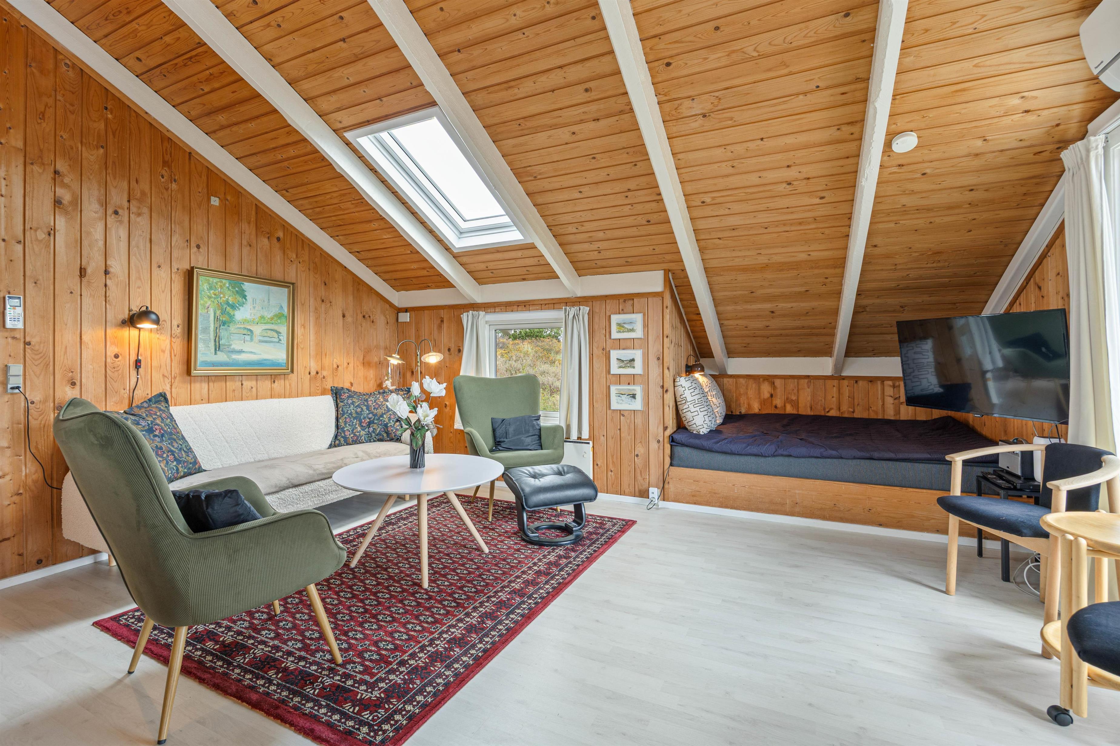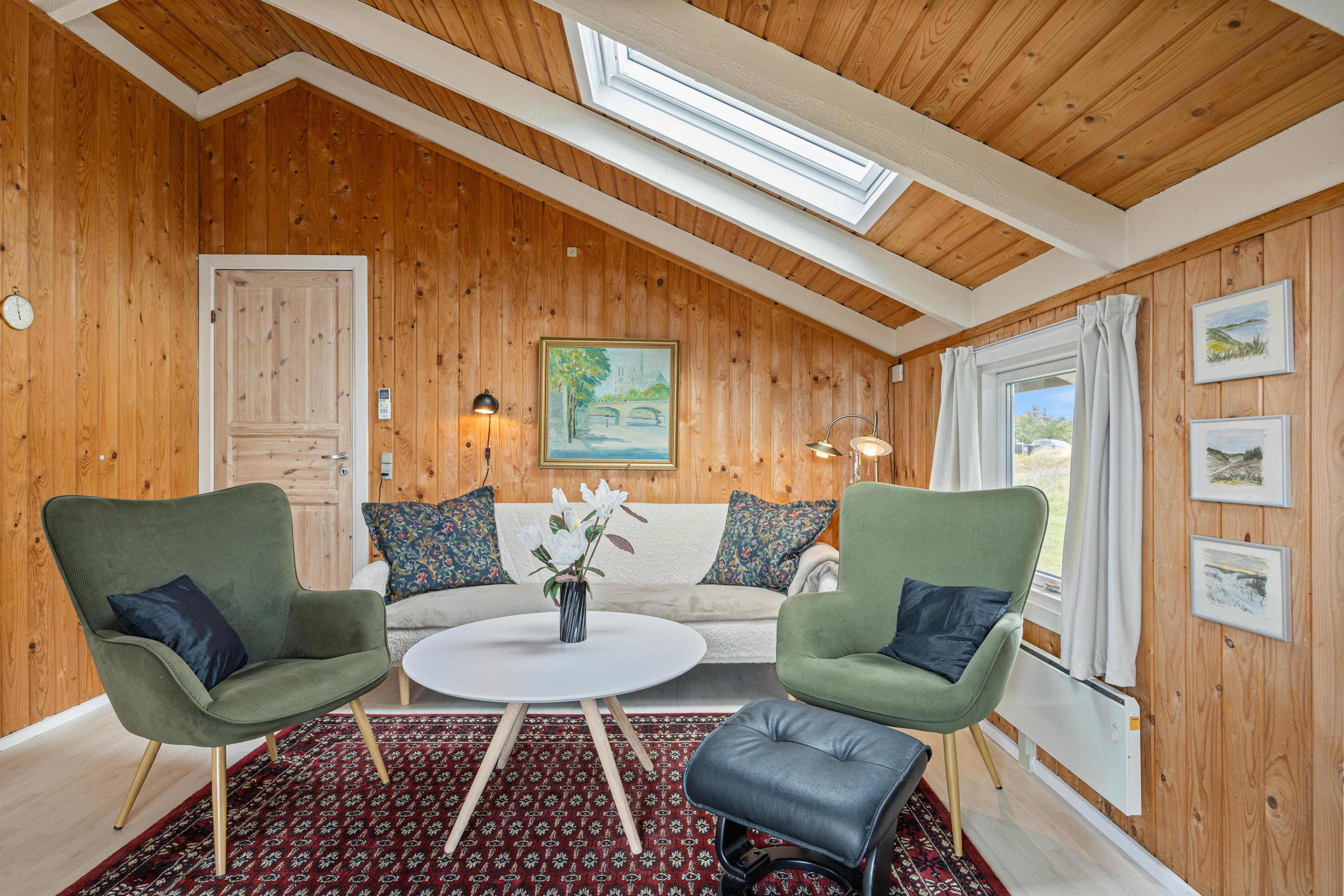 Indretningen af feriehuset er enkel, men praktisk. Stuen har en brændeovn, der skaber hygge på kølige dage, samt en varmepumpe, der sikrer et behageligt indeklima. Det lille køkken er åbent integreret i stuen og udstyret med opvaskemaskine, komfur, ovn og de vigtigste køkkenredskaber – ideelt til at tilberede måltider sammen.