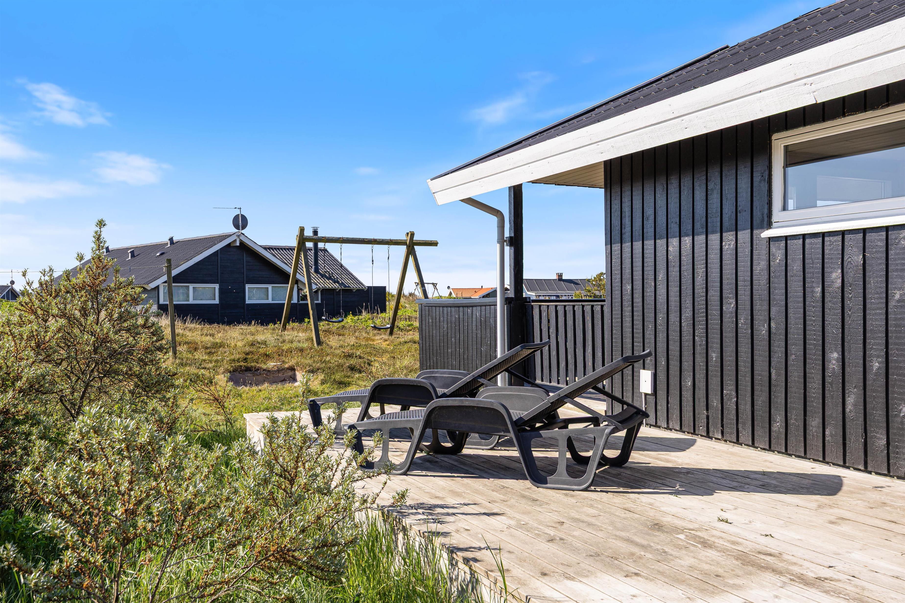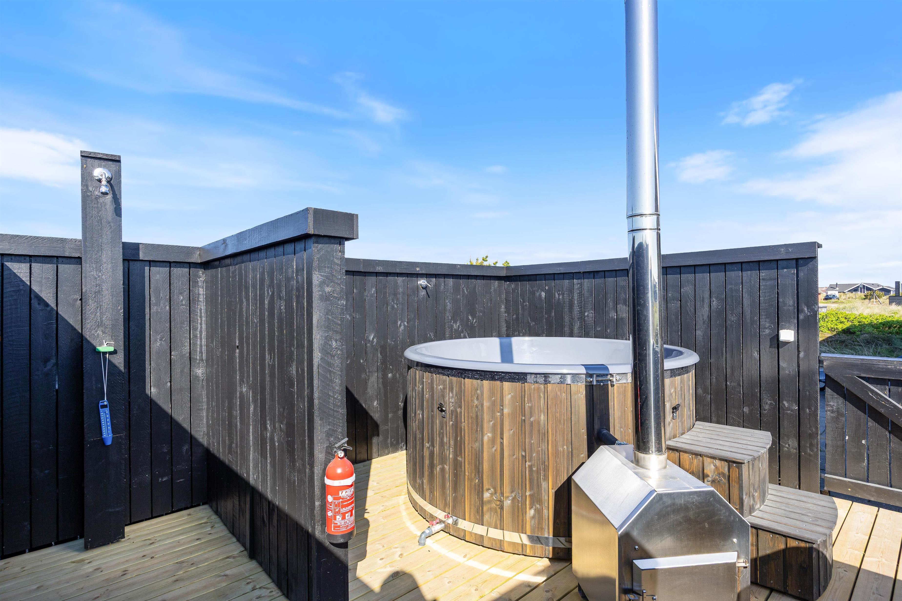 Terrassen indbyder både til solbadning på liggestolene og langstrakte grillaftner. De moderne havemøbler sørger for god komfort, mens overdækningen gør det muligt at nyde aftnerne udendørs lidt længere end ellers. Et af sommerhusets højdepunkter er vildmarksbadet og udebruseren. Udebruseren kan benyttes fra april til november.