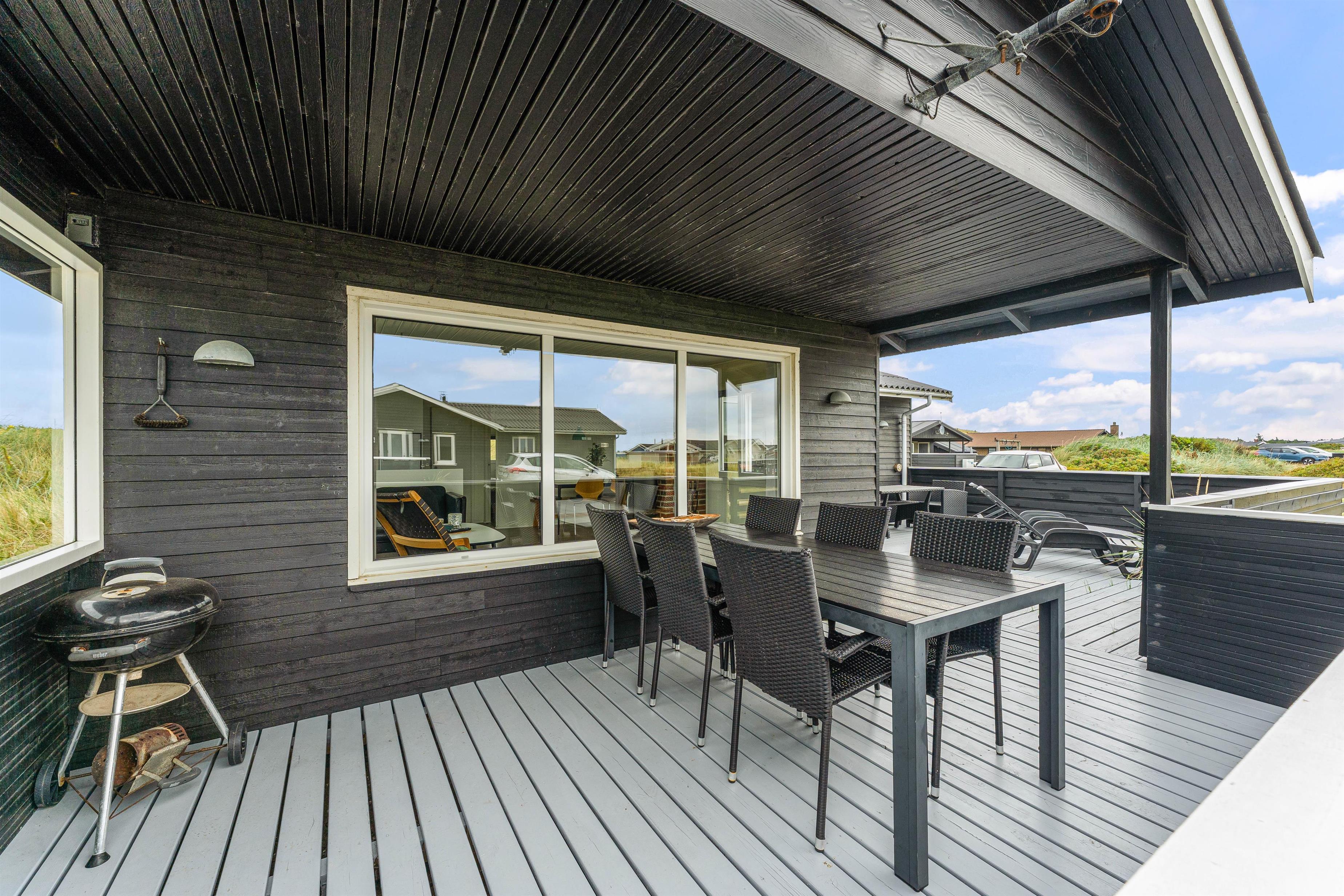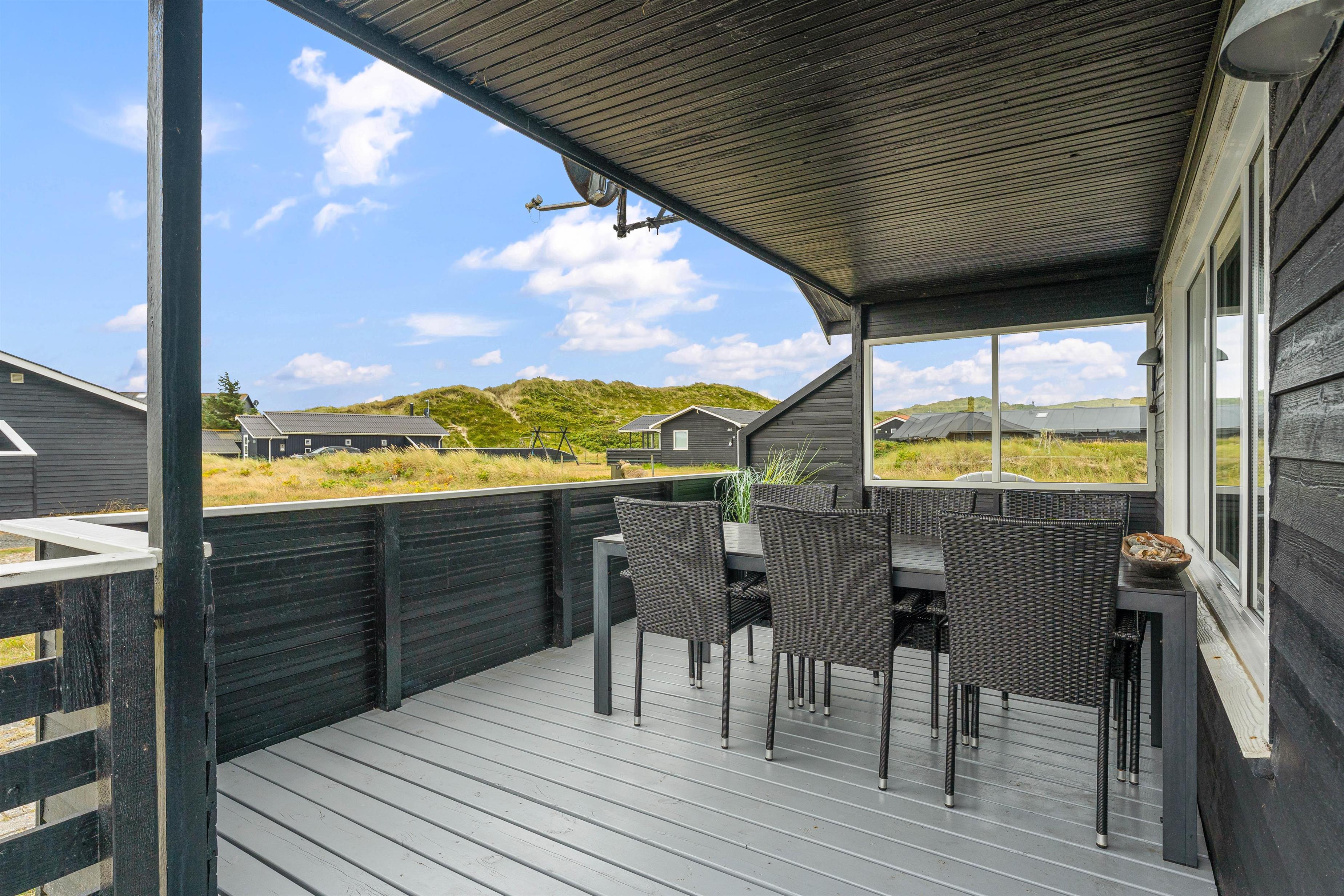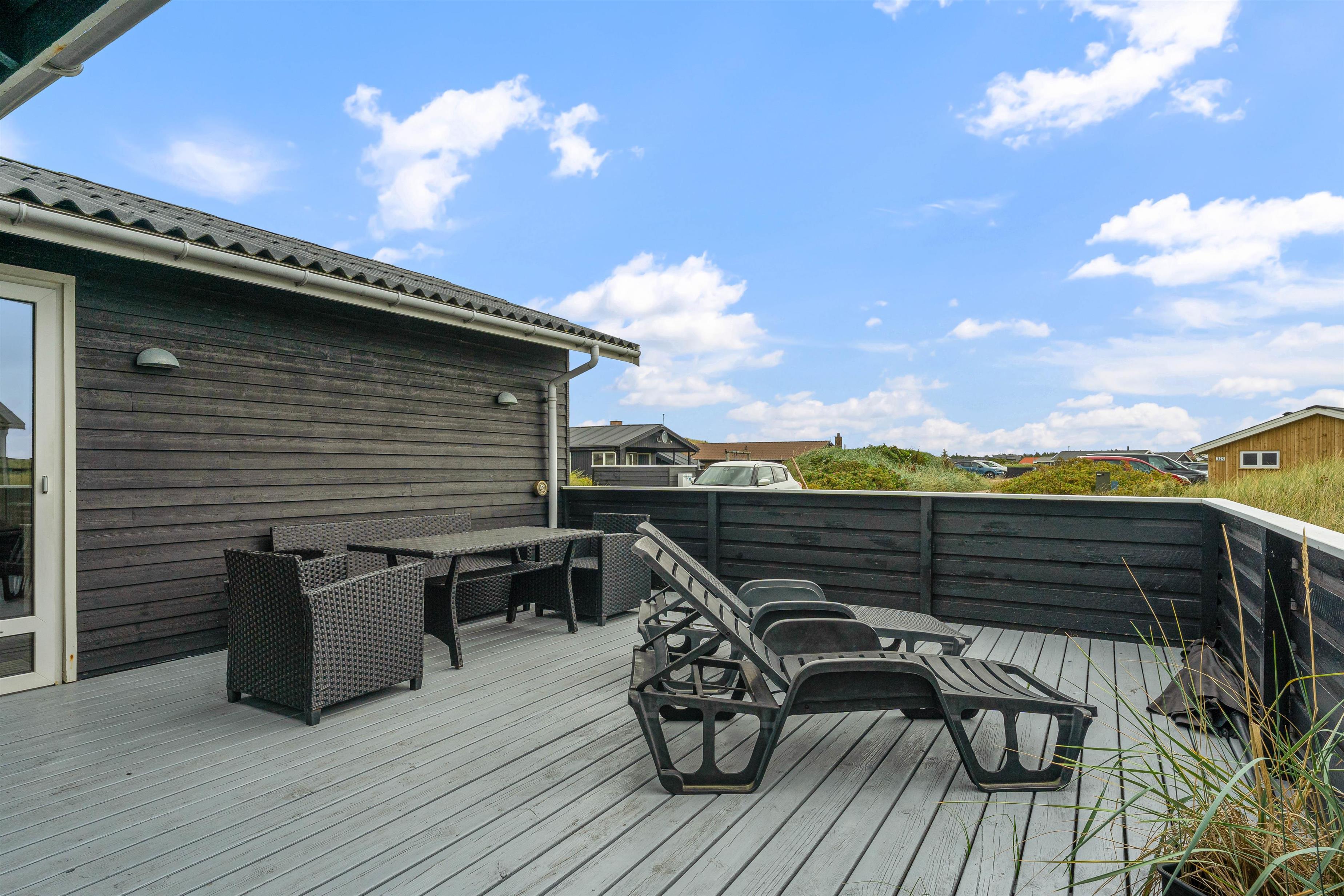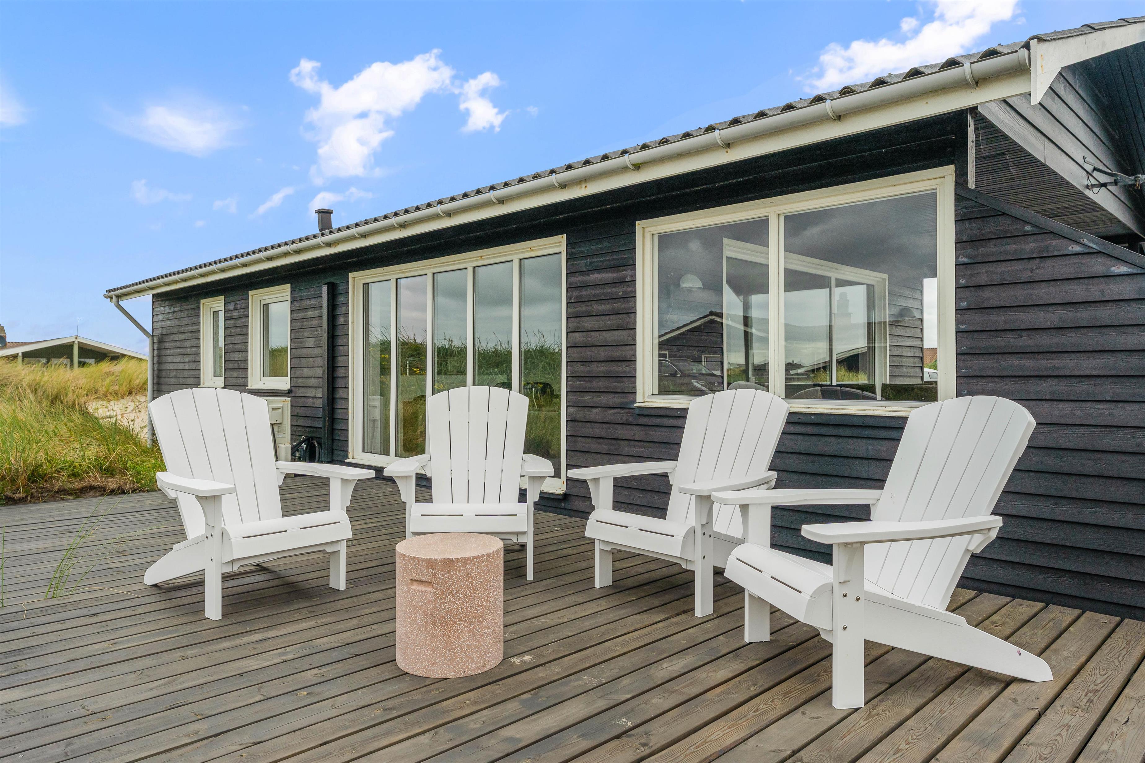 Den lukkede terrasse ved sommerhuset er ideel til småbørnsfamilier, eller hvis du har hund med. Her kan I slappe af i de komfortable liggestole eller hygge jer sammen i havemøblerne. Der er gode kroge, så I kan finde skygge eller læ, når I har brug for det. Med kun 200 meter til Vesterhavet, må I naturligvis også besøge den kilometerlange sandstrand og måske dyppe tæerne i det brusende Vesterhav.