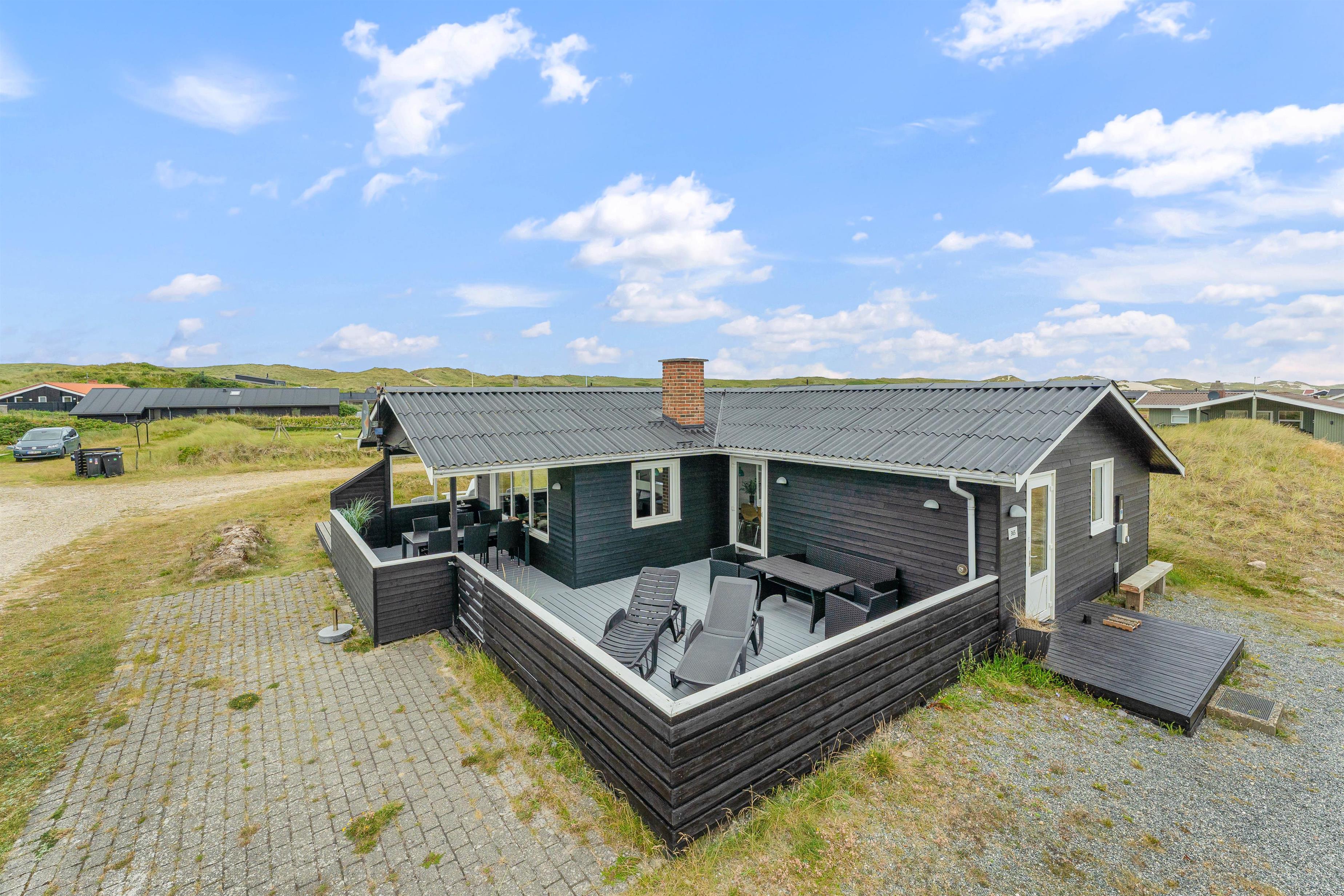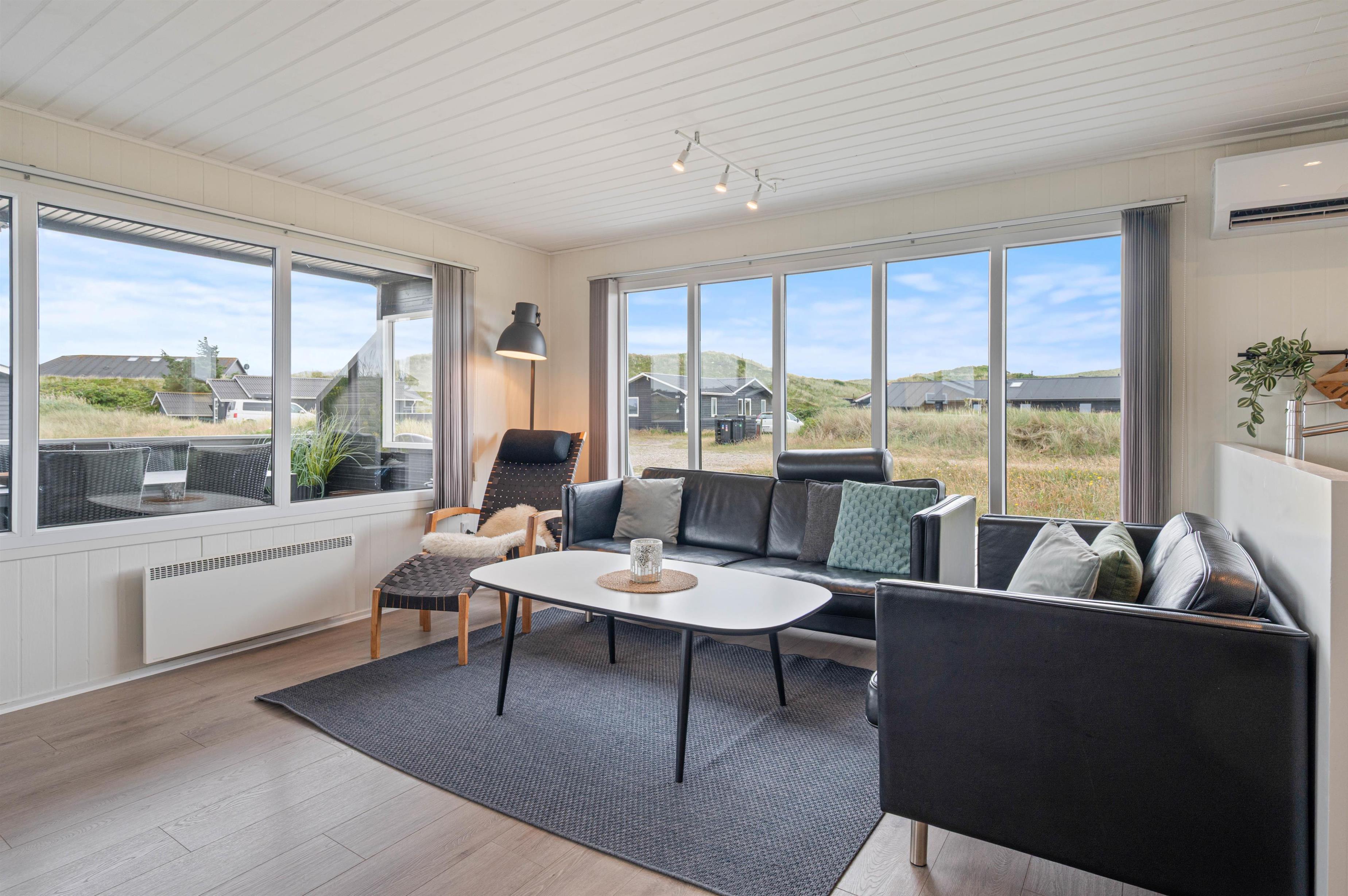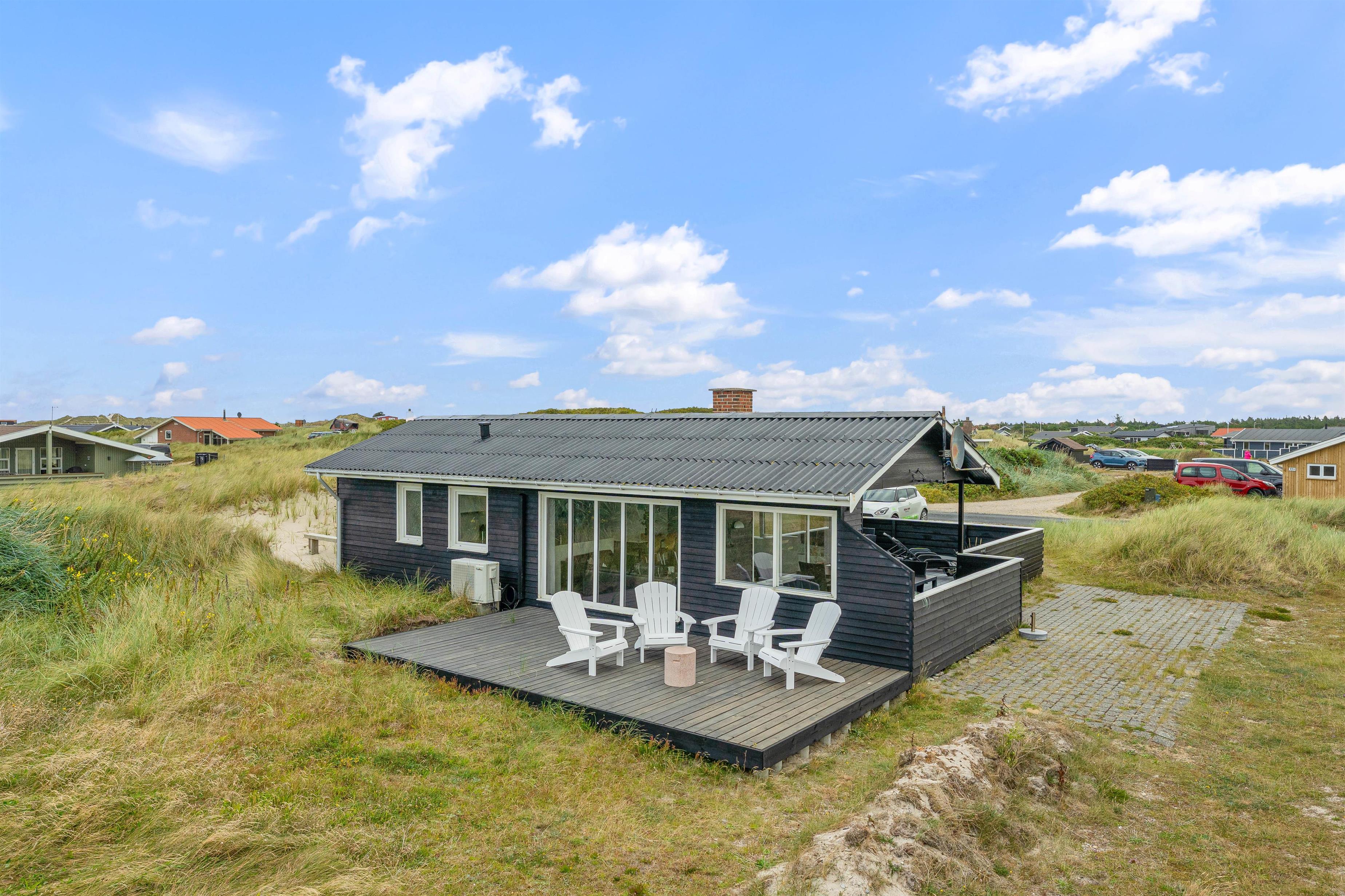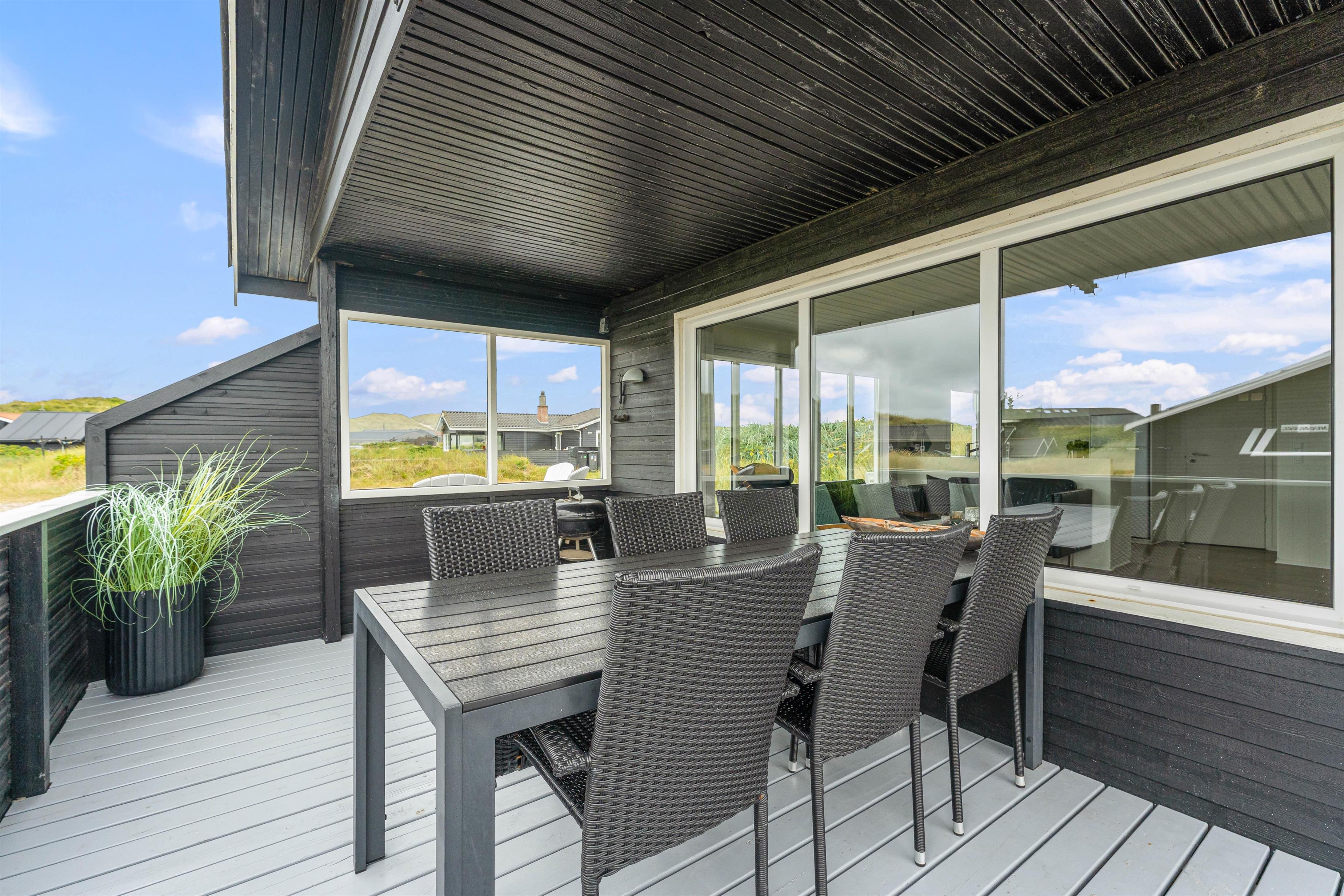 Den lukkede terrasse ved sommerhuset er ideel til småbørnsfamilier, eller hvis du har hund med. Her kan I slappe af i de komfortable liggestole eller hygge jer sammen i havemøblerne. Der er gode kroge, så I kan finde skygge eller læ, når I har brug for det. Med kun 200 meter til Vesterhavet, må I naturligvis også besøge den kilometerlange sandstrand og måske dyppe tæerne i det brusende Vesterhav.