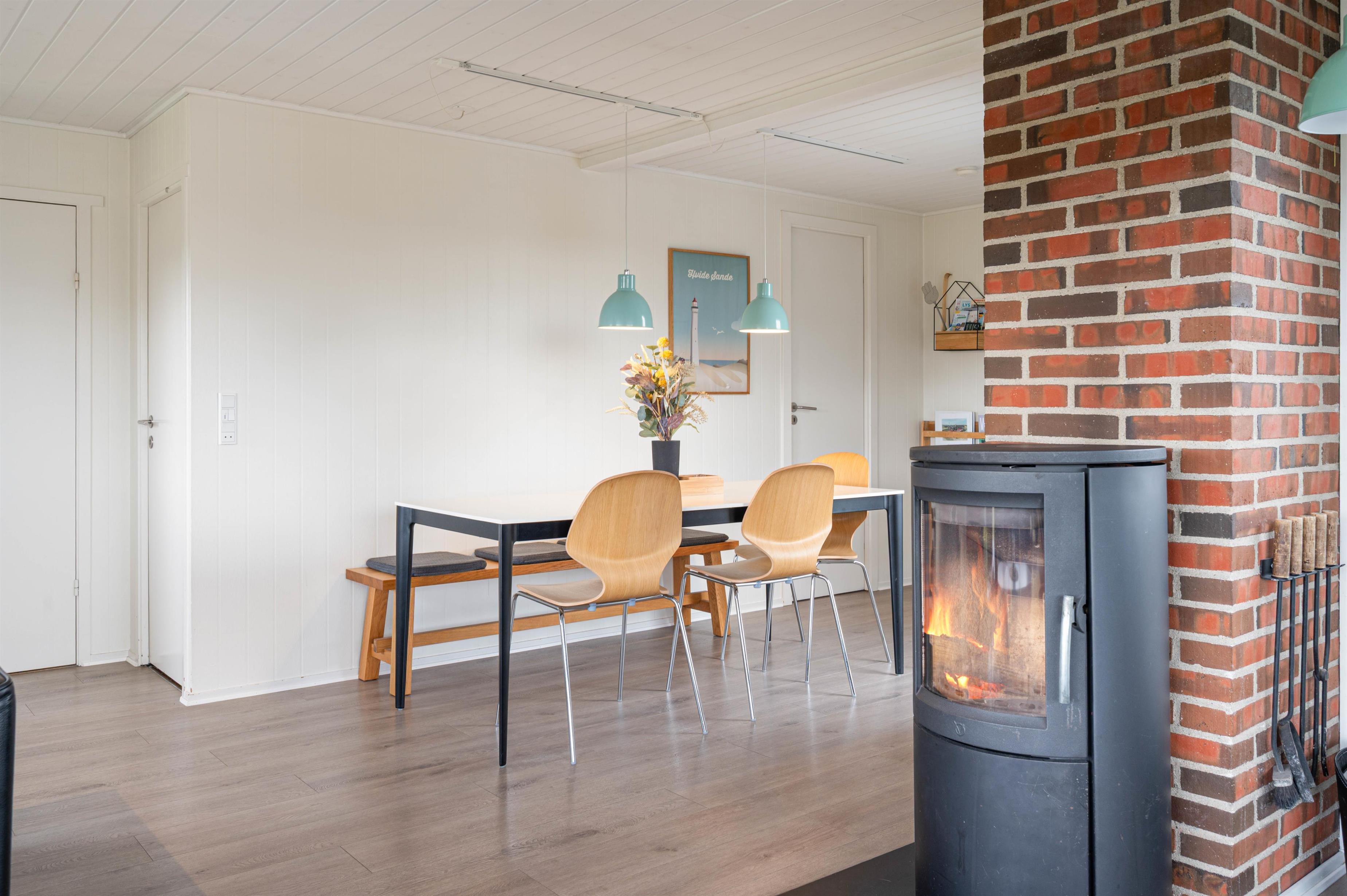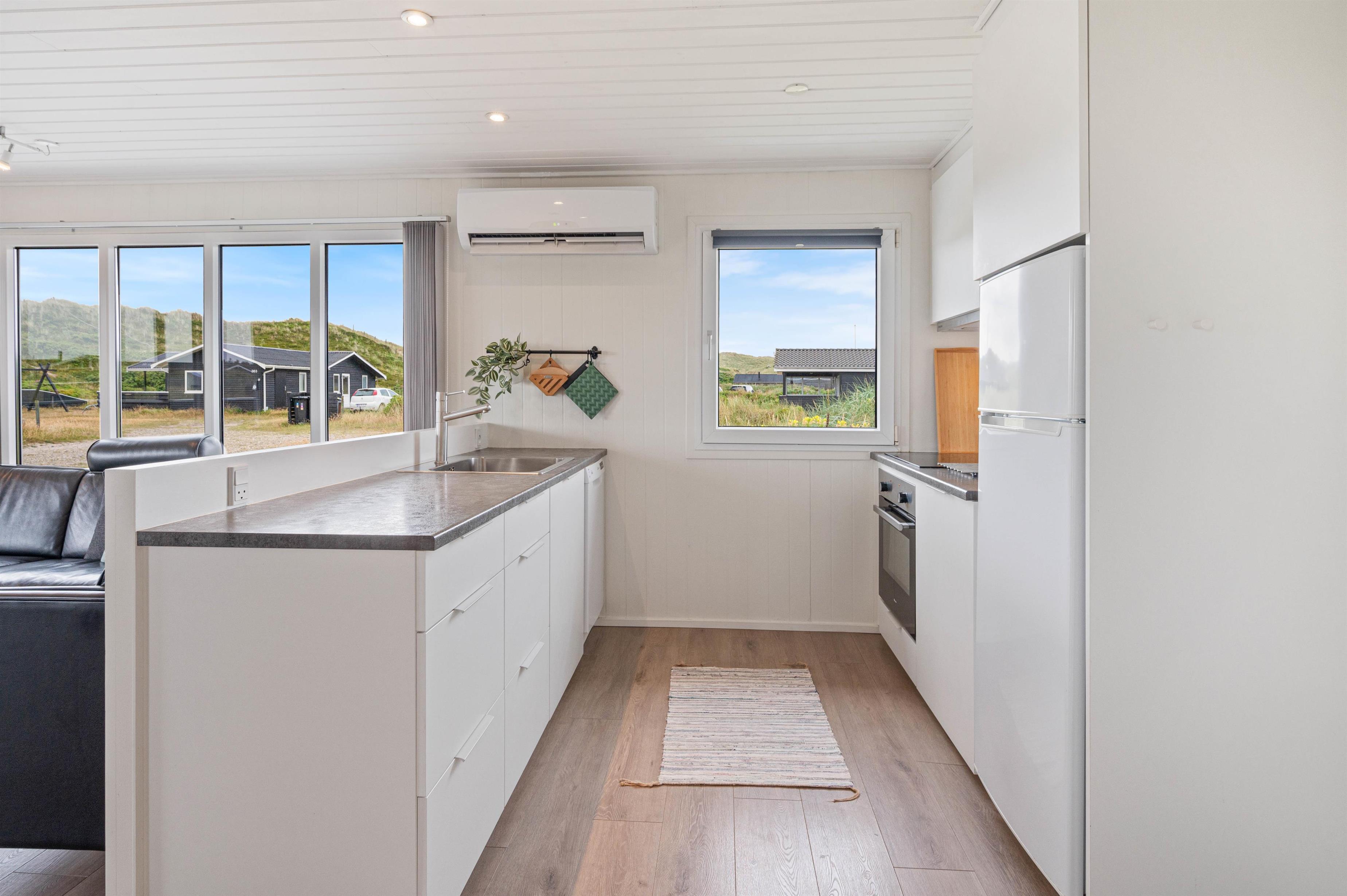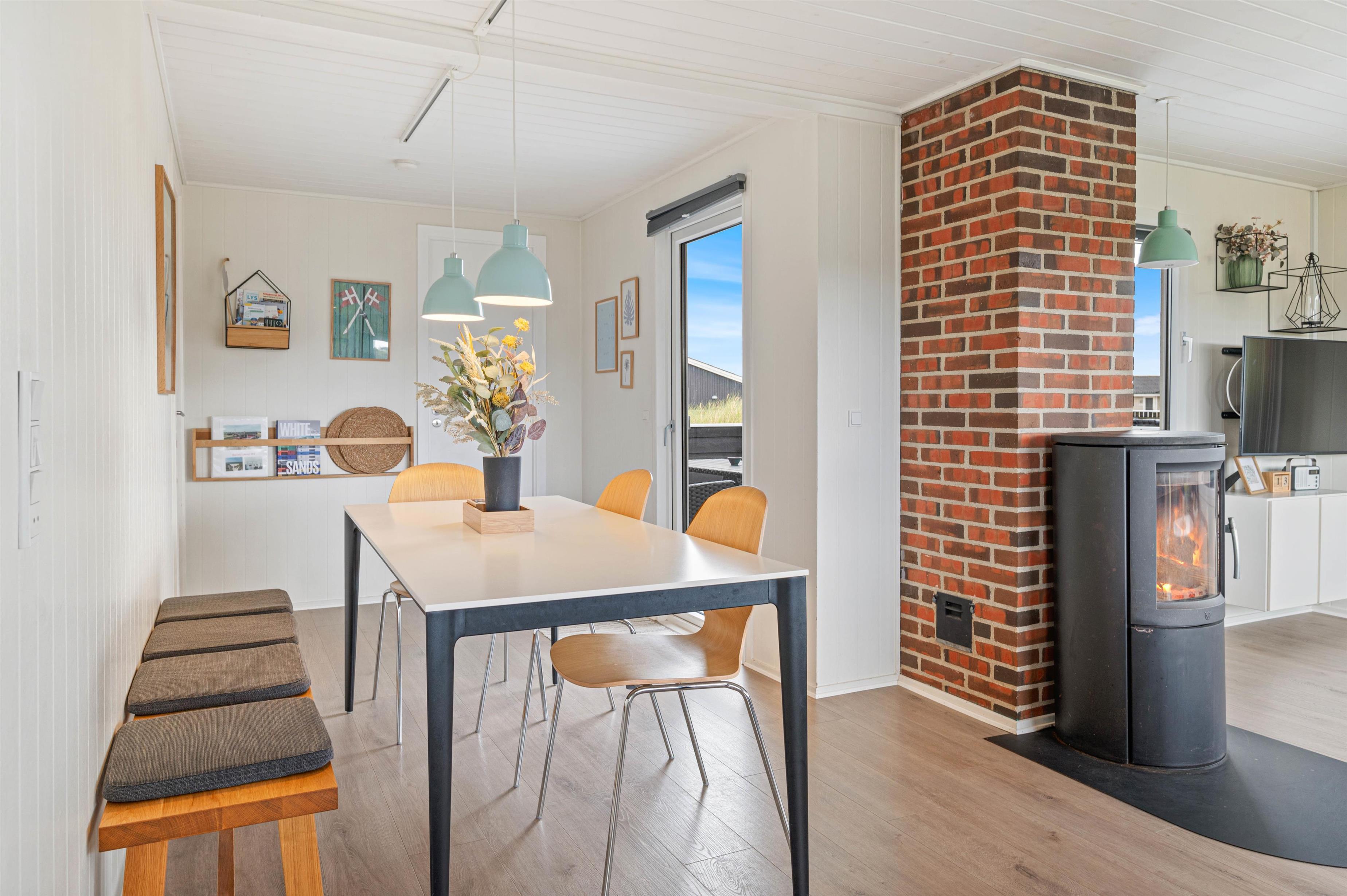 Sommerhuset på Bjerregårdsvej 365 er lyst og venligt indrettet, og feriestemningen toppes med brændeovn og sauna til de kølige dage. Den åbne planløsning giver plads til et praktisk køkken i forbindelse med en dejlig lys spiseplads og opholdsstue med sofagruppe og brændeovn. Her kan I se en film sammen eller trække jer tilbage med en god bog. I køkkenet er alt, hvad I behøver for at forkæle hinanden med lækre hjemmelavede måltider.