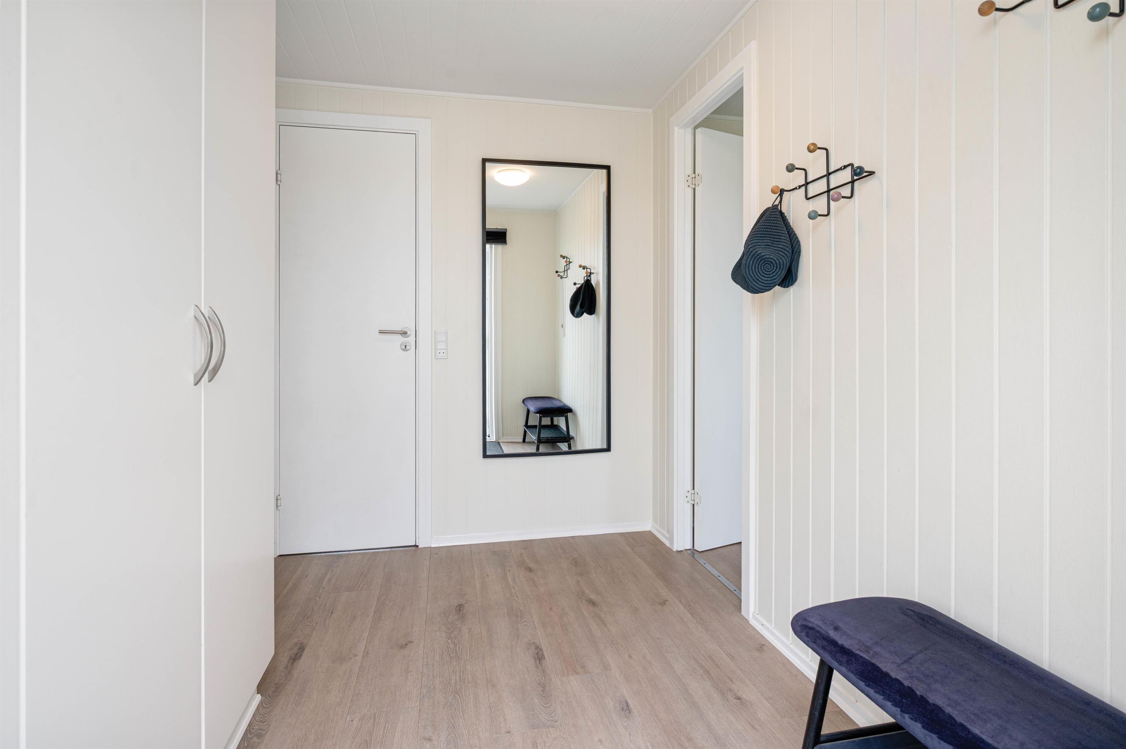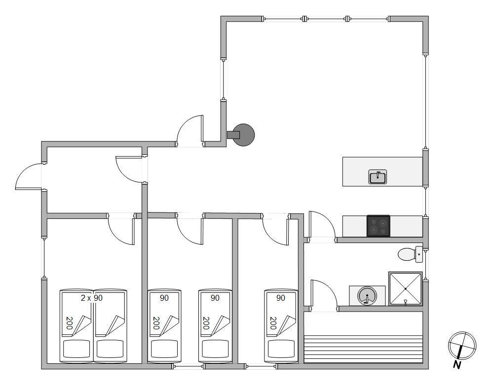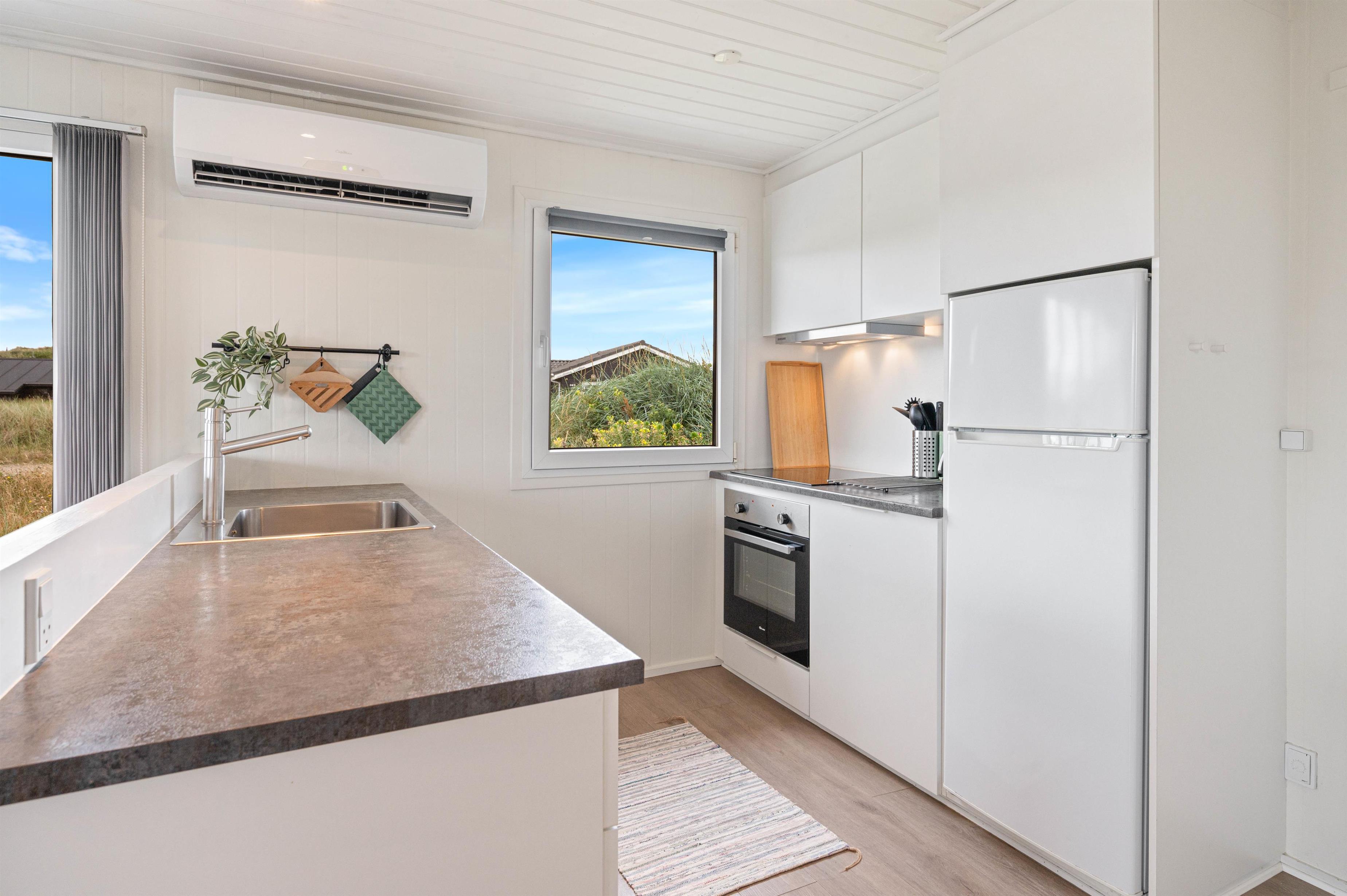 Sommerhuset på Bjerregårdsvej 365 er lyst og venligt indrettet, og feriestemningen toppes med brændeovn og sauna til de kølige dage. Den åbne planløsning giver plads til et praktisk køkken i forbindelse med en dejlig lys spiseplads og opholdsstue med sofagruppe og brændeovn. Her kan I se en film sammen eller trække jer tilbage med en god bog. I køkkenet er alt, hvad I behøver for at forkæle hinanden med lækre hjemmelavede måltider.