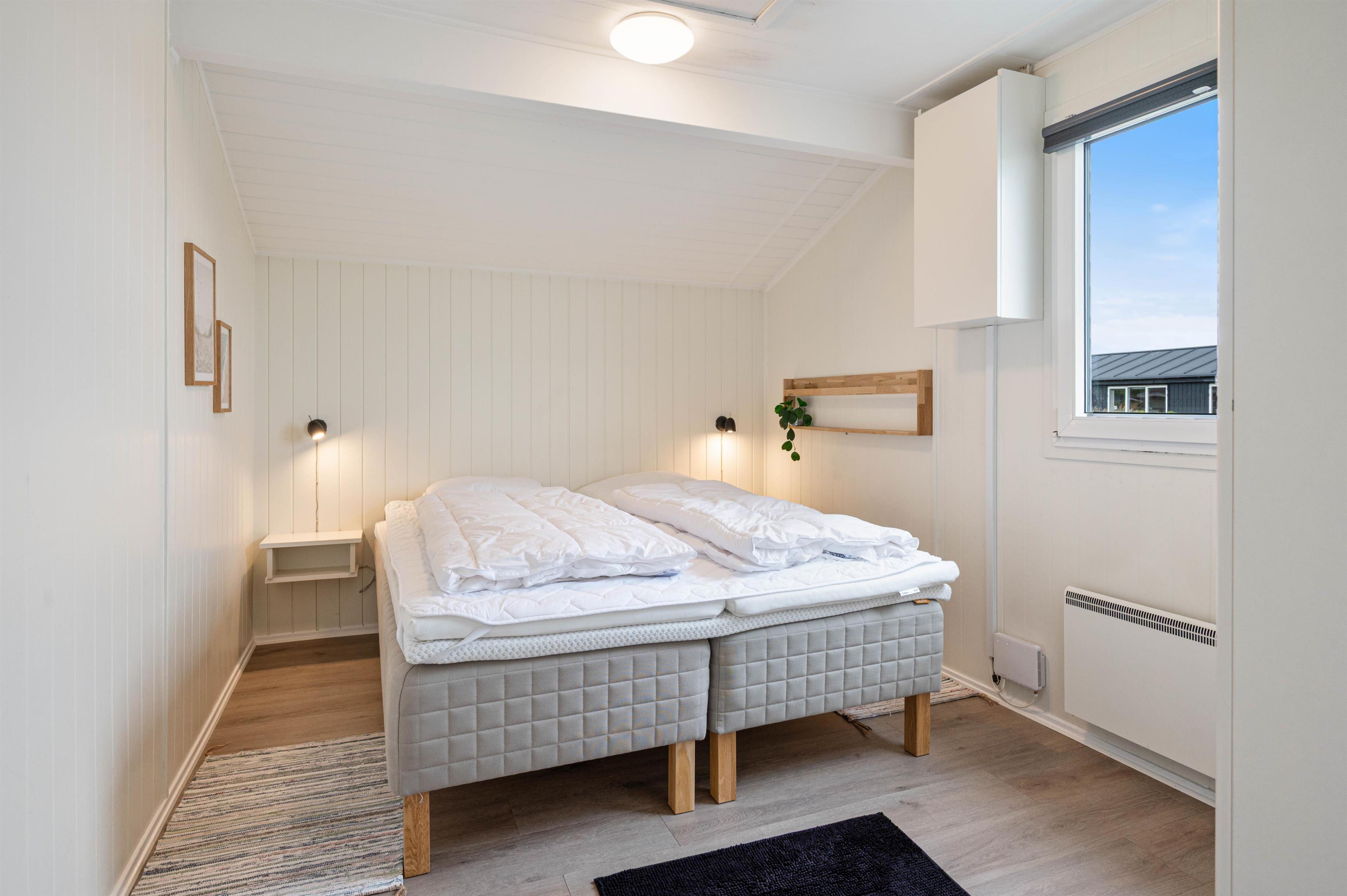 I forbindelse med badeværelset med gulvvarme er en sauna, som kan tilbyde en dejlig muskelafslappende varme før sengetid. I de 3 soveværelser er 5 sengepladser, hvor I kan hvile ud i de komfortable senge og nyde en afslappende nattesøvn i den friske vesterhavsluft. I feriehuset er en energibesparende varmepumpe til rådighed.