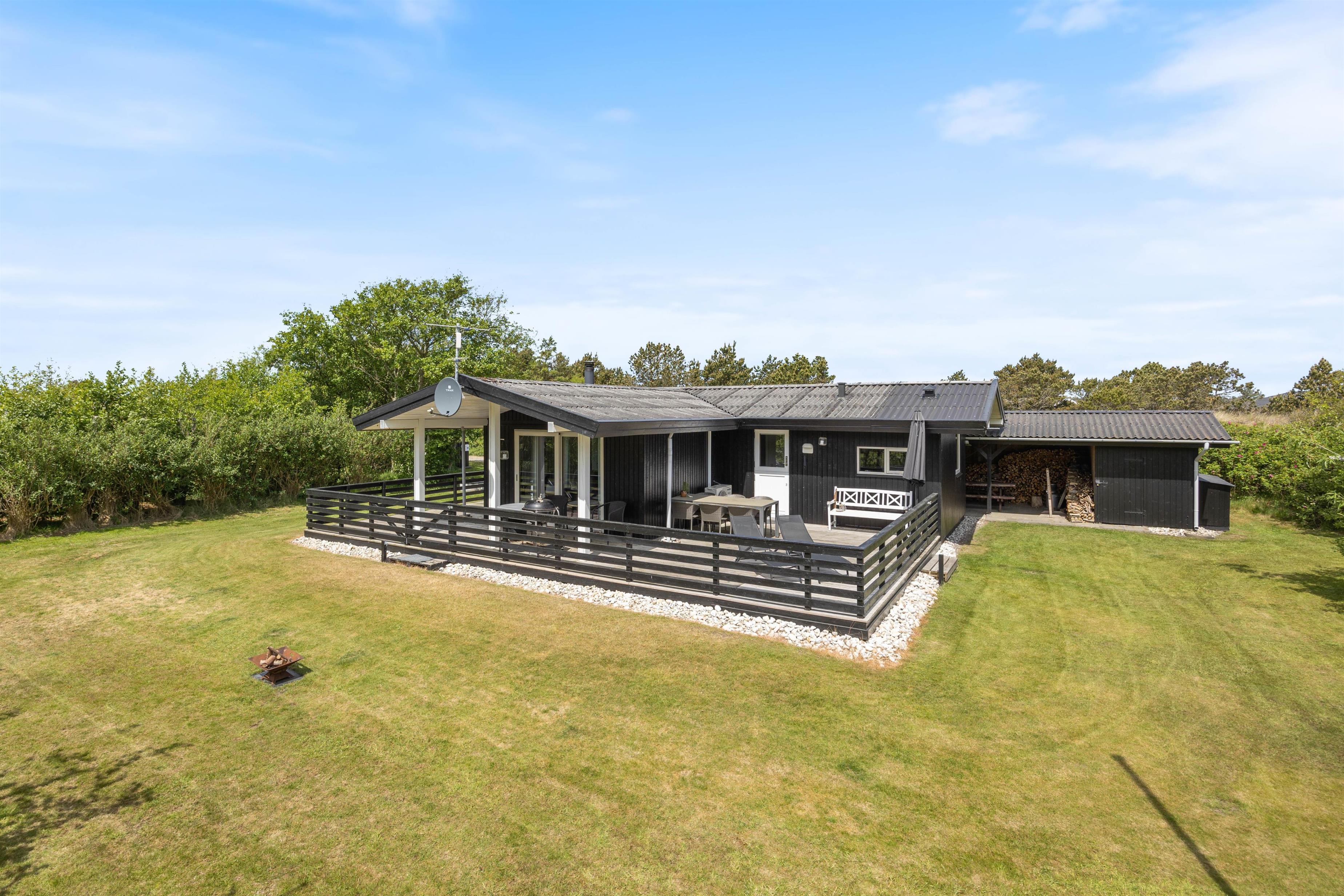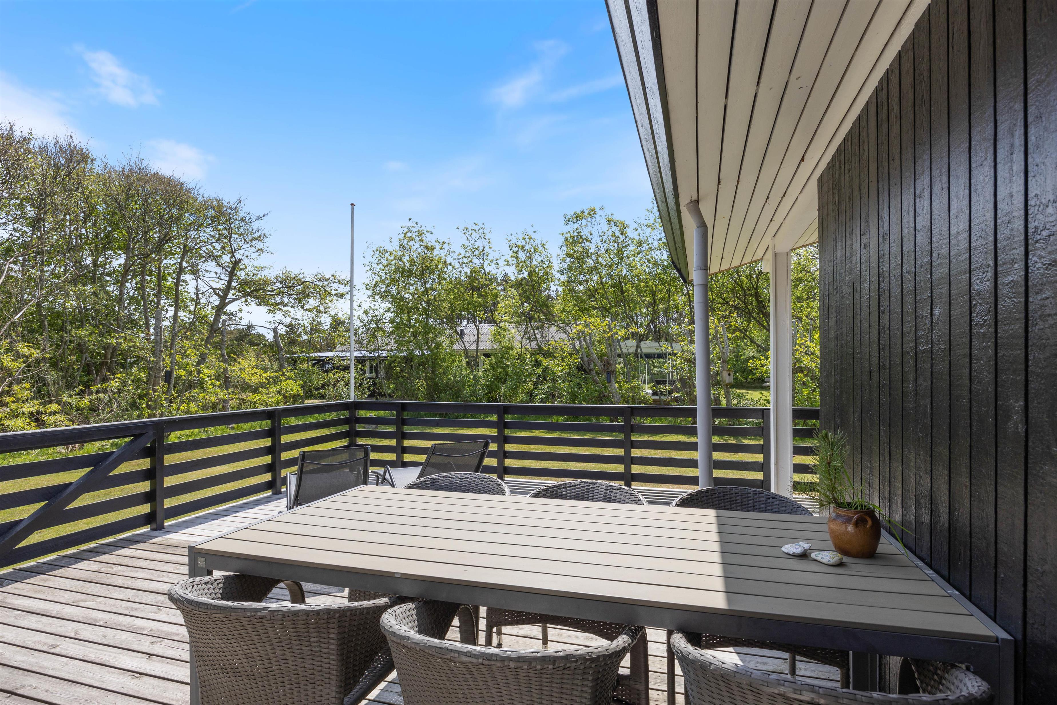 Feriehuset har en lukket, rigtig dejlig og flot terrasse, der ligger både øst, syd og vest for feriehuset. Herfra kan I nyde solen fra morgen til aften. Og I kan let finde læ, hvis sommerbrisen bliver for kølig, eller søge ly under halvtaget, hvis der skulle komme lidt sommerregn. Og der er selvfølgelig havemøbler og en grill på terrassen, så I kan sidde ude og nyde måltiderne i det fri.