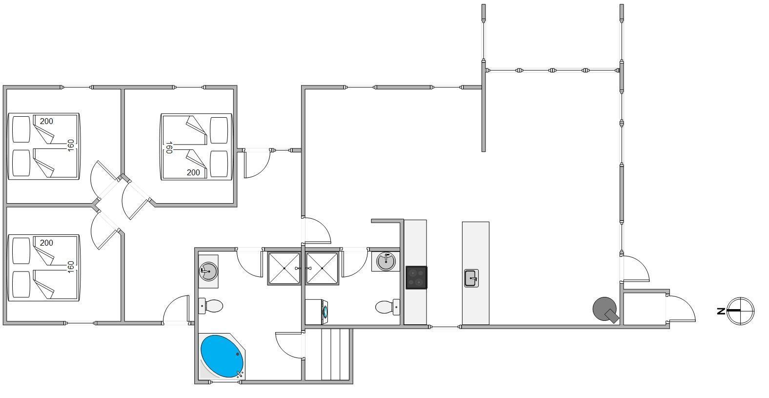 I sommerhuset er der hele to badeværelser, der begge er med bruseniche og gulvvarme. I det store badeværelse er der både et lækkert spabad samt adgang til sauna, mens det mindre badeværelse er udstyret med en kombineret vaskemaskine/tørretumbler. De 6 sovepladser er fordelt på 3 soveværelser – alle har hver én dobbeltseng, gulvtæpper og skuffer til opbevaring.
