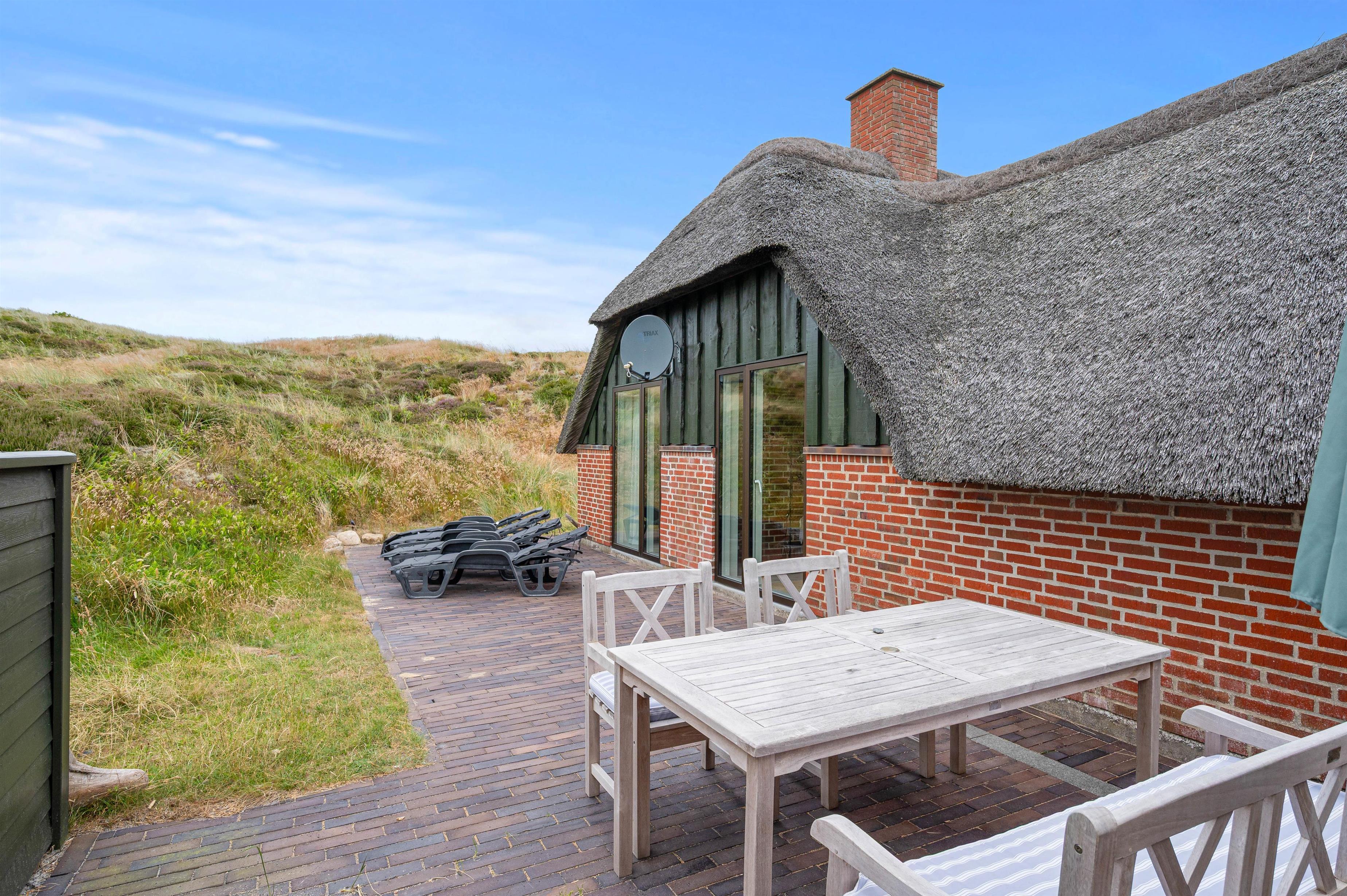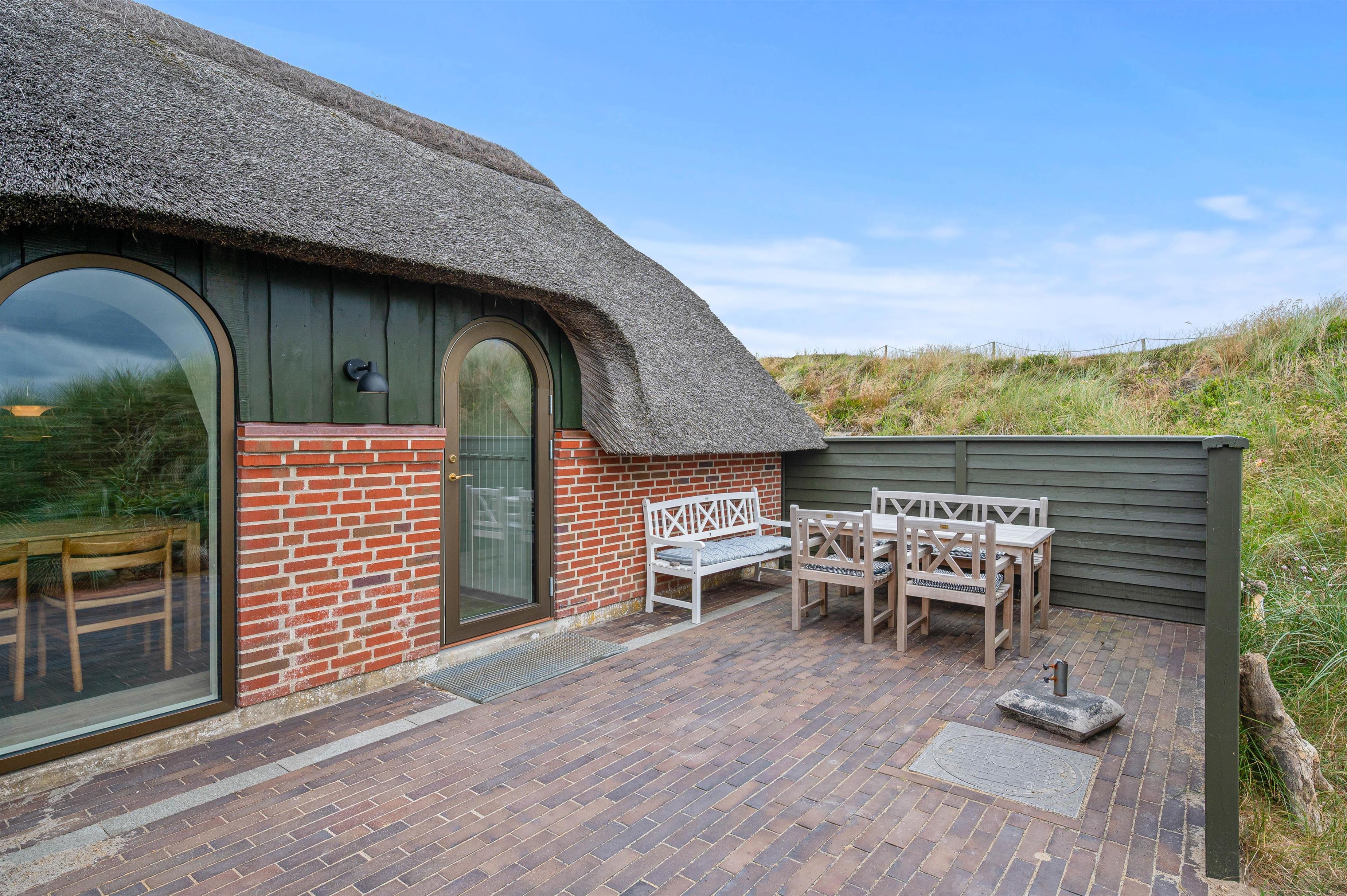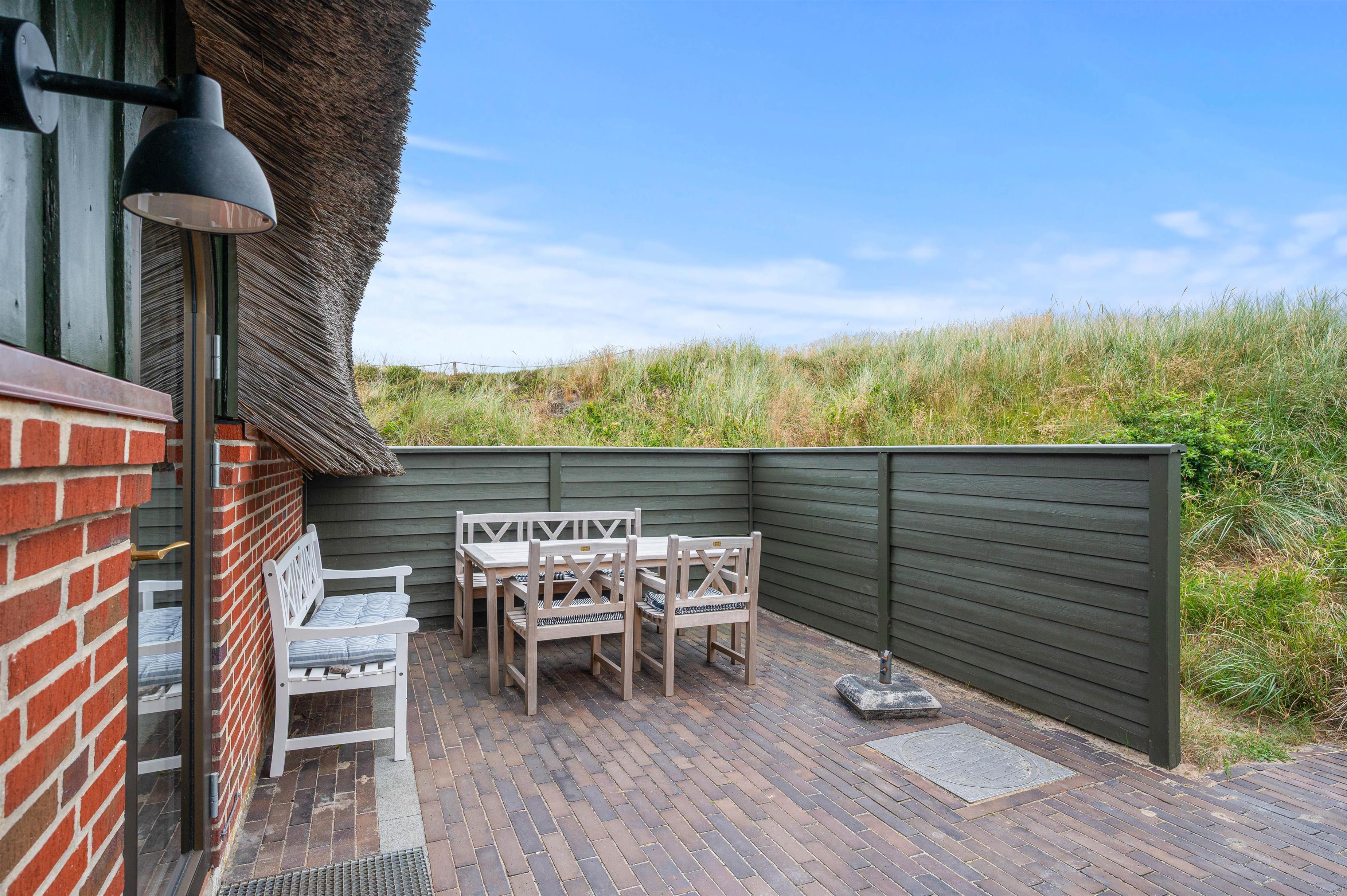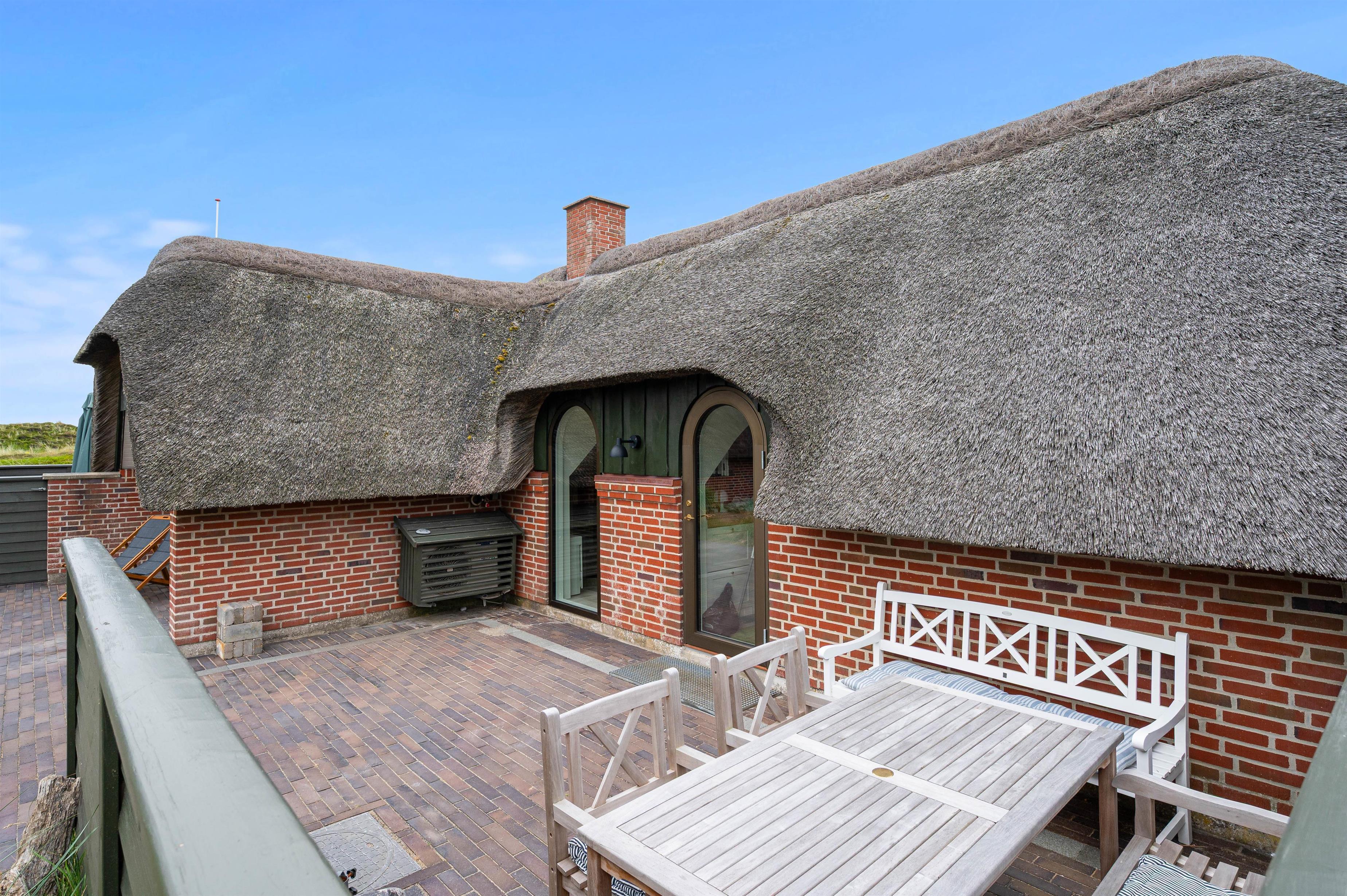 På den åbne og delvist afskærmede terrasse kan I slappe af i den friske havluft og nyde lyden af havets bølger – stranden ligger blot 400 meter fra feriehuset.