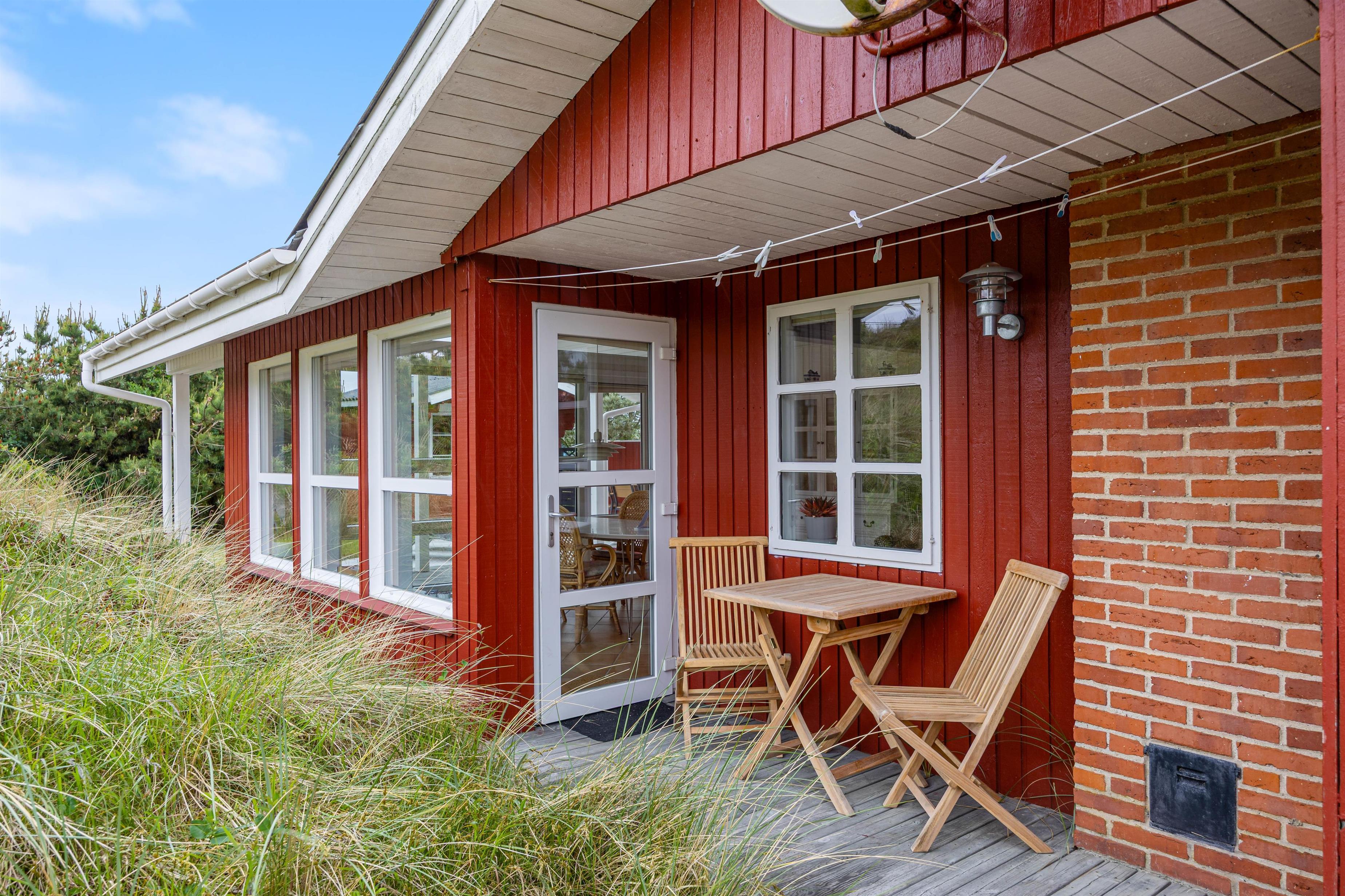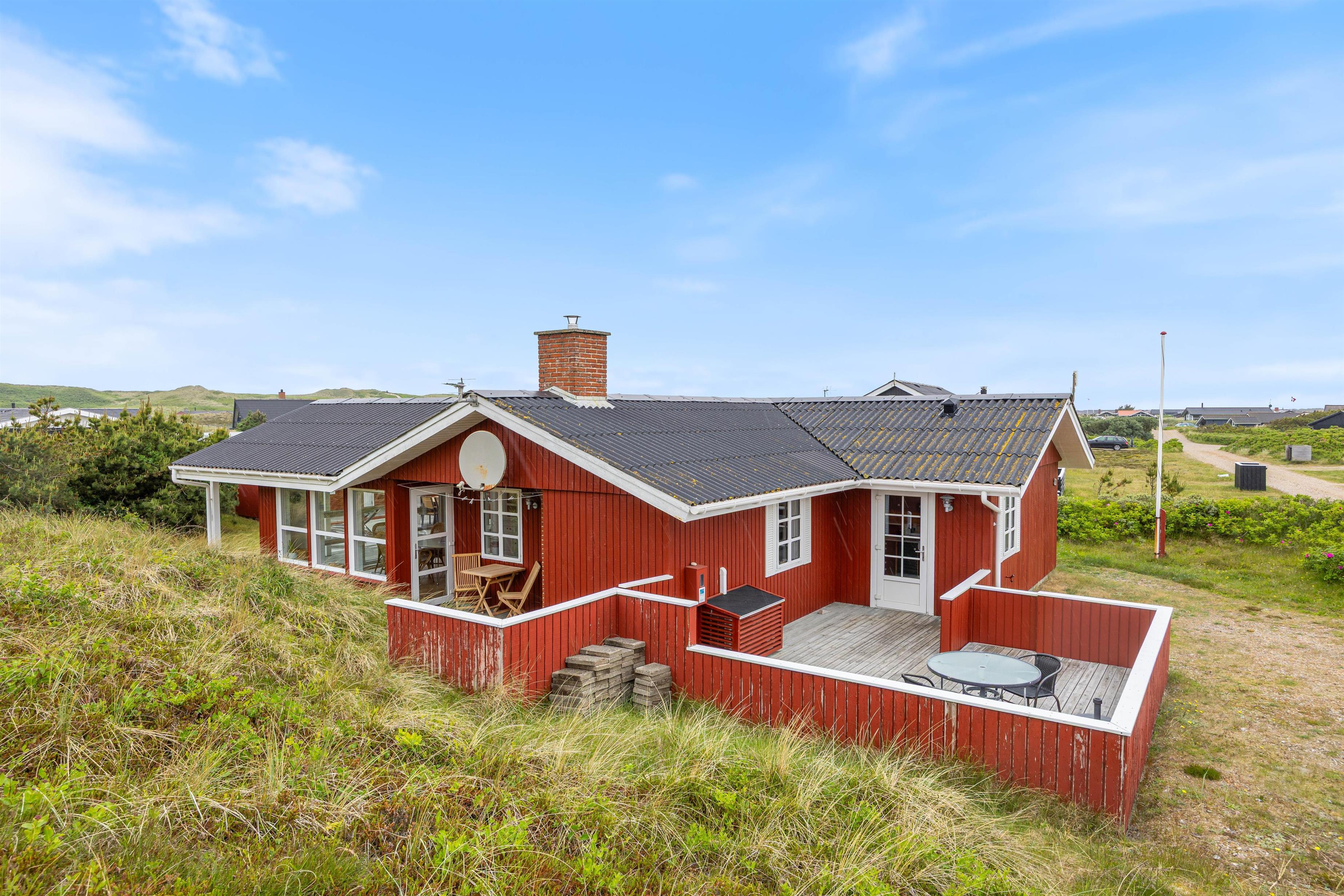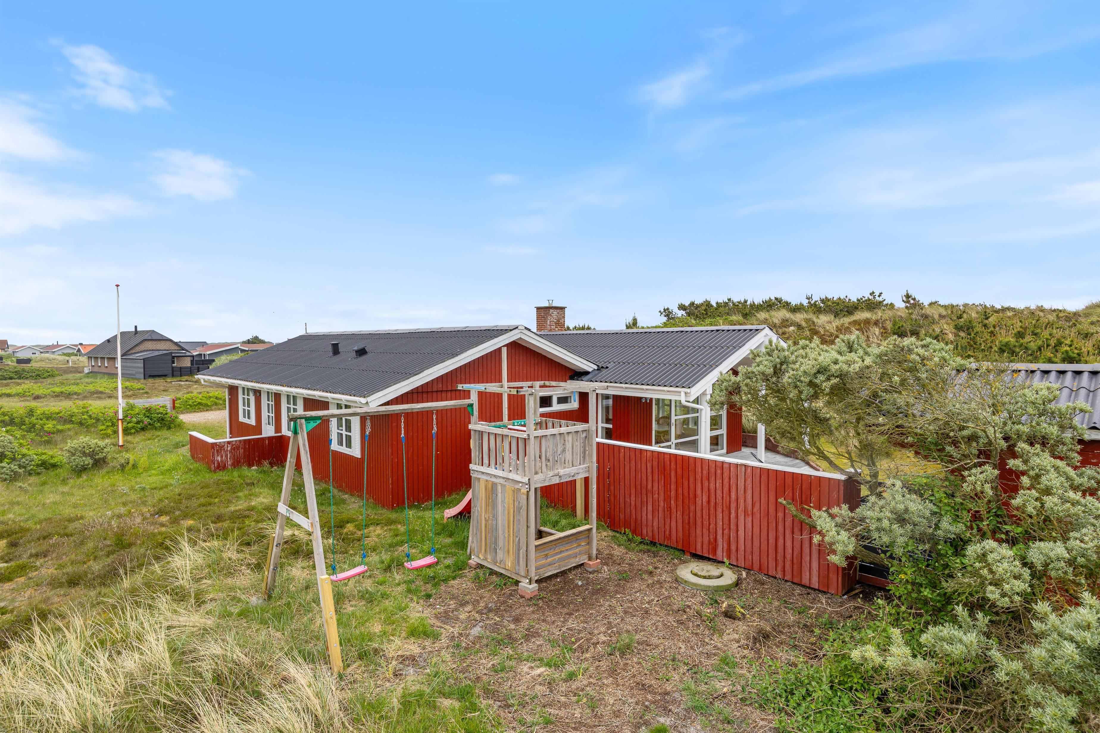 Det hyggelige, røde sommerhus ligger blot 300 meter fra den kilometerlange sandstrand ved Vesterhavet, som hele året rundt er et besøg værd.