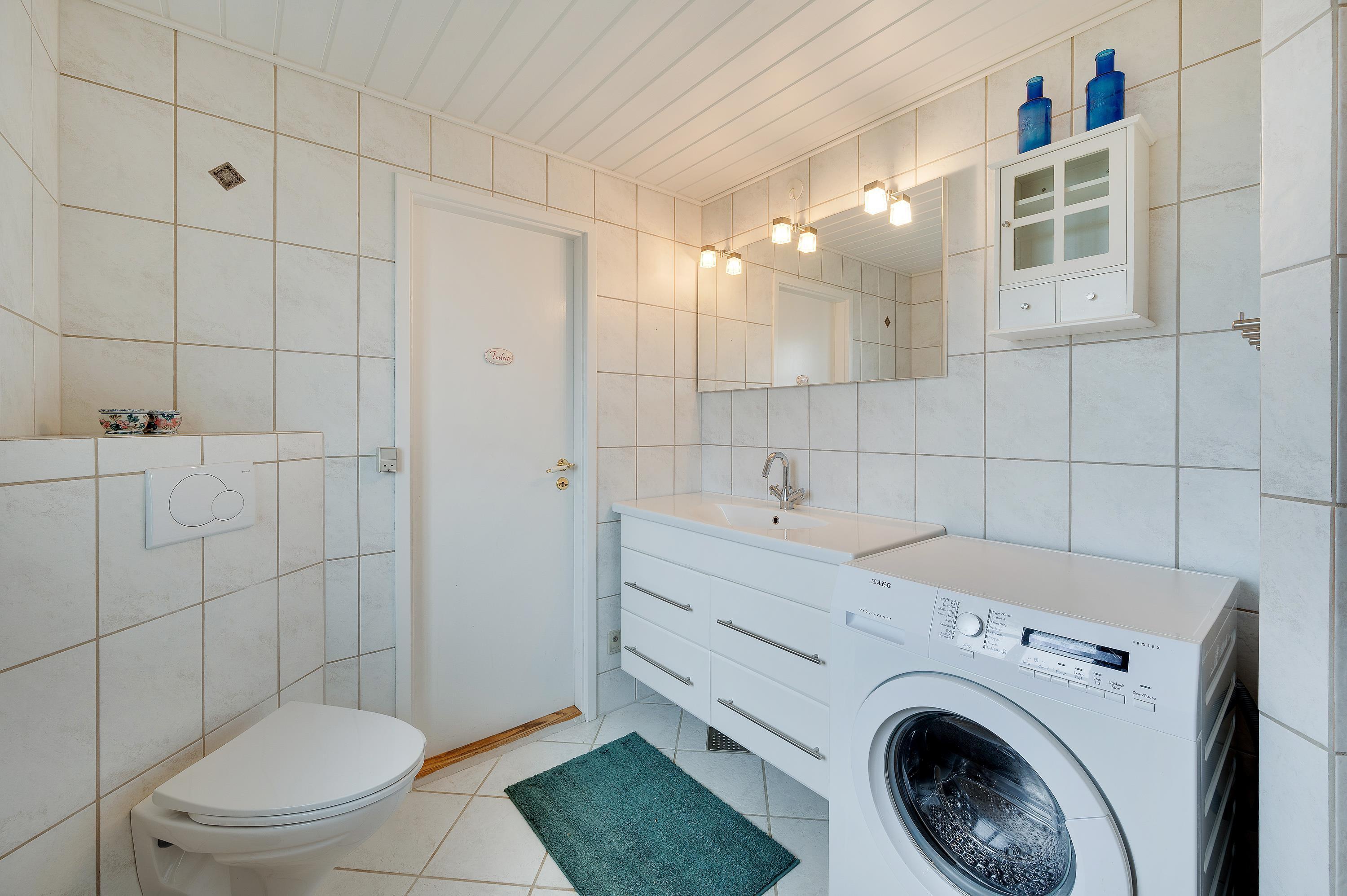 På badeværelset er der gulvvarme, og der kan også vaskes tøj i vaskemaskinen.