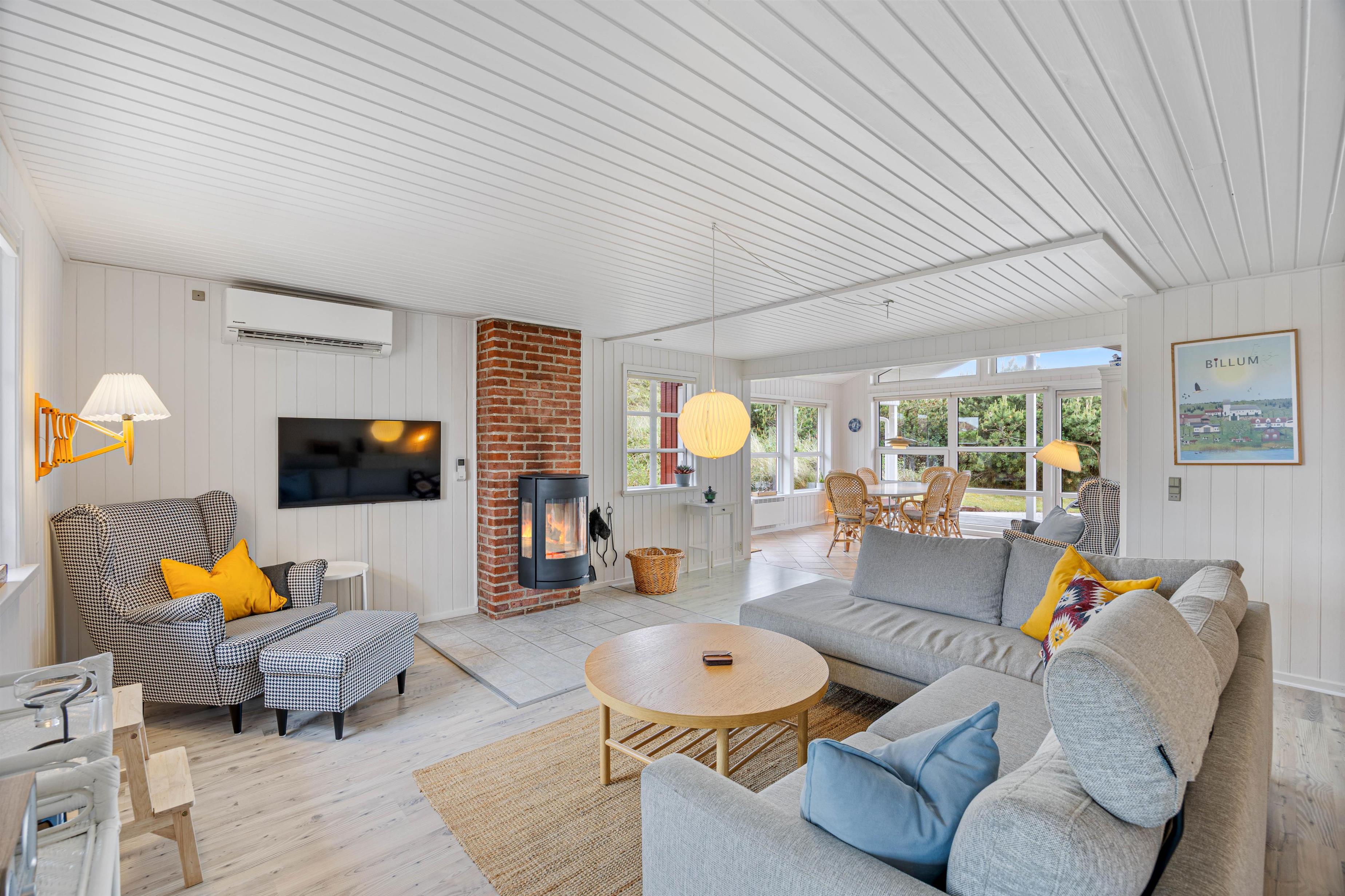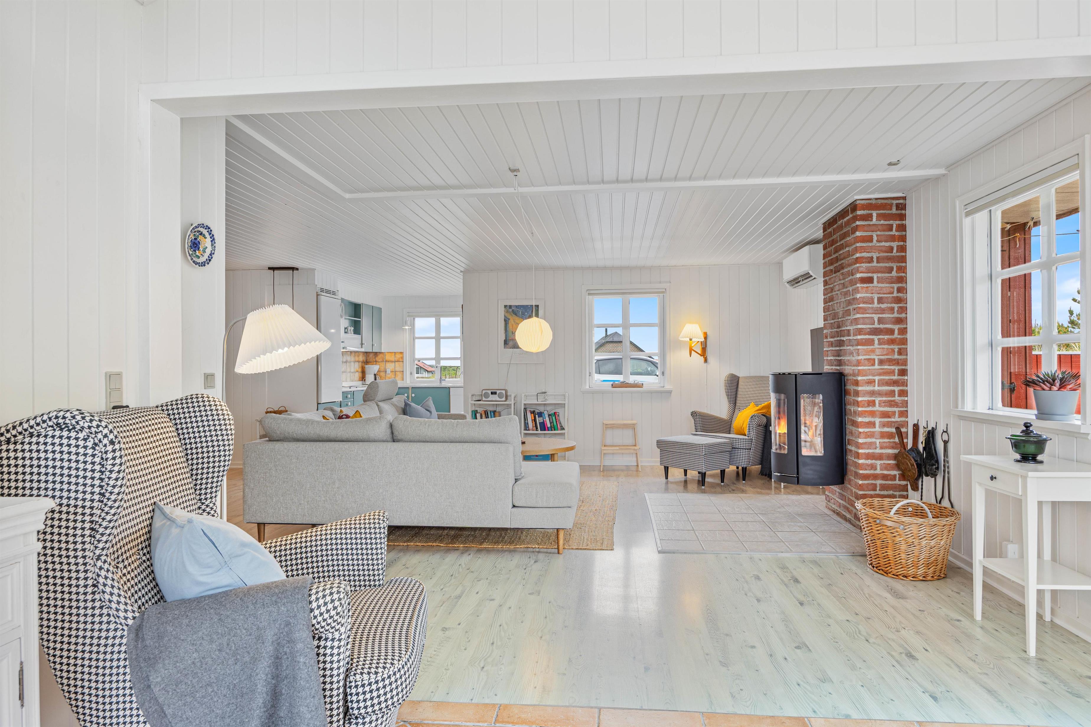En kølig sommeraften kan nydes i sofahjørnet, hvor I kan streame film via. chromecasten og mærke varmen fra den knitrende brændeovn. Her er også en varmepumpe, som med fordel kan bruges til at holde temperaturen behagelig.