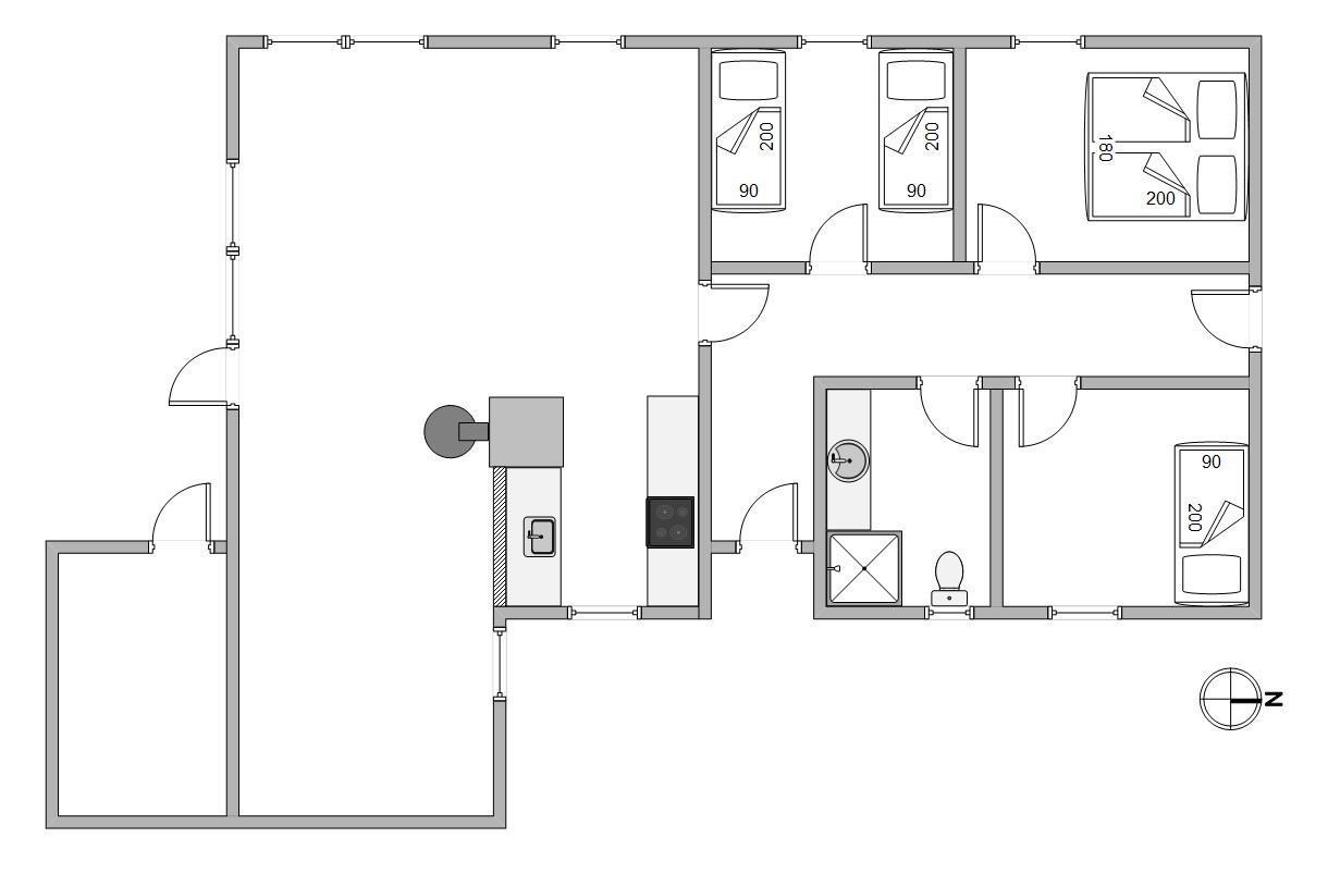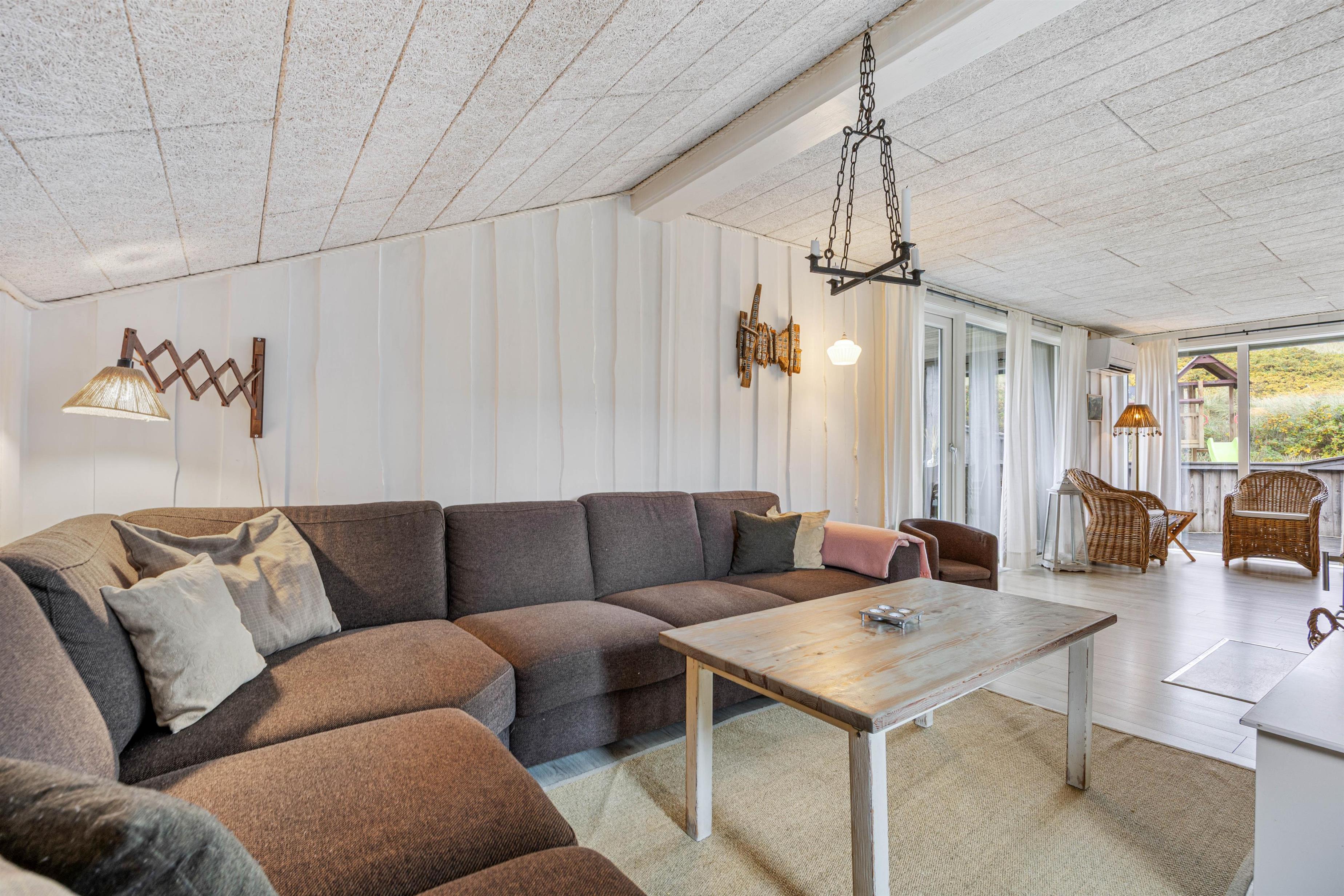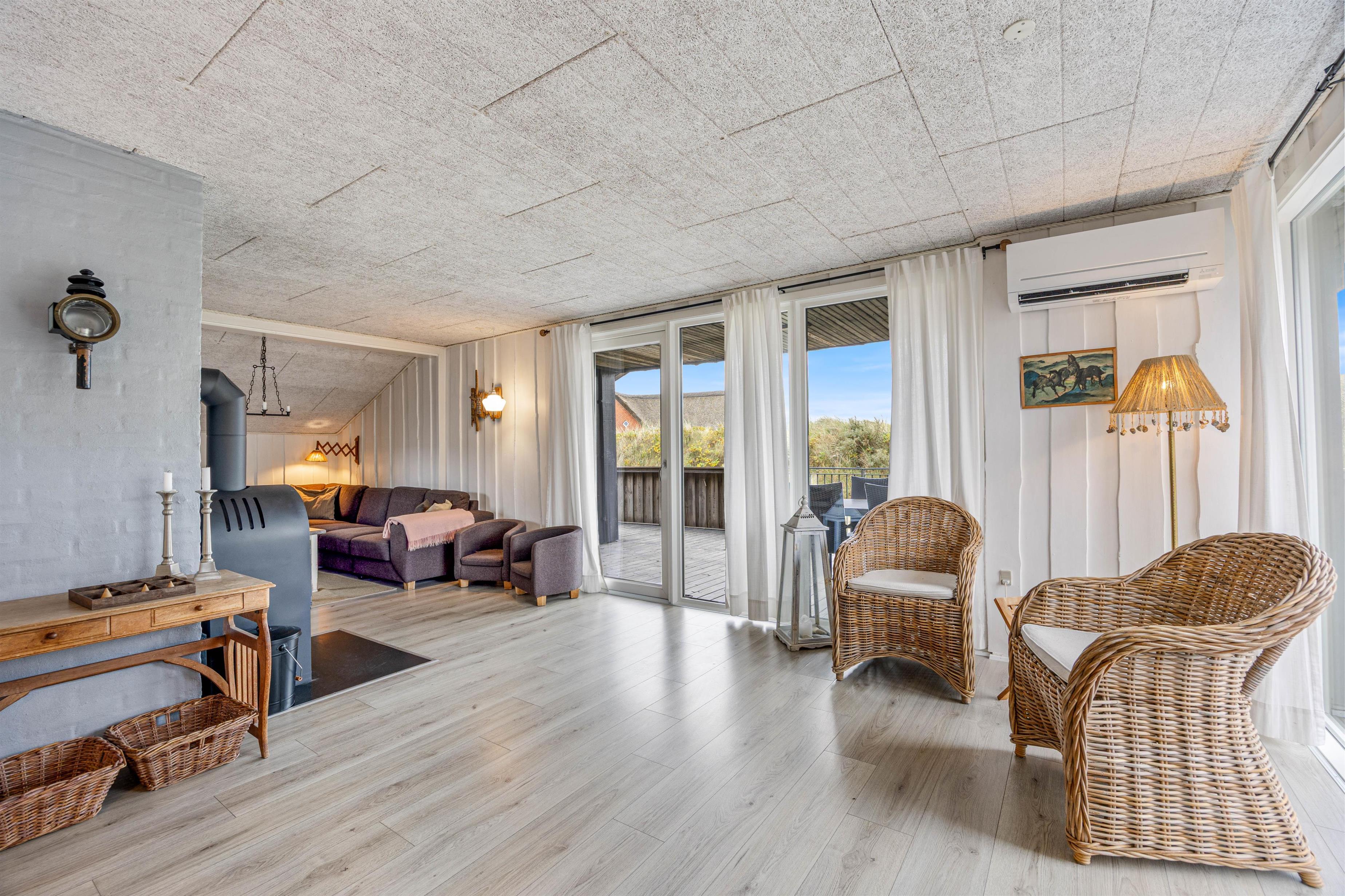 På en blæsende efterårsdag kan I slappe af på sofaen, mens brændeovnen knitrer i baggrunden. Fra stuen er der udgang til den lukkede terrasse, der er ca. 100 m2 og går rundt om feriehuset fra øst mod vest. Herfra kan du nyde solen hele dagen. På terrassen finder du havemøbler, liggestole og grill.