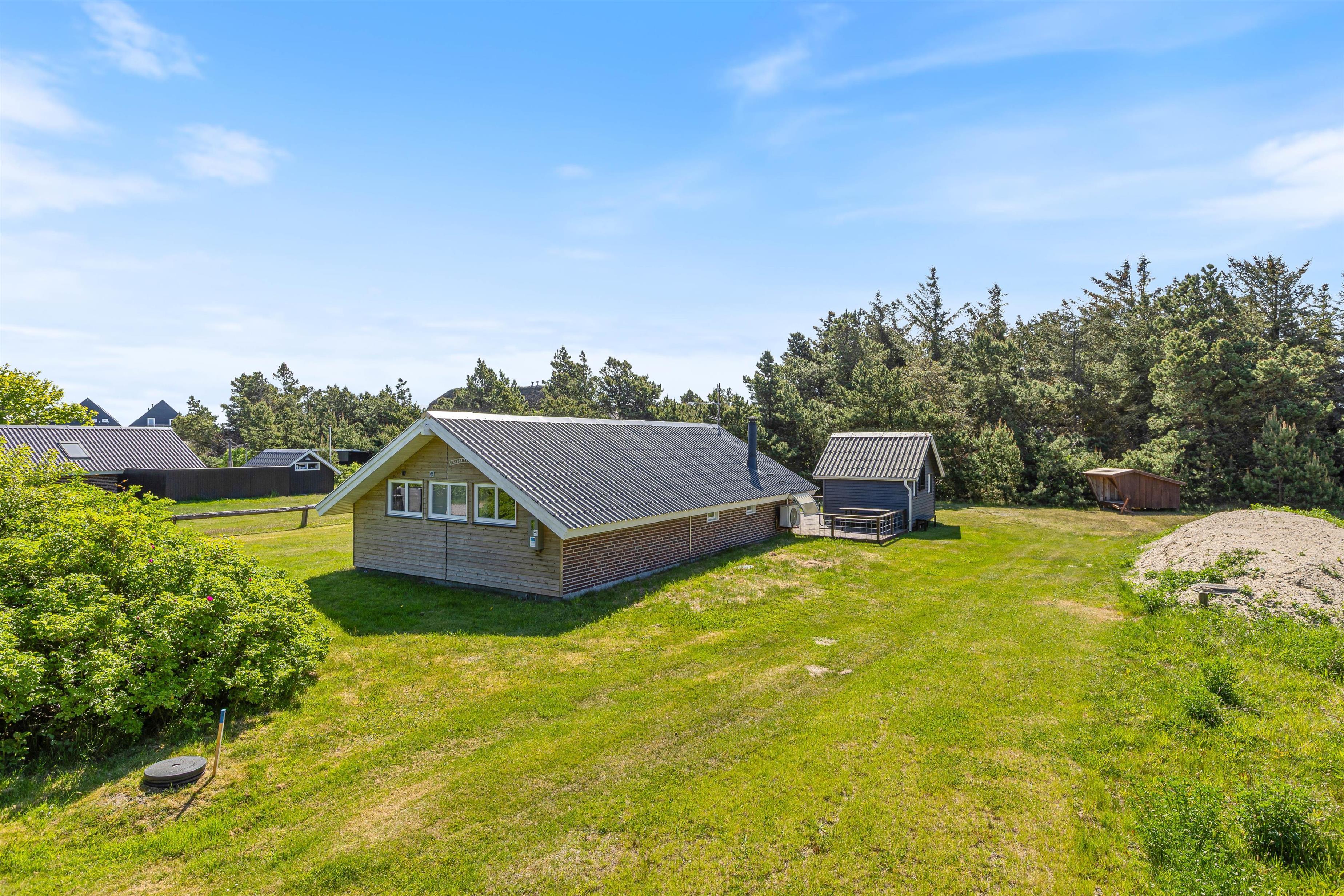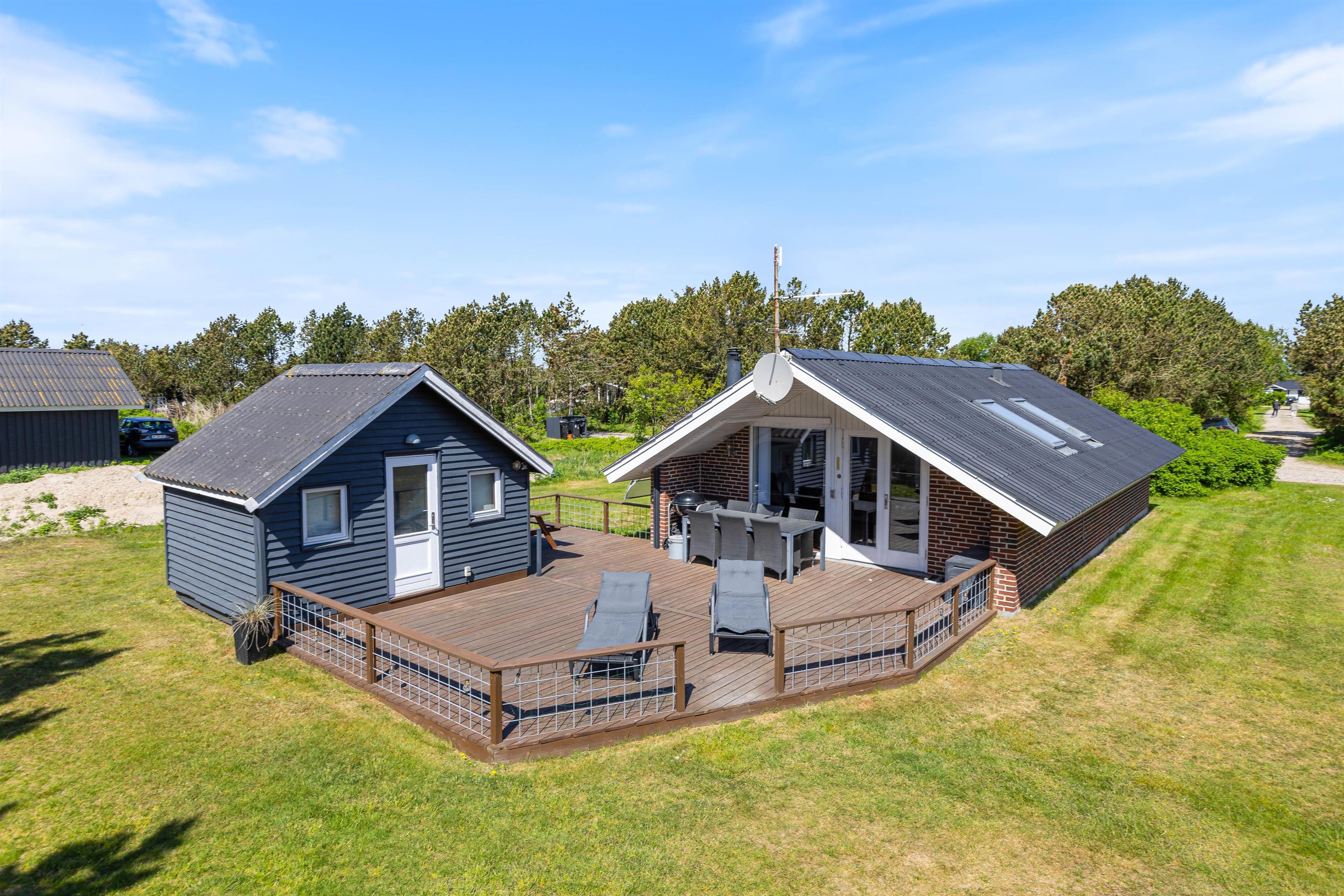 Her i det populære ferieområde Bjerregård har I mange muligheder for en afslappende ferie med hele familien, tæt på naturen. Både Vesterhavet og Ringkøbing Fjord ligger kun en lille spadseretur på ca. 10 min væk – og I finder en lille legeplads og købmanden kun 400 meter fra huset.