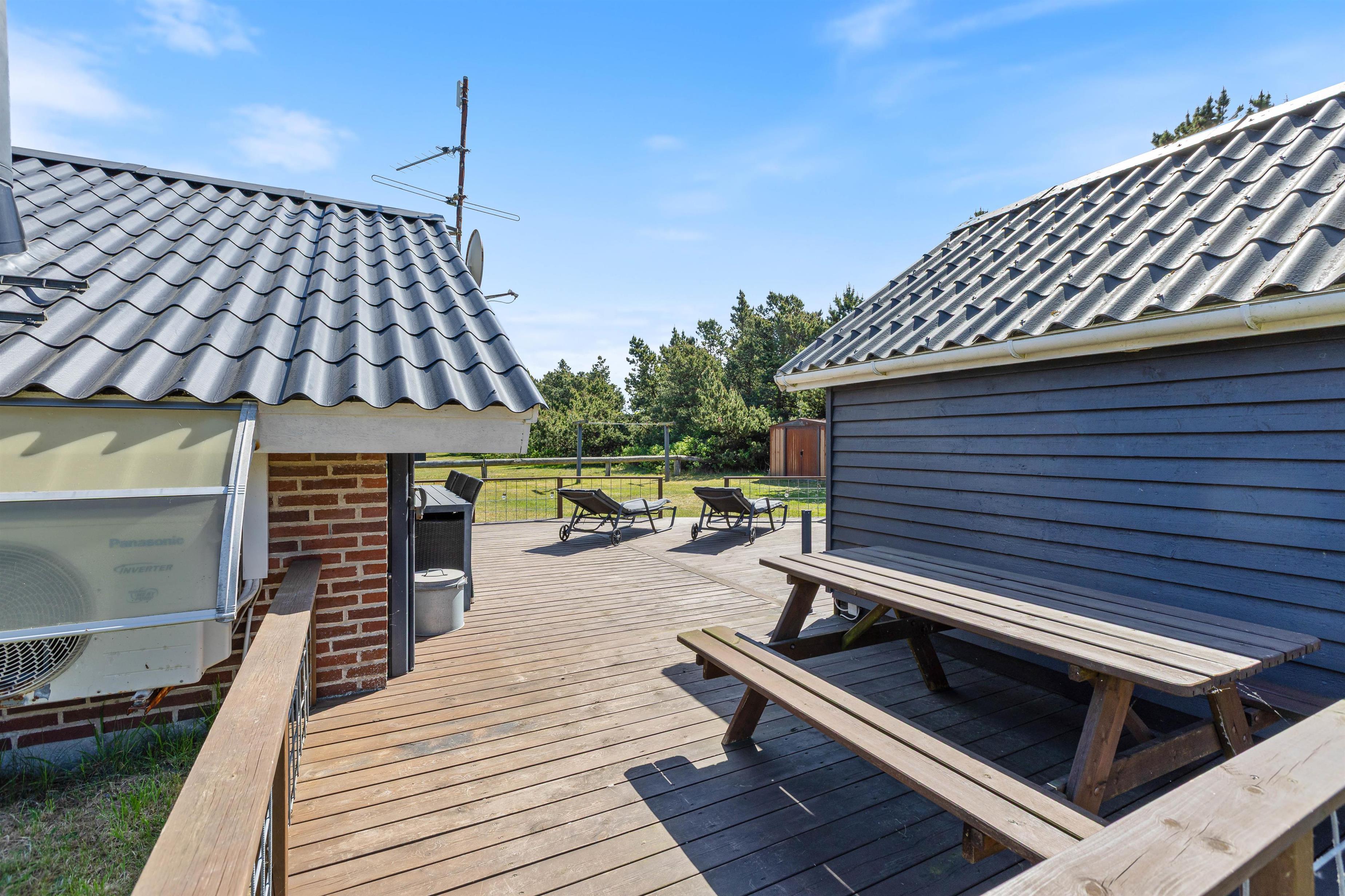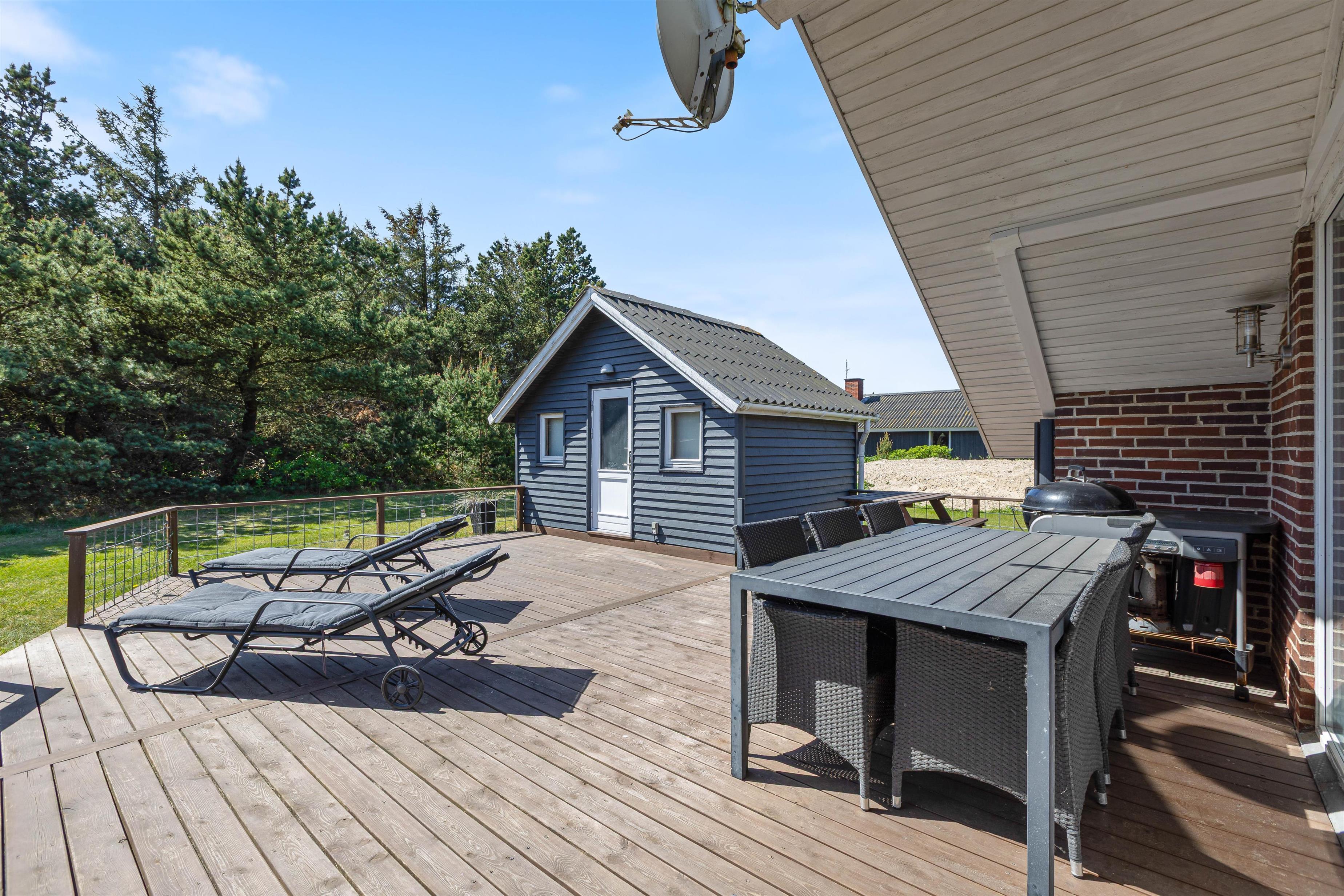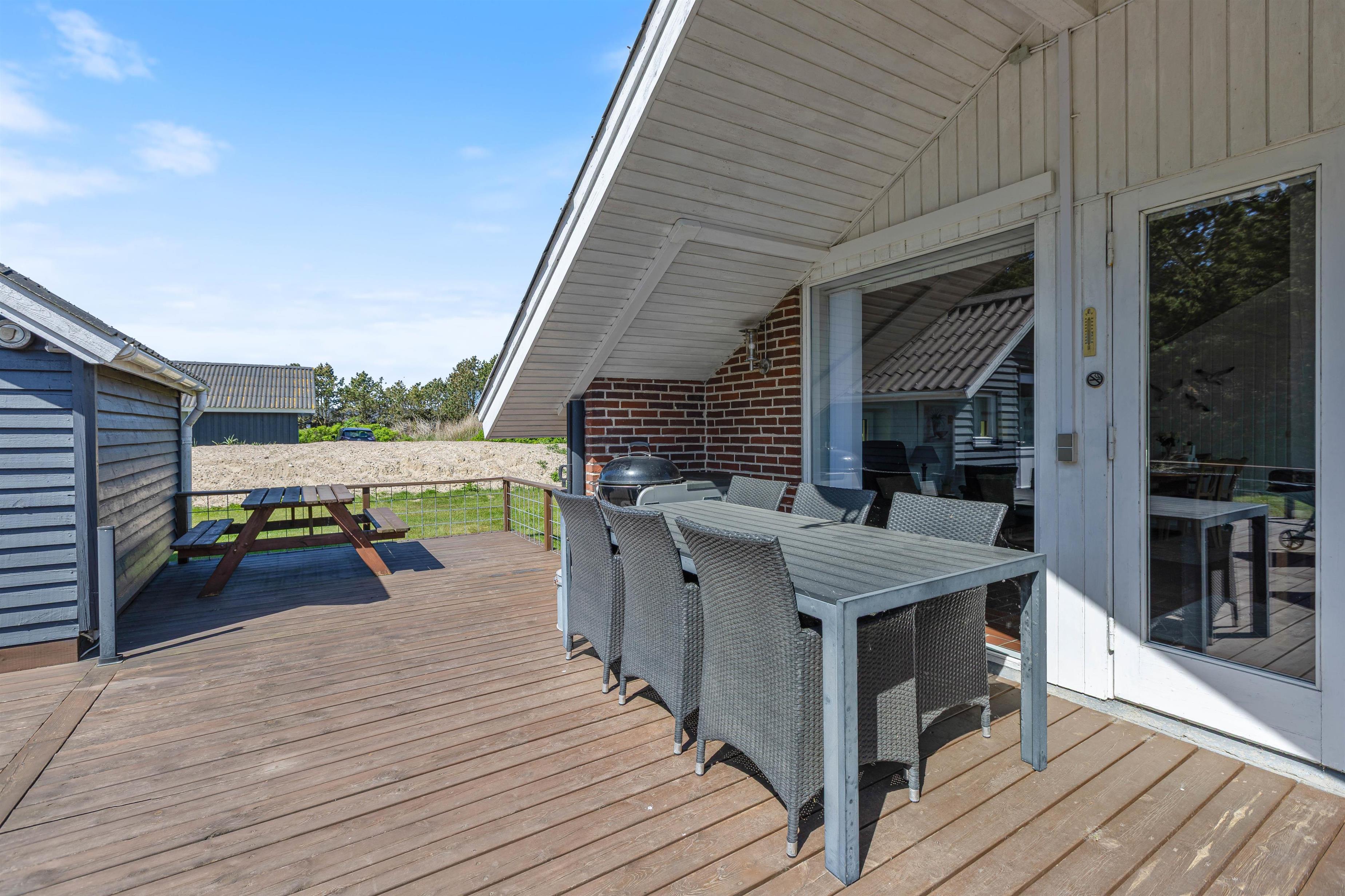 En hyggelig og lukket terrasse gør det afslappende at lade børn og familiens firbenede ven lege ude, alt imens man nyder eftermiddagssolen, - og manden i huset tænder grillen. En veltilberedt grillmiddag på terrassen – og med solnedgangen og havets beroligende brusen i baggrunden er balsam for krop og sjæl.