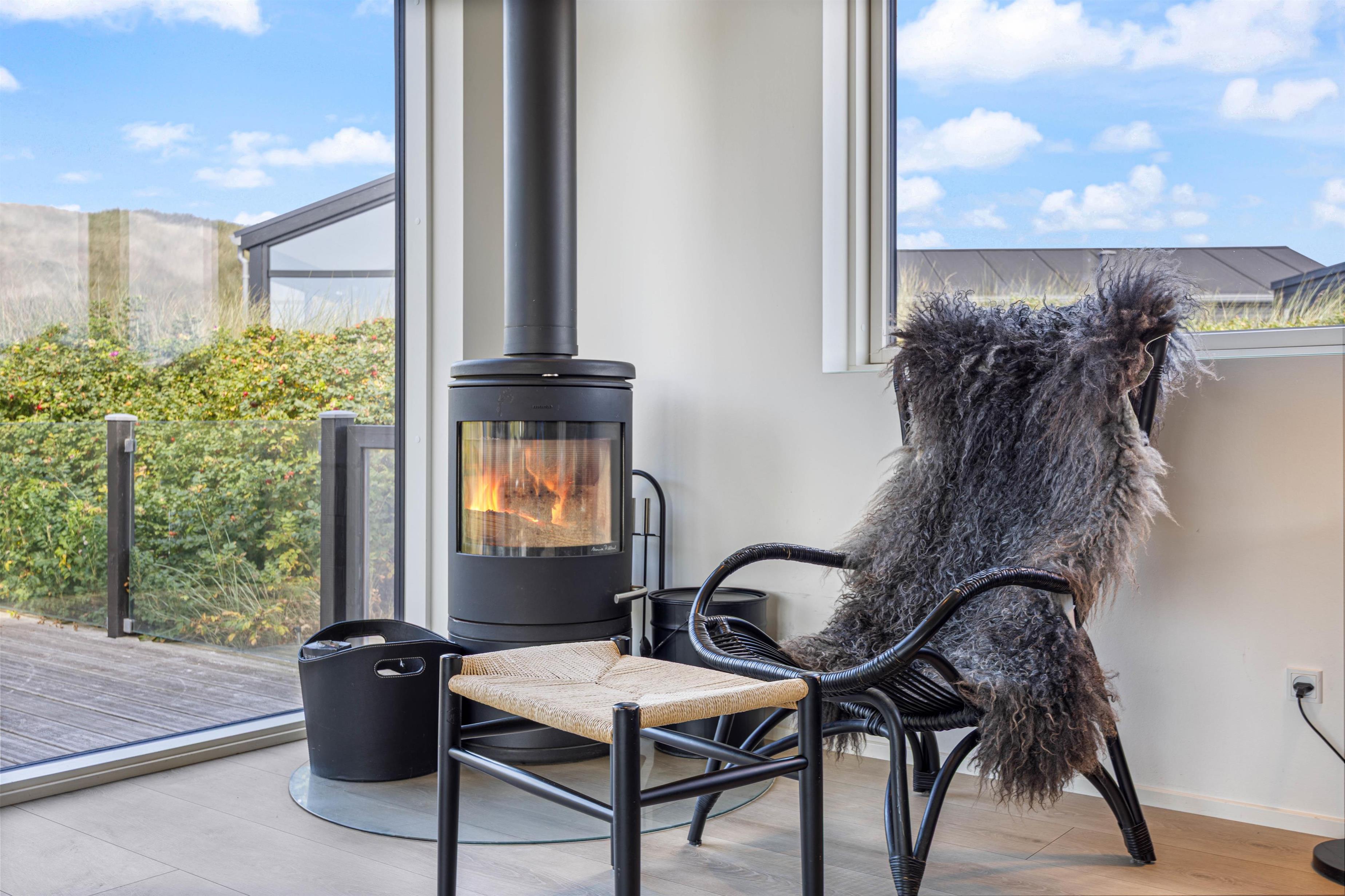De store vinduer inviterer solens lys og den vestjyske natur indenfor, og gør de flotte omgivelser endnu mere indbydende. Især i det store opholdsrum, hvor stue og køkken er slået sammen, er der rigtig lyst og åbent. Her står også den klassiske brændeovn, som med sine knitrende flammer gør de mørke aftentimer og regnfulde efterårsdage endnu hyggeligere.